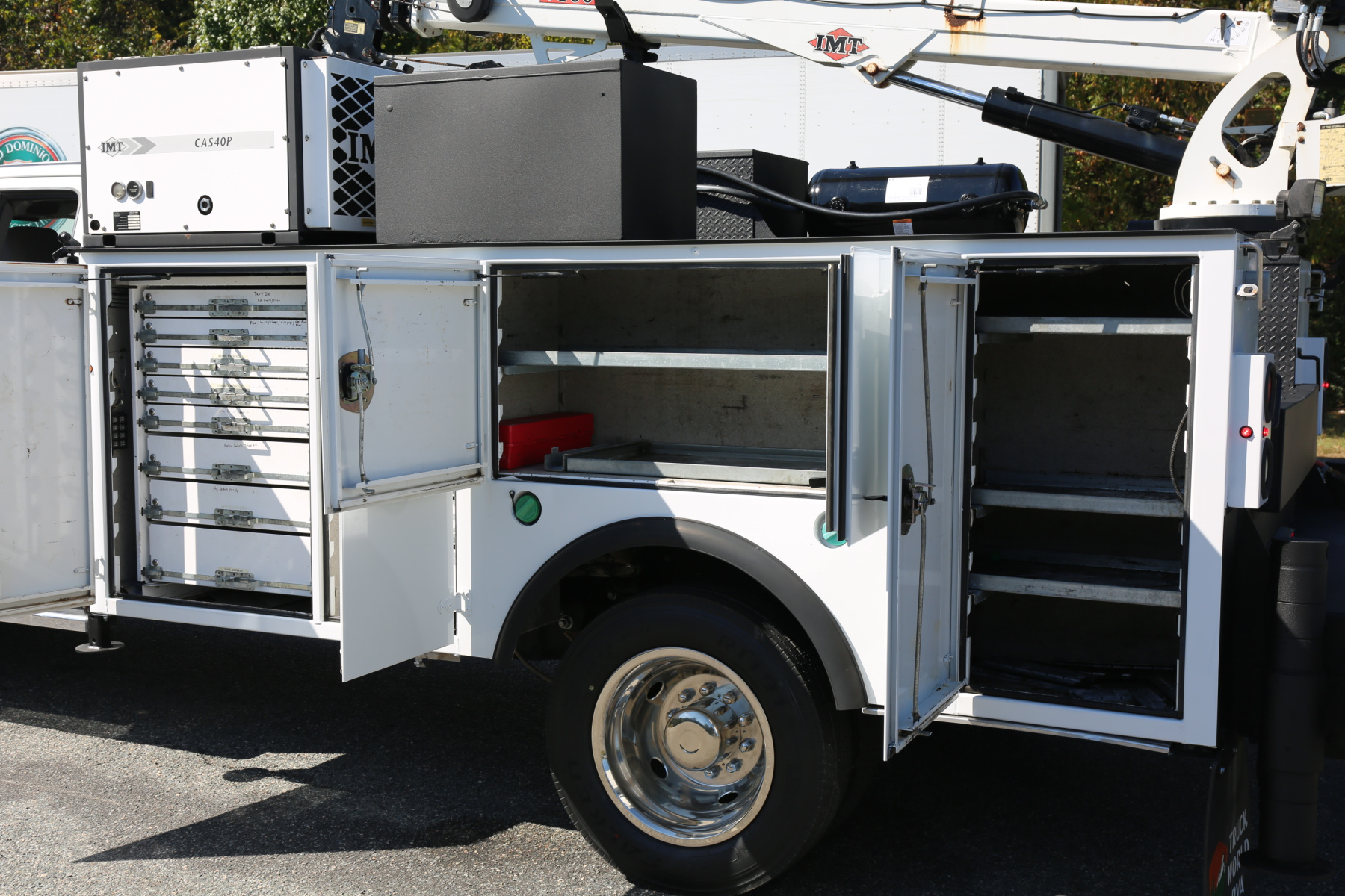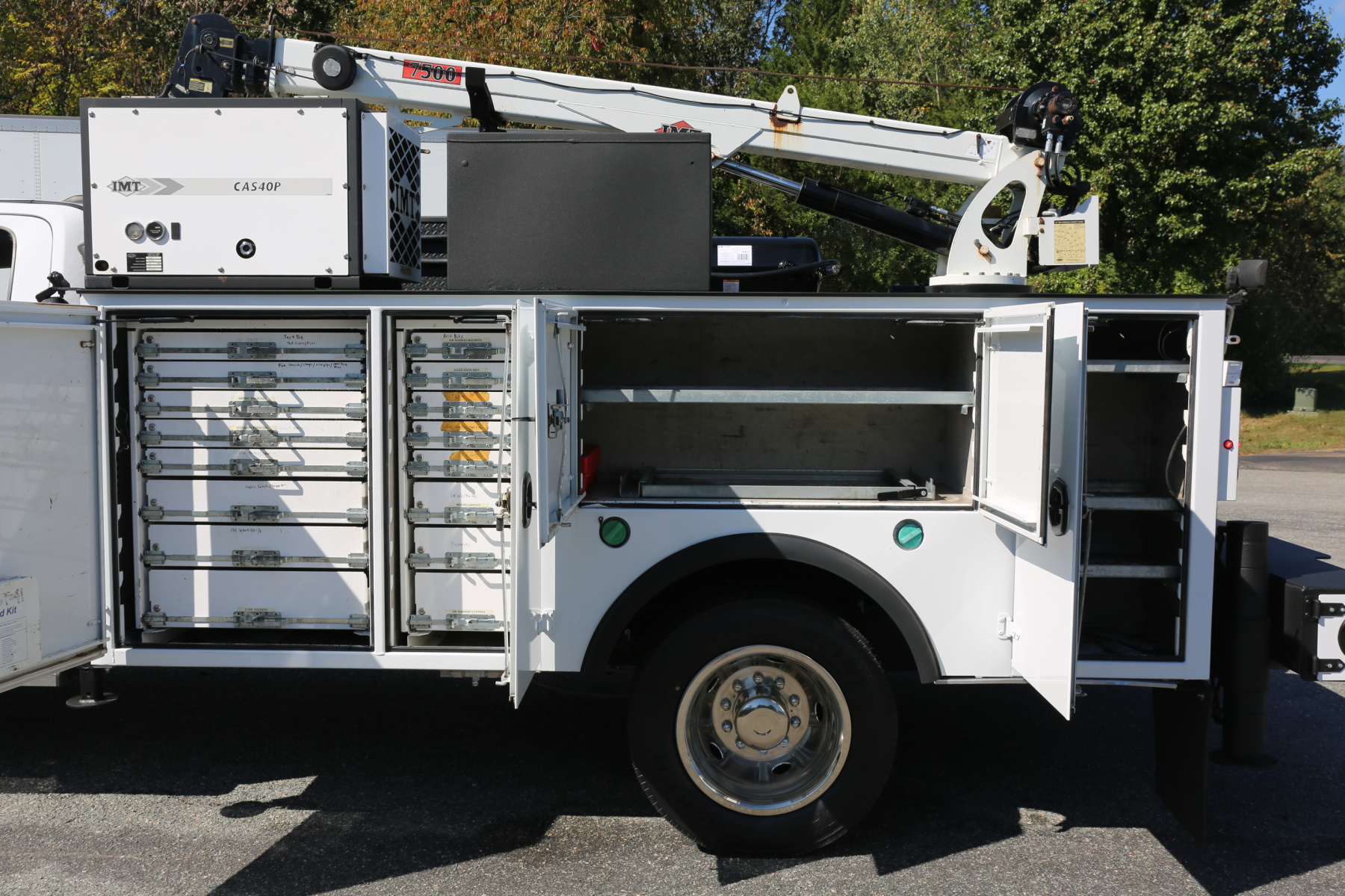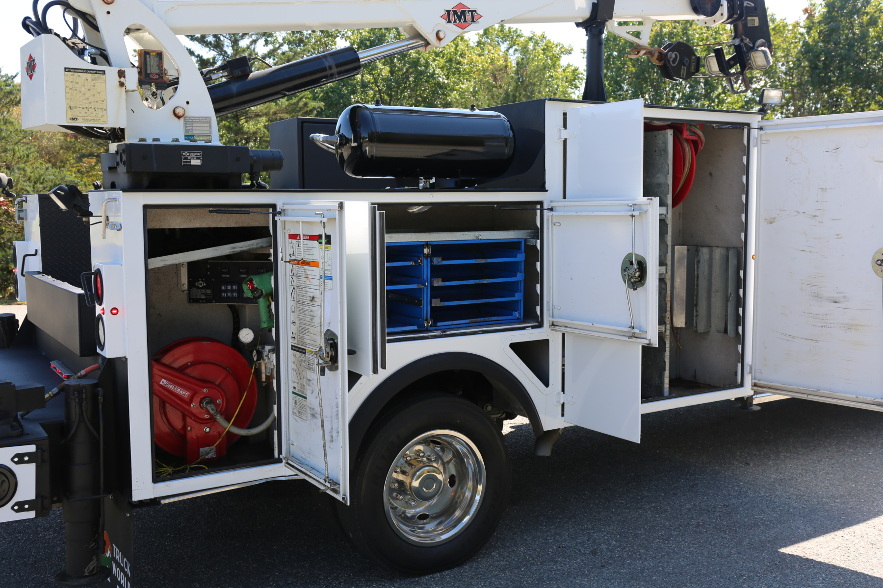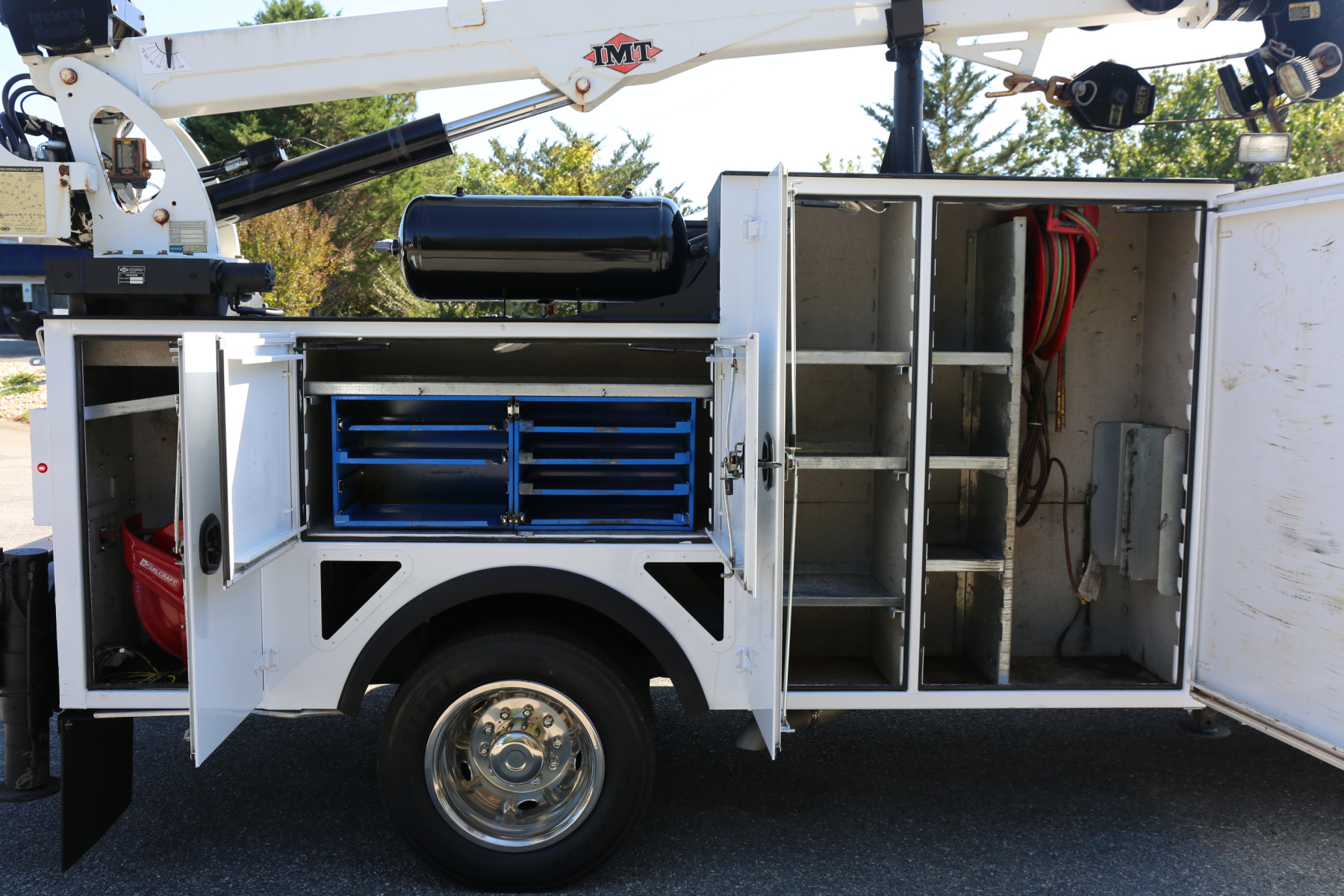 This truck has an 11′ IMT Dominator DOM1S3 service body, IMT 7500-22 series crane and factory wireless remote, an IMT CAS40P hydraulic compressor, and two factory IMT drawer sets. The bed is free of any rust, and all of the equipment works as it should.