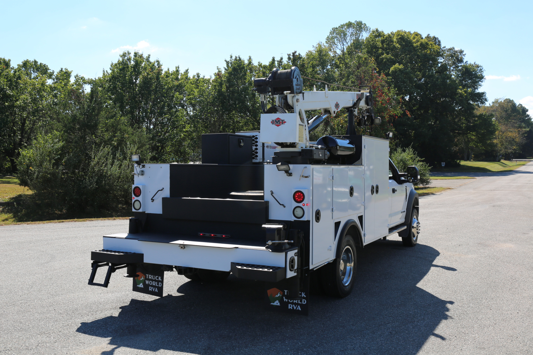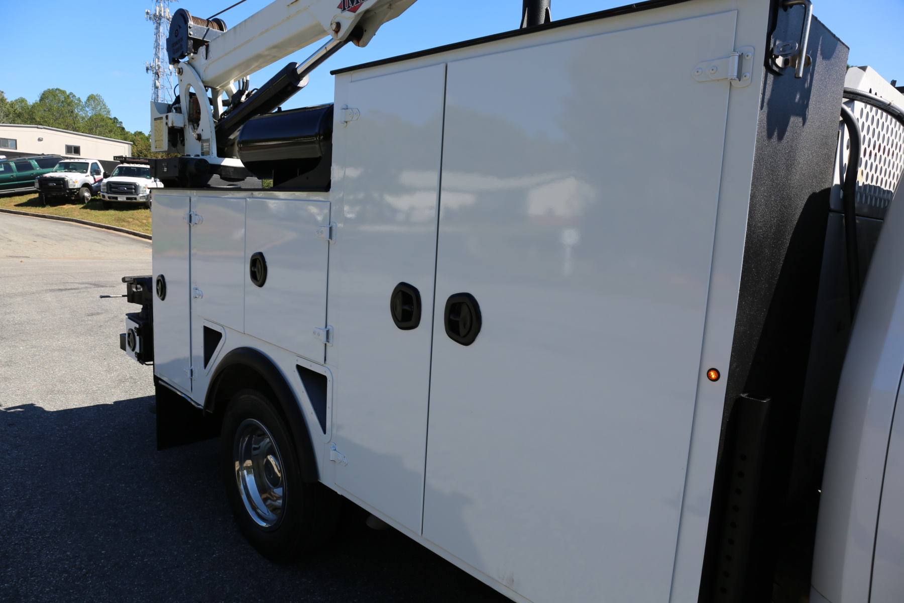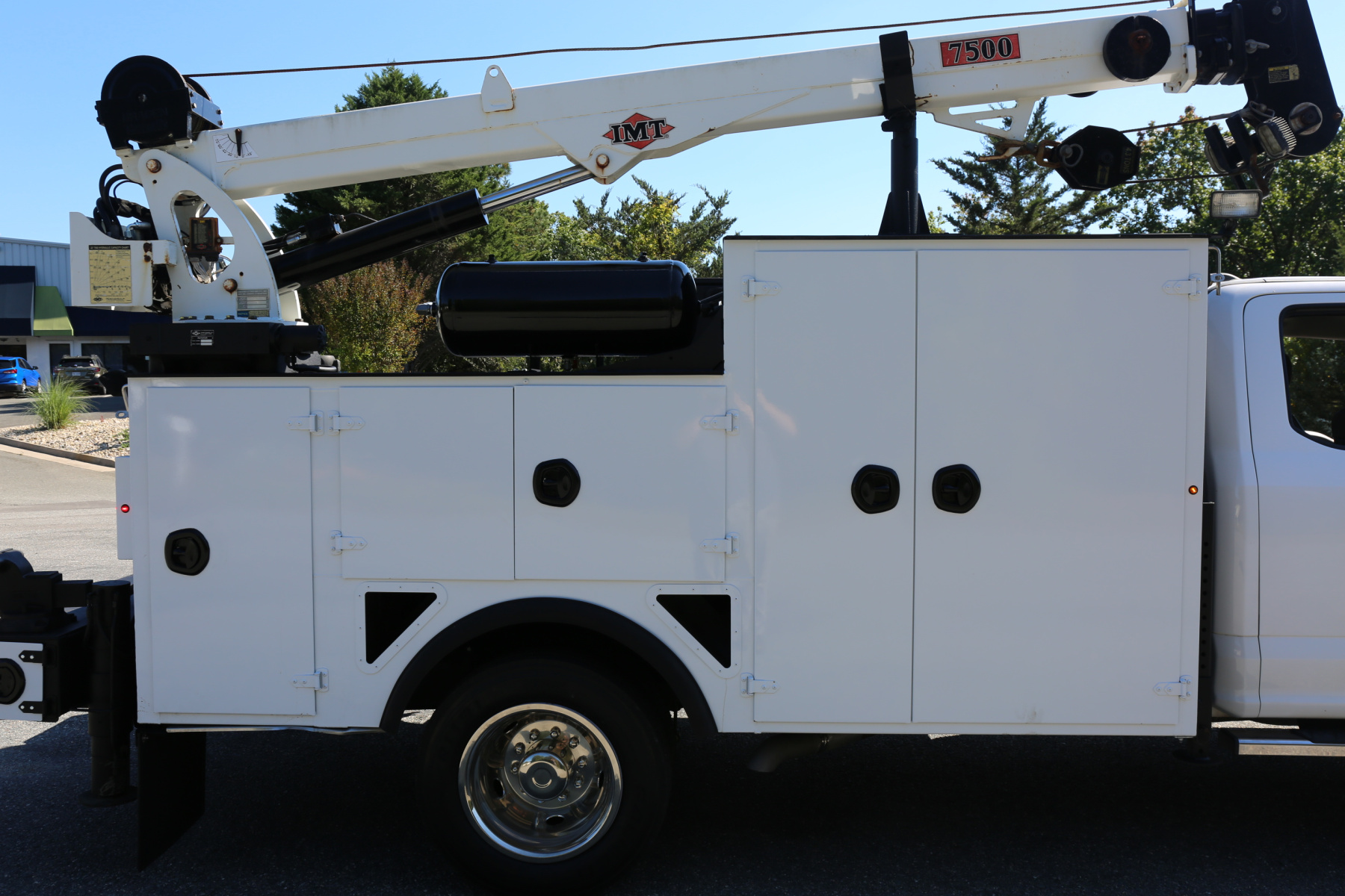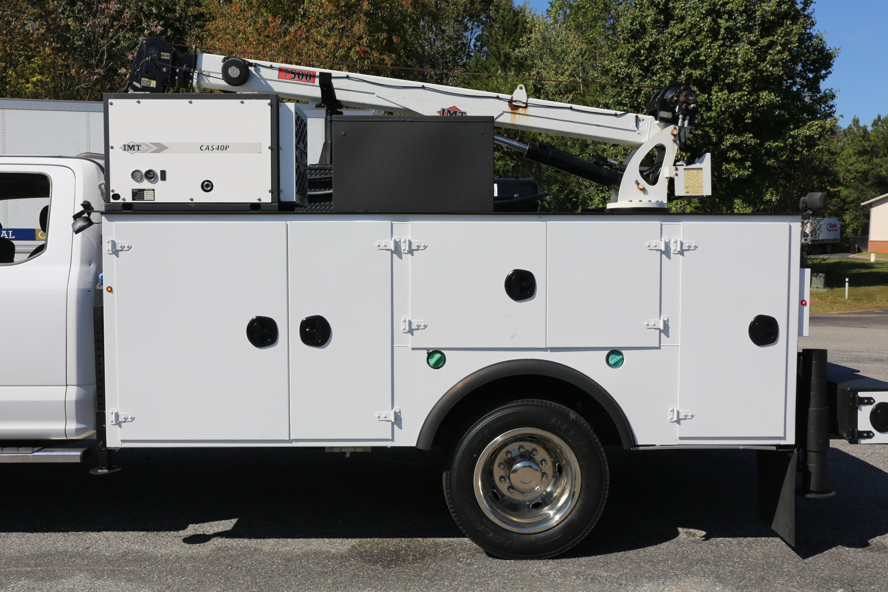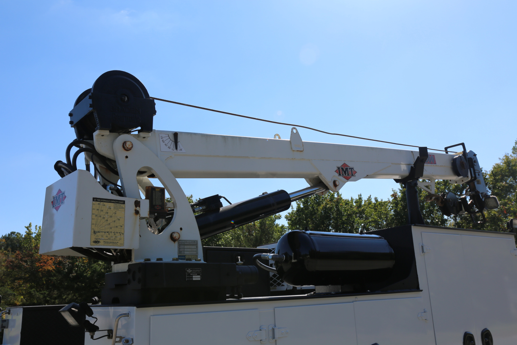 This truck has an 11′ IMT Dominator DOM1S3 service body, IMT 7500-22 series crane and factory wireless remote, an IMT CAS40P hydraulic compressor, and two factory IMT drawer sets. The bed is free of any rust, and all of the equipment works as it should.