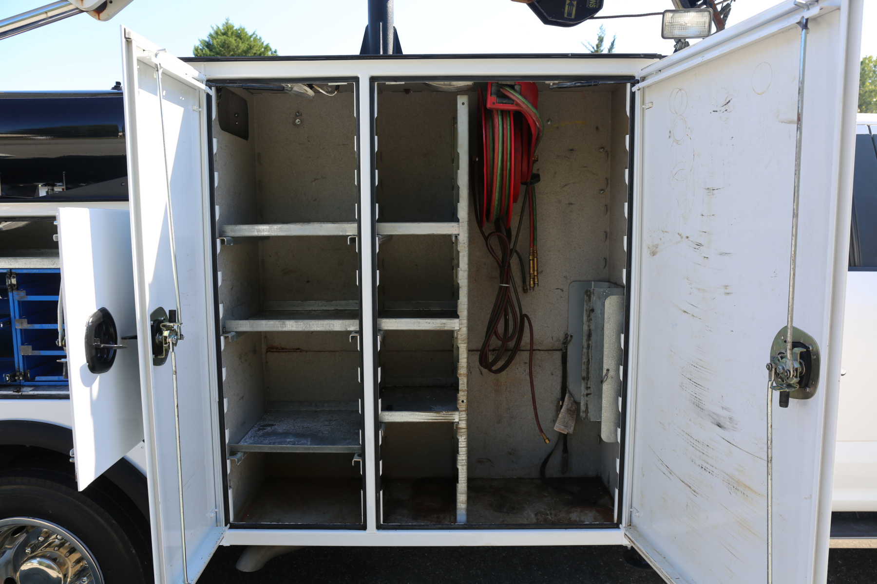 The crane compartment houses a Reelcraft hosereel, outrigger controls, and the body lighting control panel. One shelf over the passenger wheel well, three shelves in the P2 compartment, and three more shelves in the P1 compartment. The P1 compartment also has torch bottle racks and straps, and is torch cabinet height.