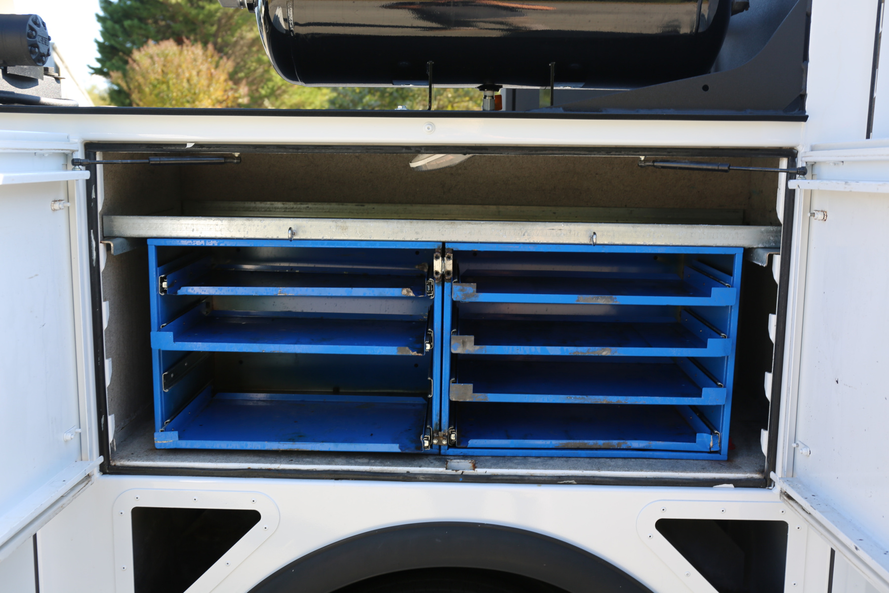 The D1 and D2 compartments both are full with IMT factory drawers – eight total. One shelf over the driver wheel well, three shelves in the driver rear compartment.