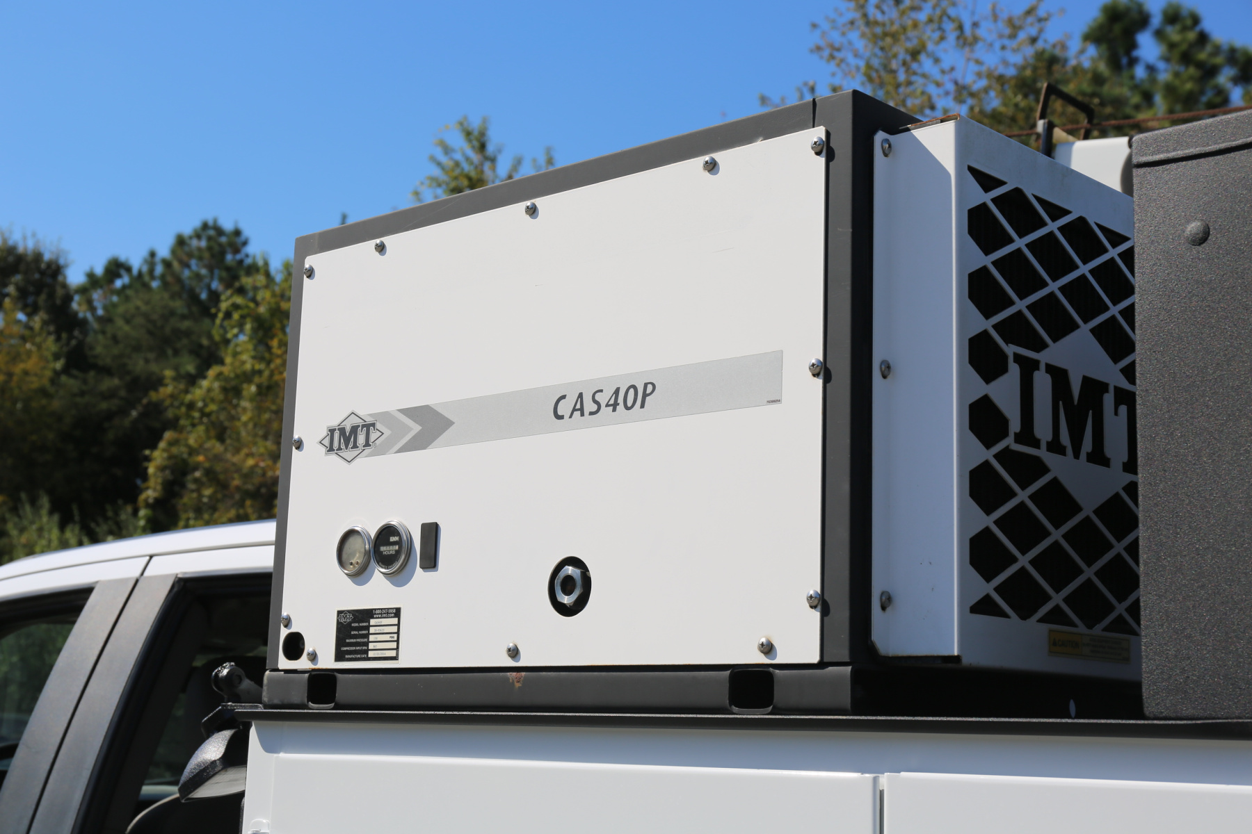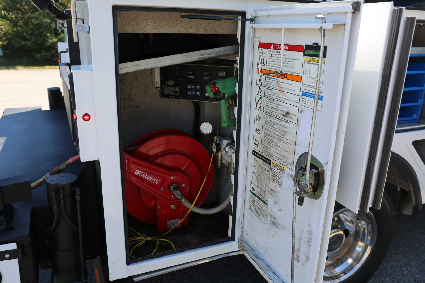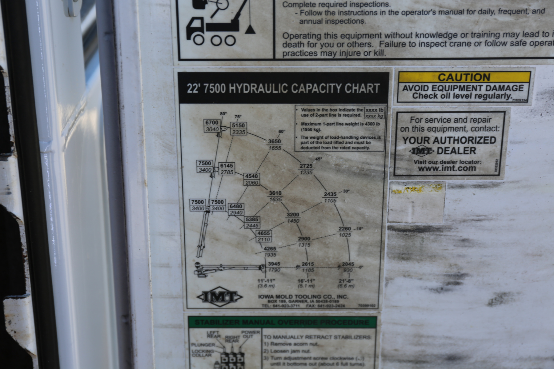 The crane is an IMT 7500-22 series, with a 7500# maximum lifting capacity and a two stage hydraulic extension out to 22′ of total reach. Run off a factory wireless remote. The remote controls the compressor as well – turns it on and off. CAS40P compressor, works as it should and builds air quickly.