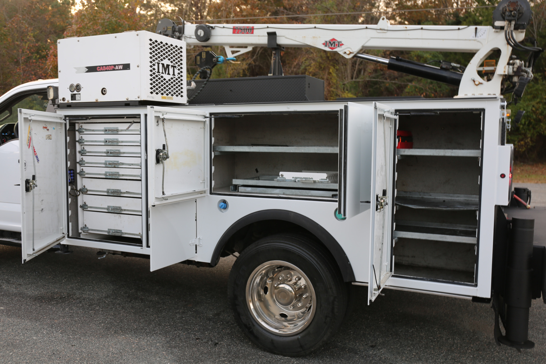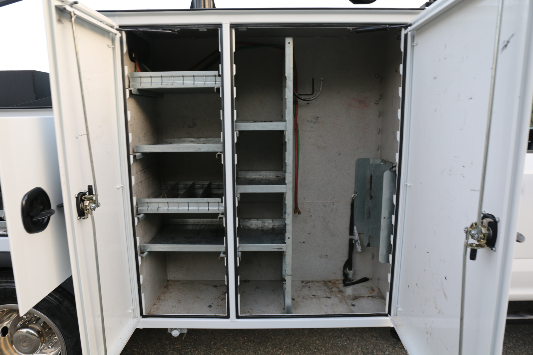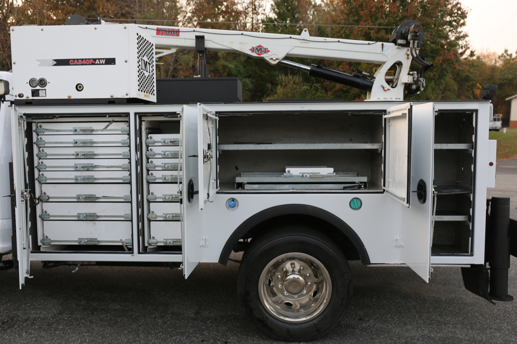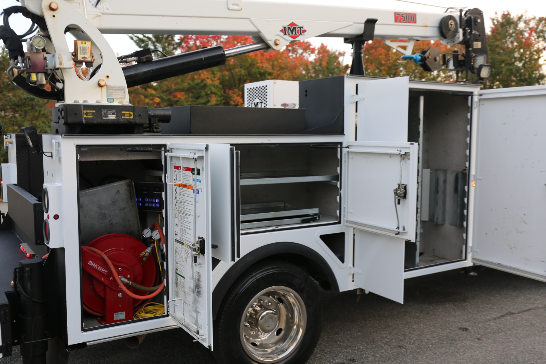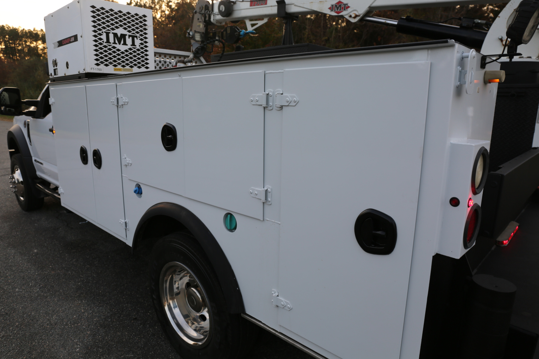 Rust free IMT Dominator service body, also coming to us out of Texas and remounted here. New PTO installed with the bed. The exterior of the body was sandblasted and repainted, and shows like new, with new bedliner applied to the bumper and inside of the bed. All of the doors close, latch, lock, and seal as they should. Interior compartment lighting throughout, as well as exterior work lighting – all operational.