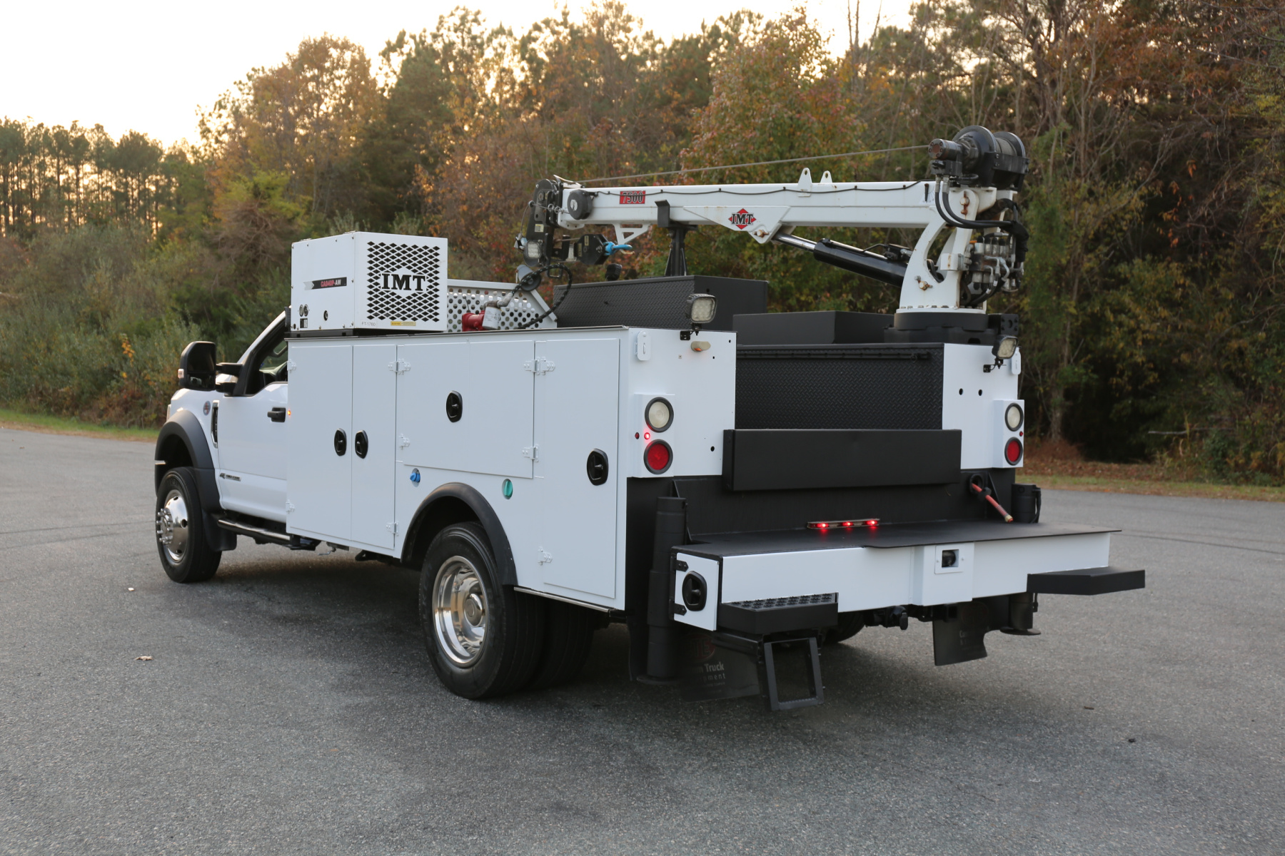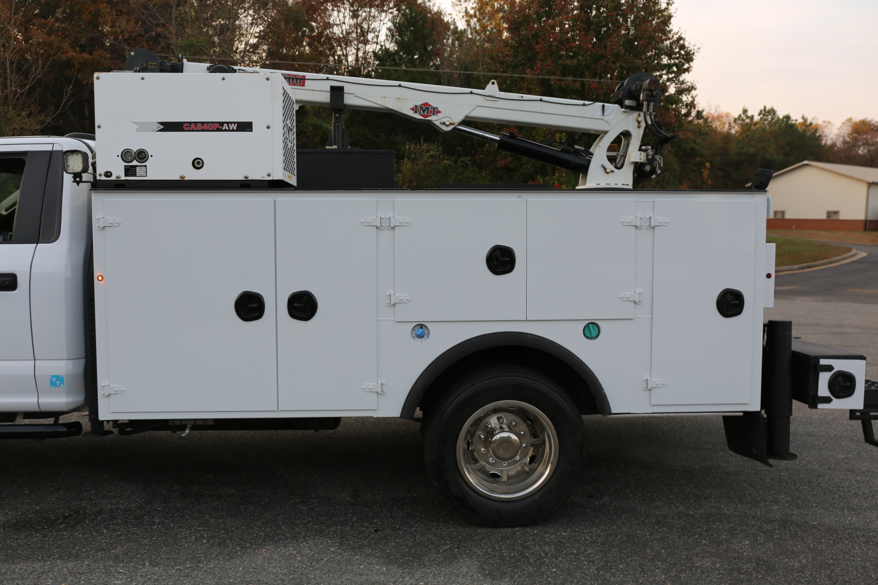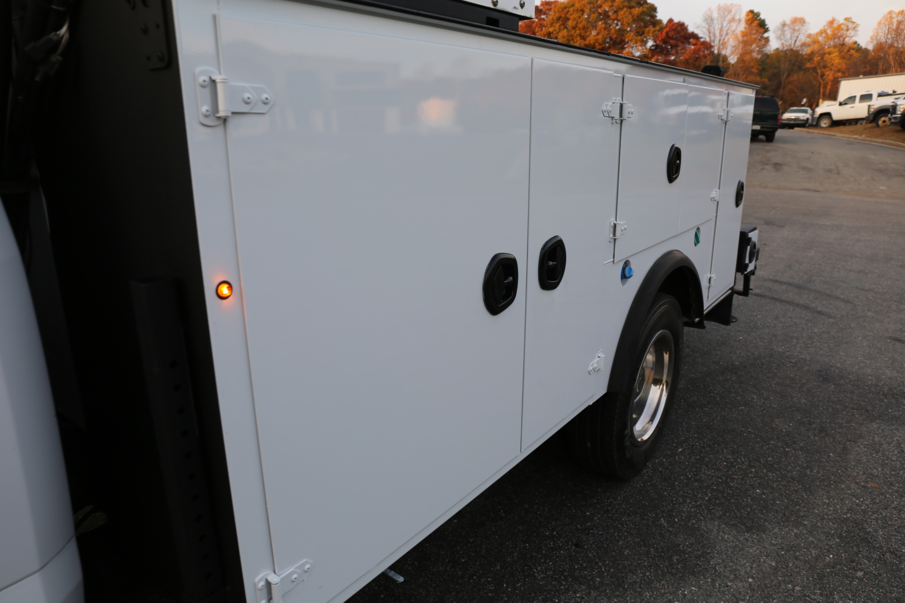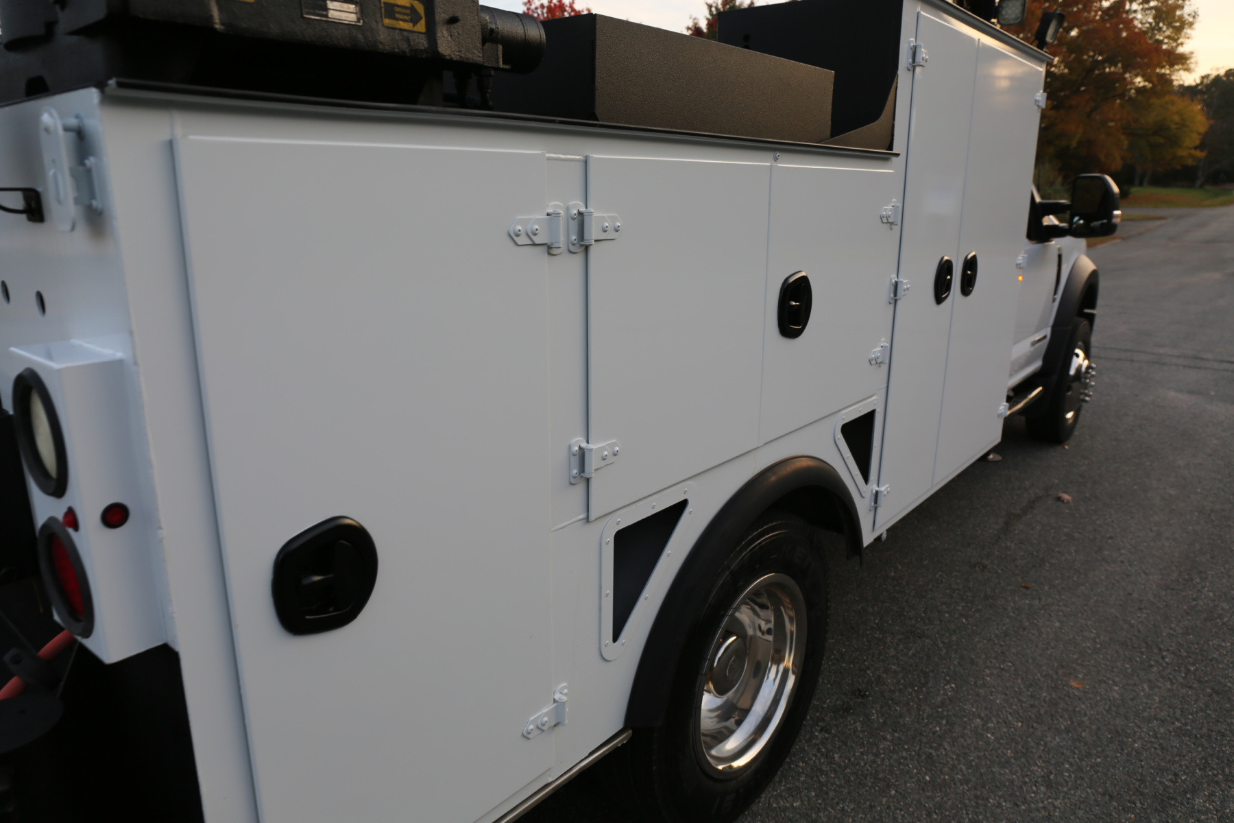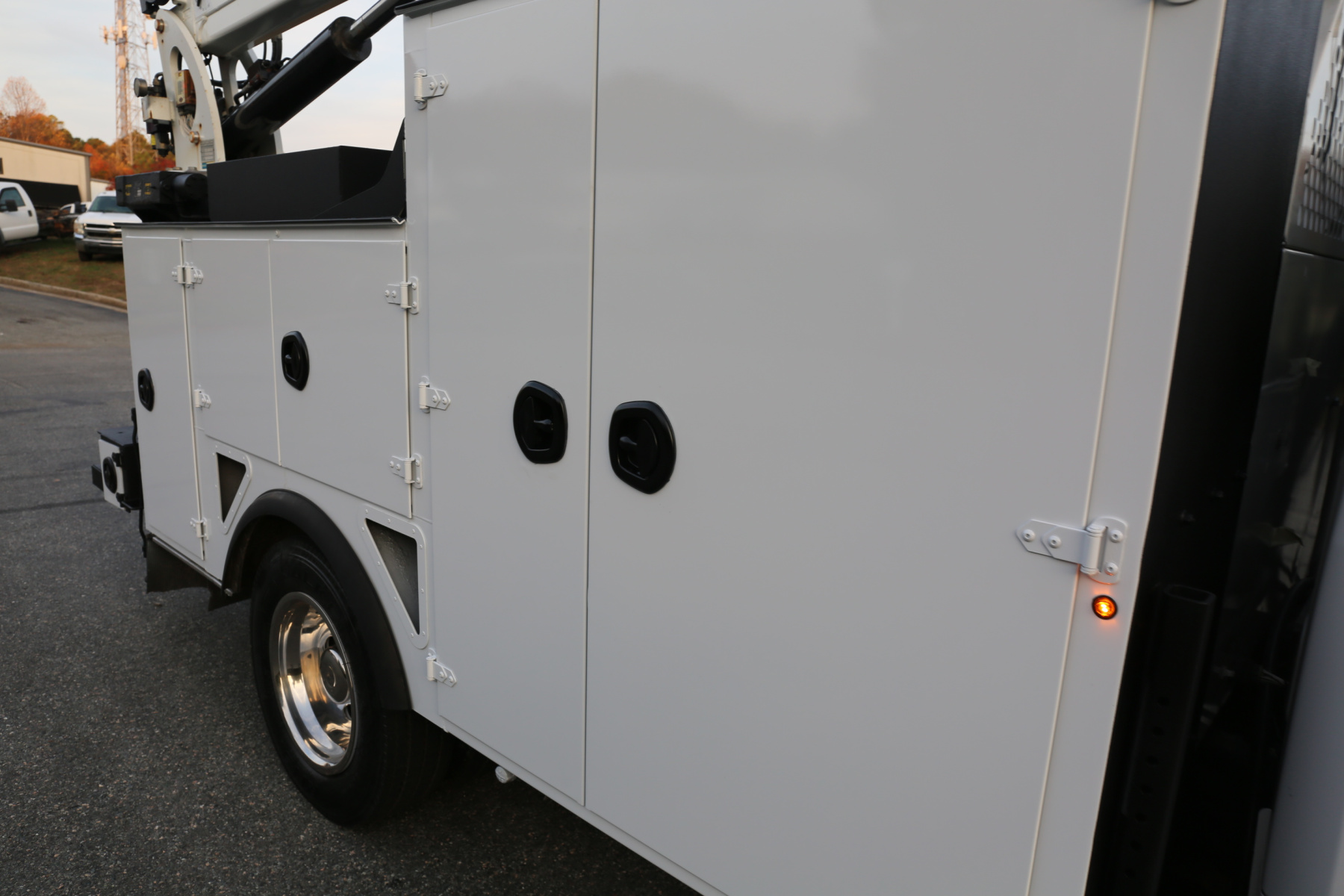 Rust free IMT Dominator service body, also coming to us out of Texas and remounted here. New PTO installed with the bed. The exterior of the body was sandblasted and repainted, and shows like new, with new bedliner applied to the bumper and inside of the bed. All of the doors close, latch, lock, and seal as they should. Interior compartment lighting throughout, as well as exterior work lighting – all operational.
