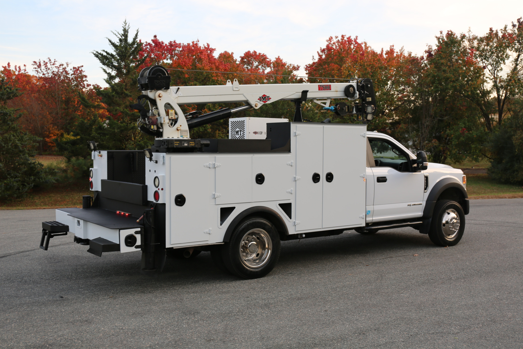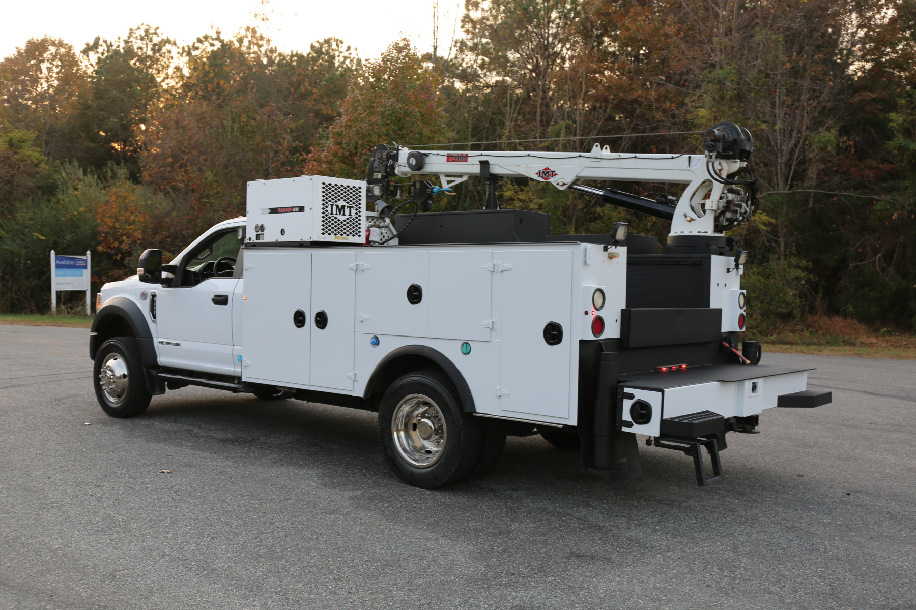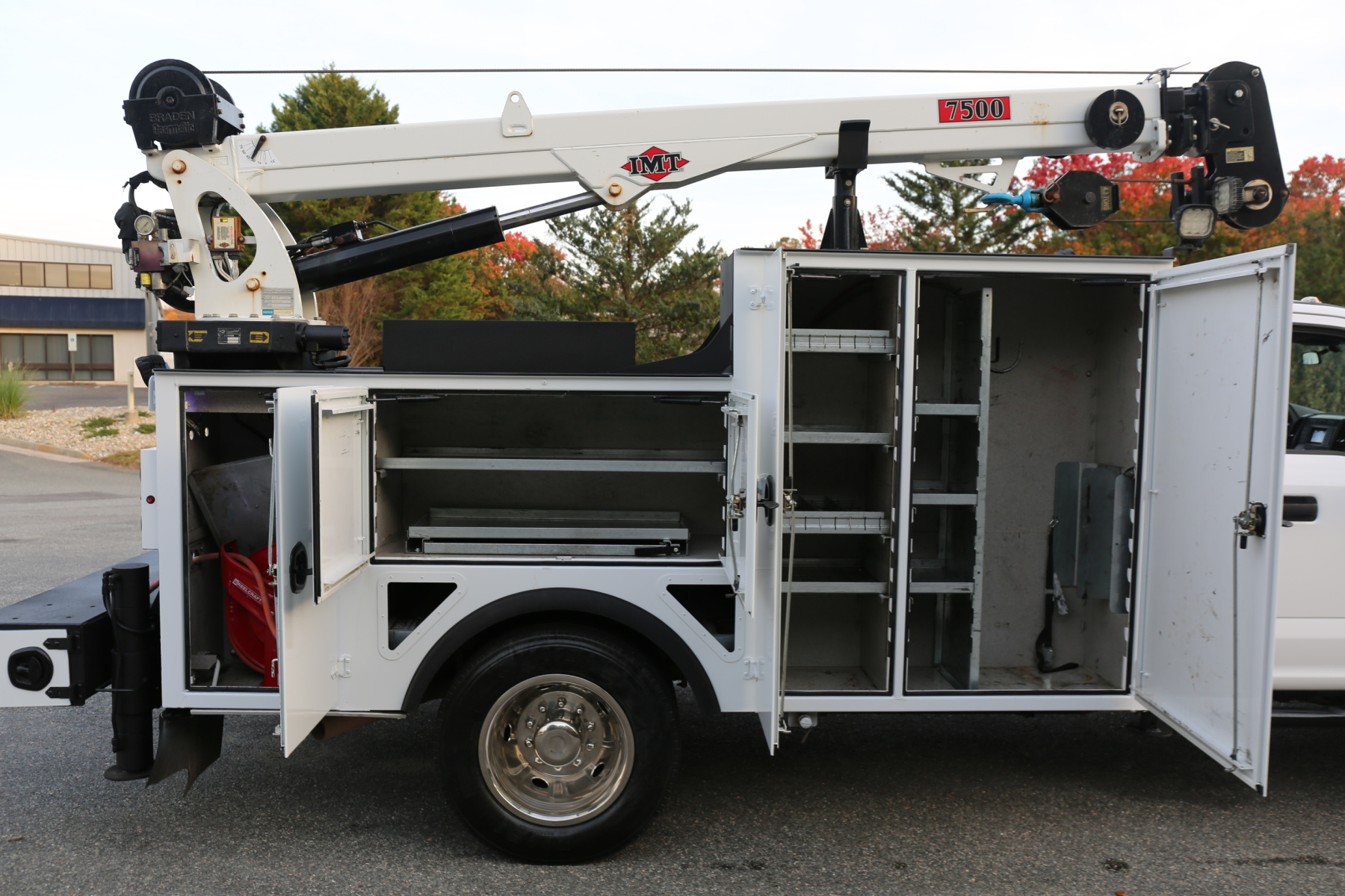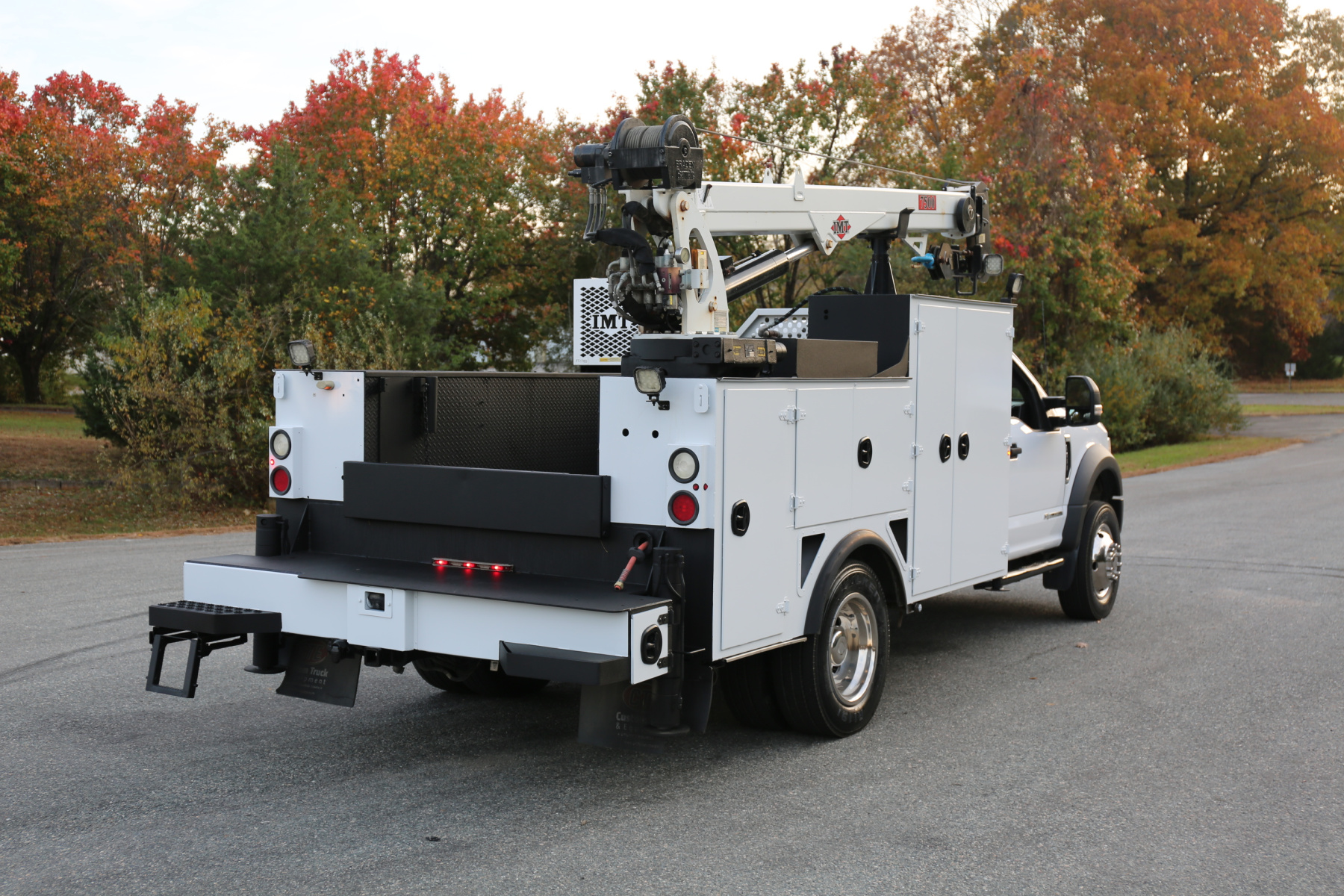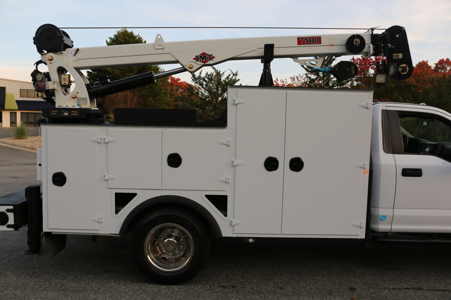 Rust free IMT Dominator service body, also coming to us out of Texas and remounted here. New PTO installed with the bed. The exterior of the body was sandblasted and repainted, and shows like new, with new bedliner applied to the bumper and inside of the bed. All of the doors close, latch, lock, and seal as they should. Interior compartment lighting throughout, as well as exterior work lighting – all operational.