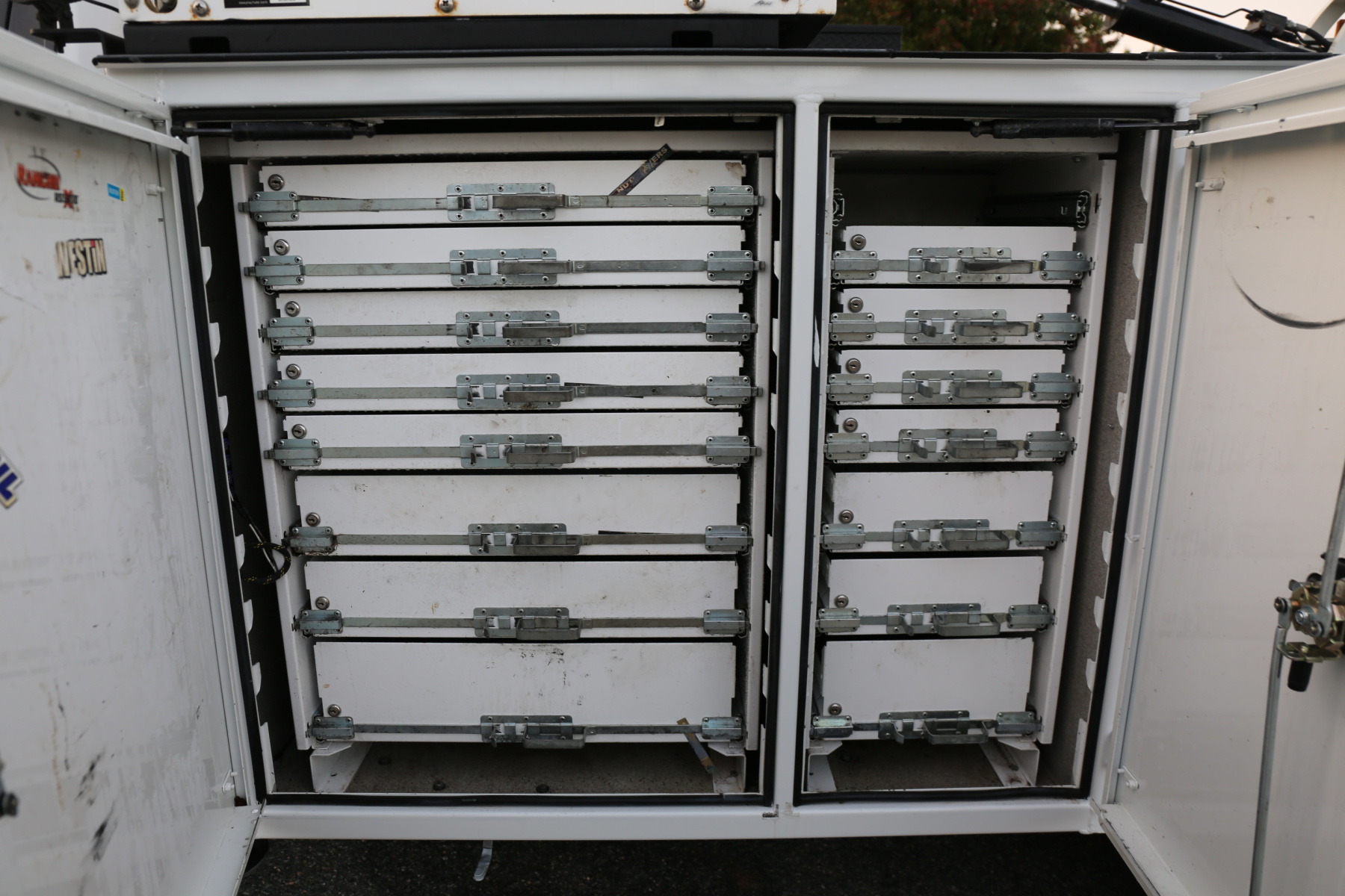 The D1 compartment has a full set of eight IMT drawers. The D2 compartment has a set of seven IMT drawers. One sliding tray over the driver wheel well, with a shelf above it. Three shelves in the driver rear compartment.