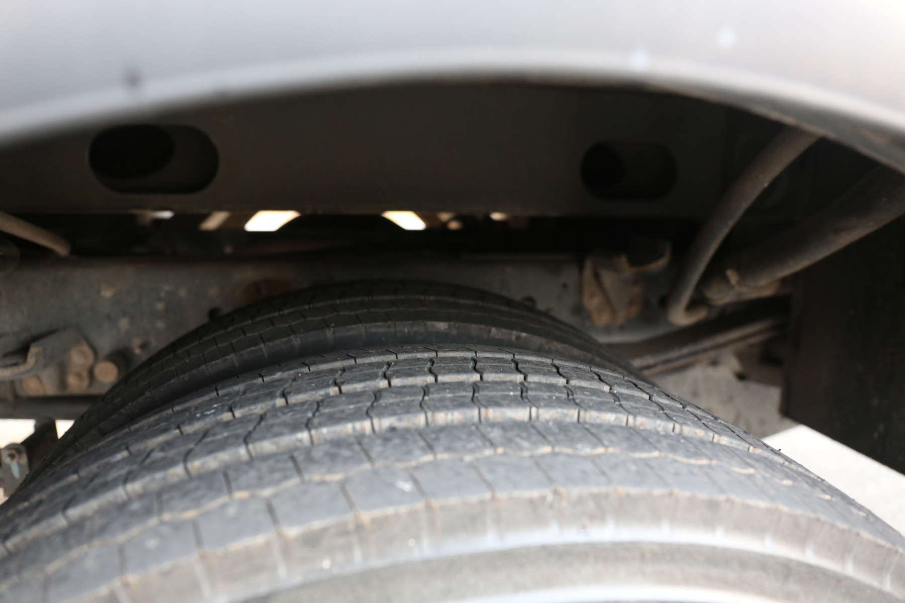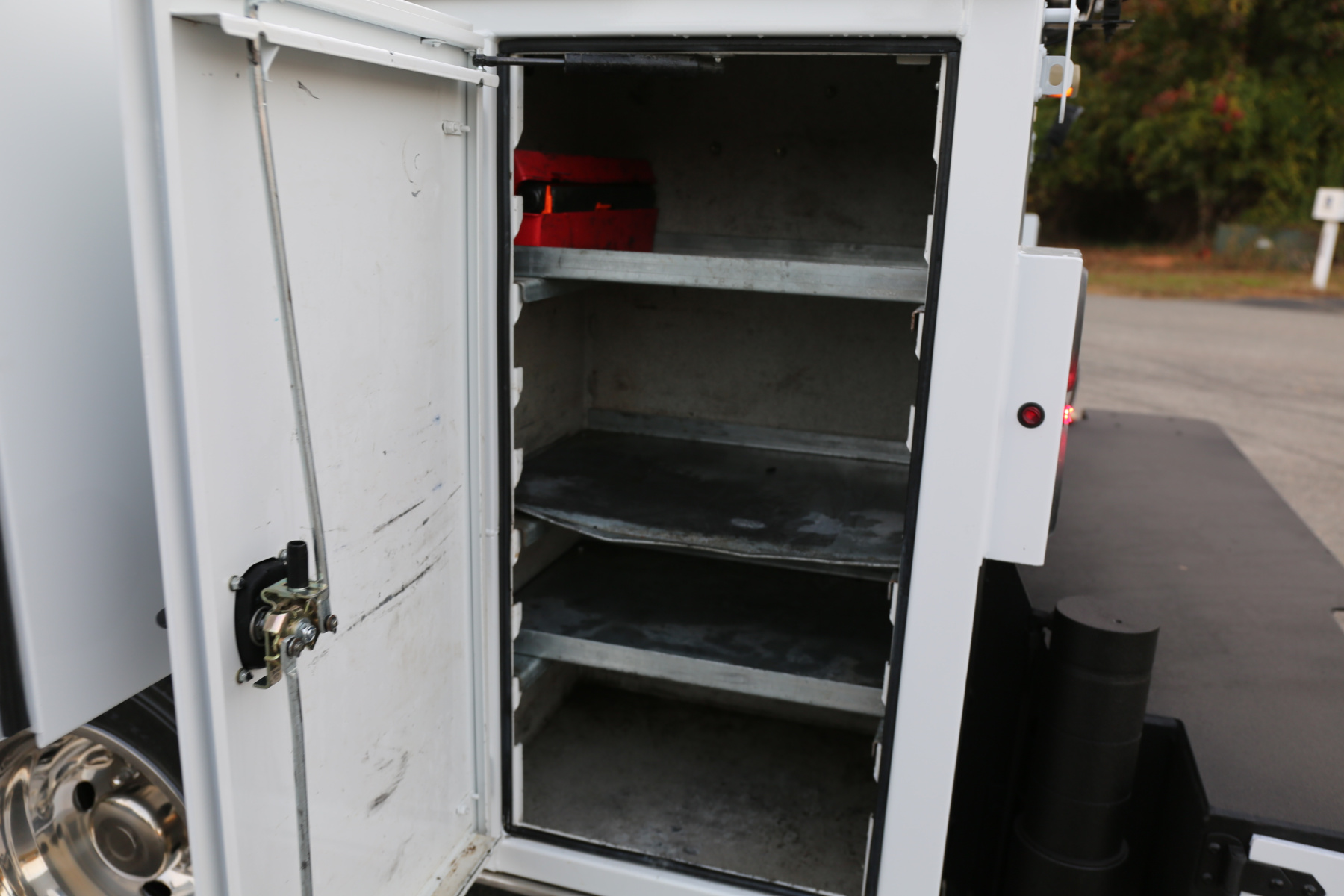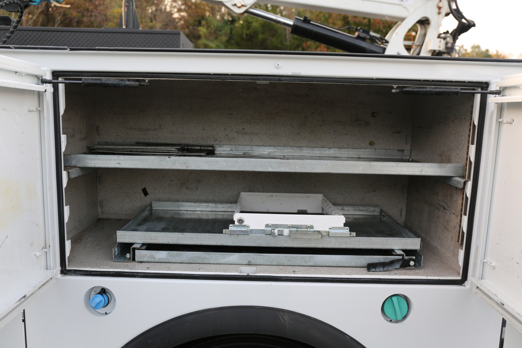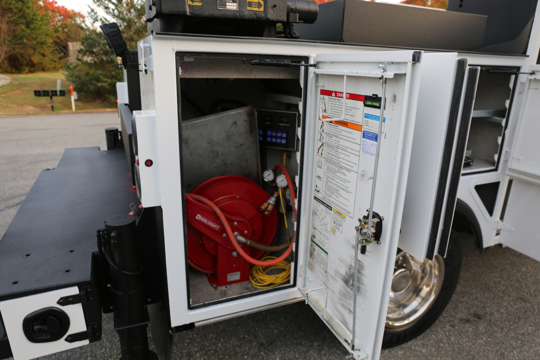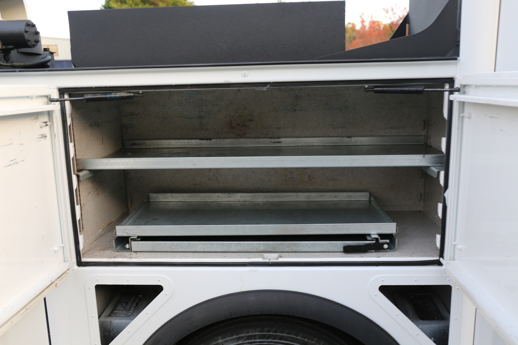 The crane compartment houses the body control panel for all bed lighting and outriggers, a Reelcraft hose reel, and one shelf. Another sliding tray over the passenger wheel well, with a shelf above it. Three shelves in the P2 compartment. Three more shelves in the P1 compartment, as well as torch bottle racks/straps.