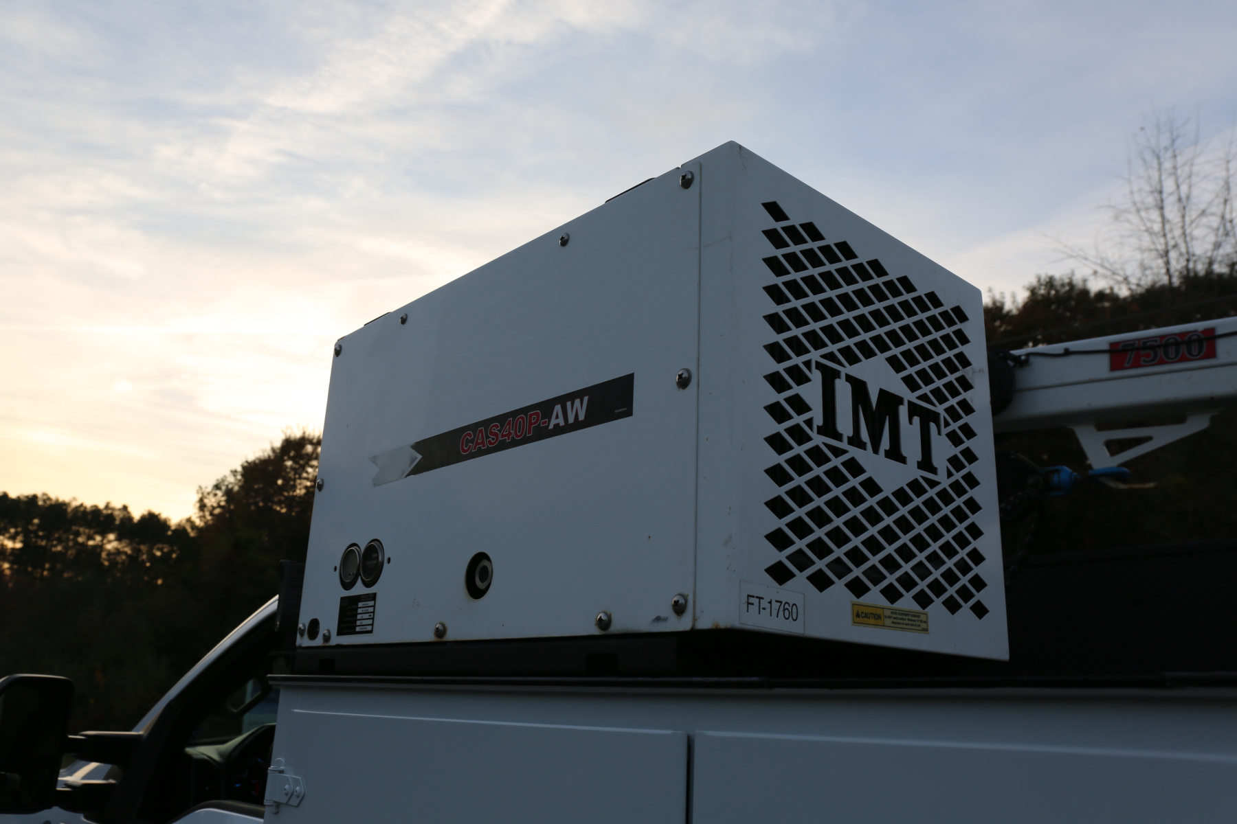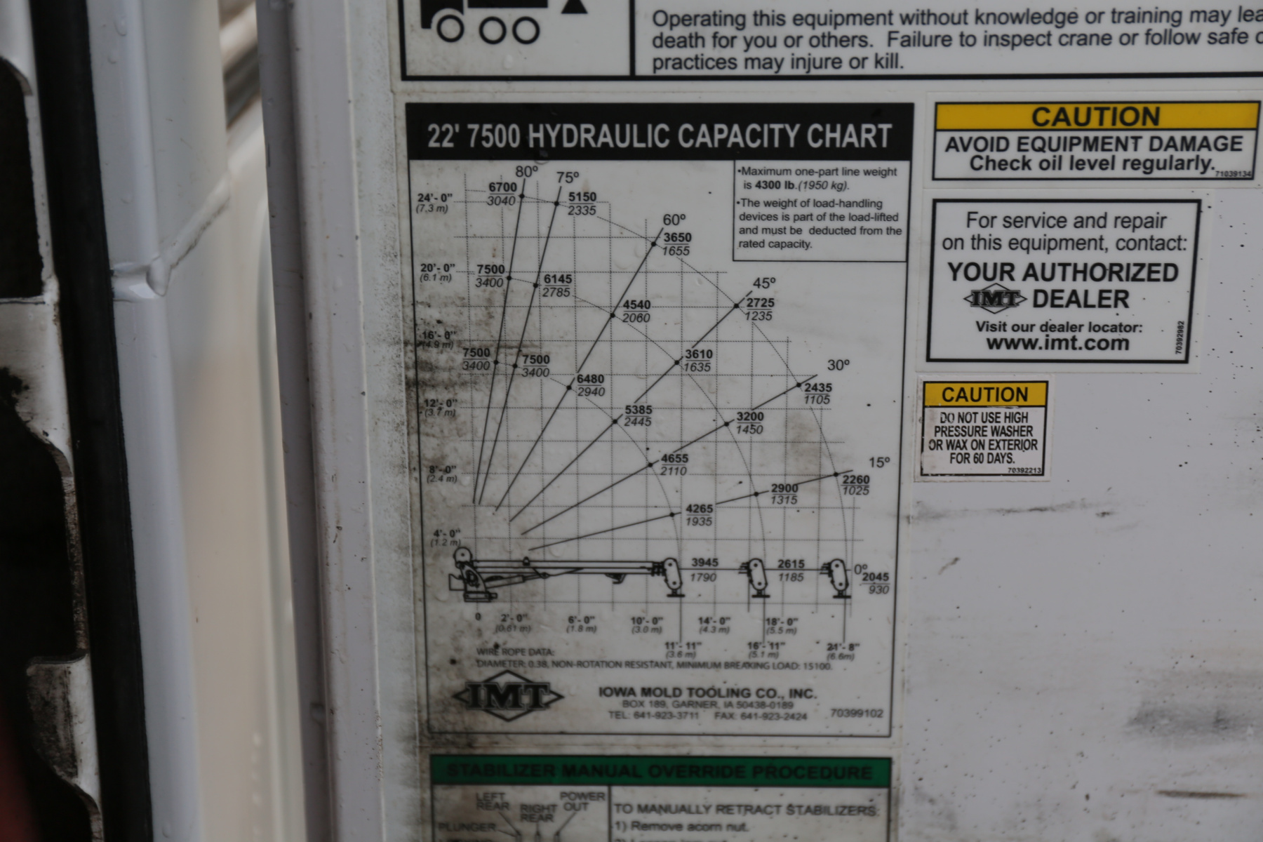 The crane is an IMT 7500-22 series crane, with a maximum lifting capacity of 7500# and a two stage hydraulic extension out to 25′ of reach. Run off a factory wireless remote, works as it should.