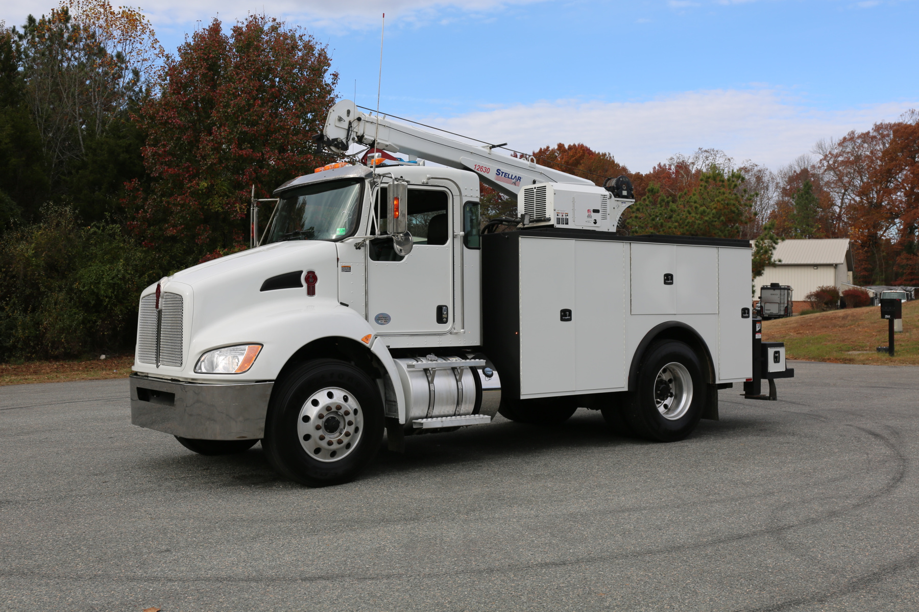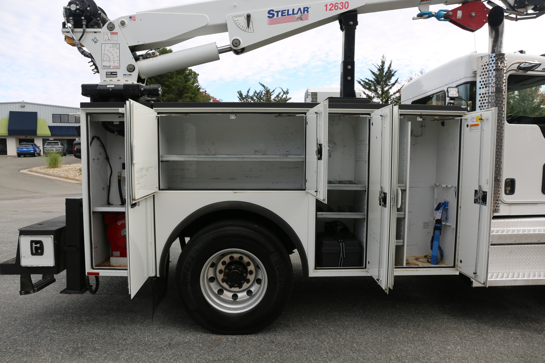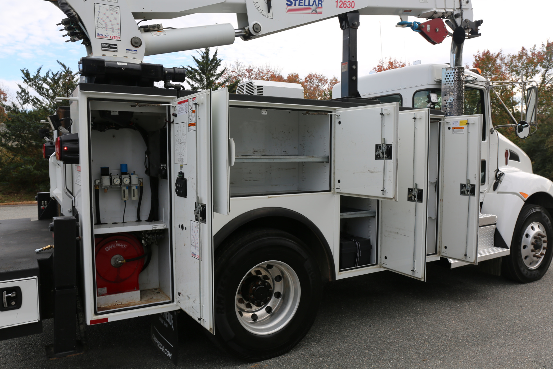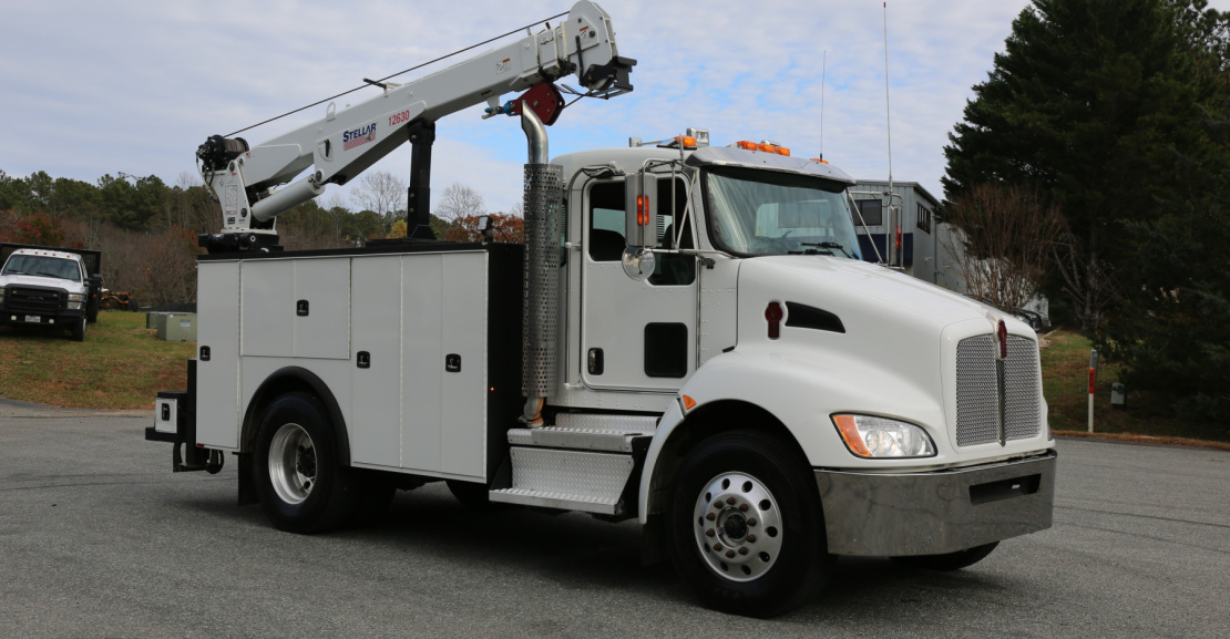 The crane is a Stellar 12630 crane, with a 12,000# maximum lifting capacity and a two stage extension out to 30′ of reach. Run off a factory wireless remote – the remote controls the compressor, and can turn the truck on and off.
