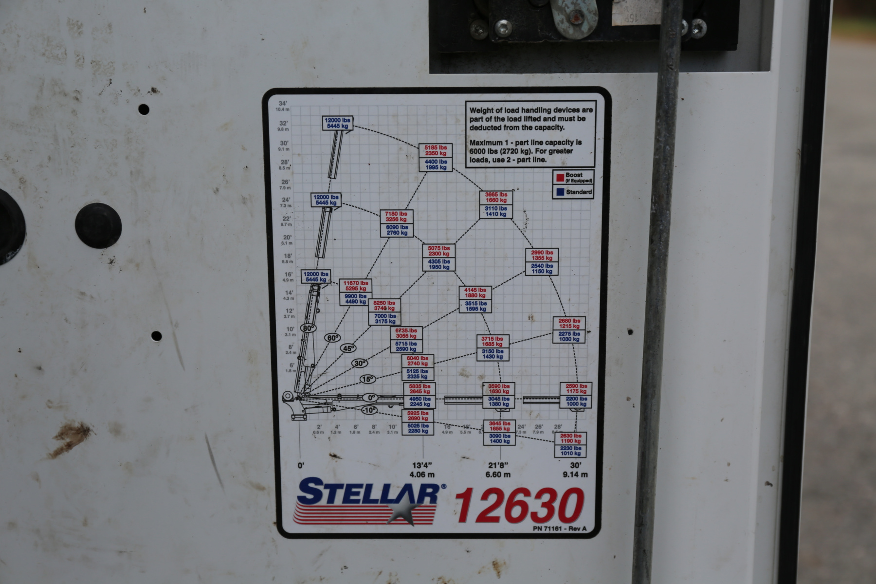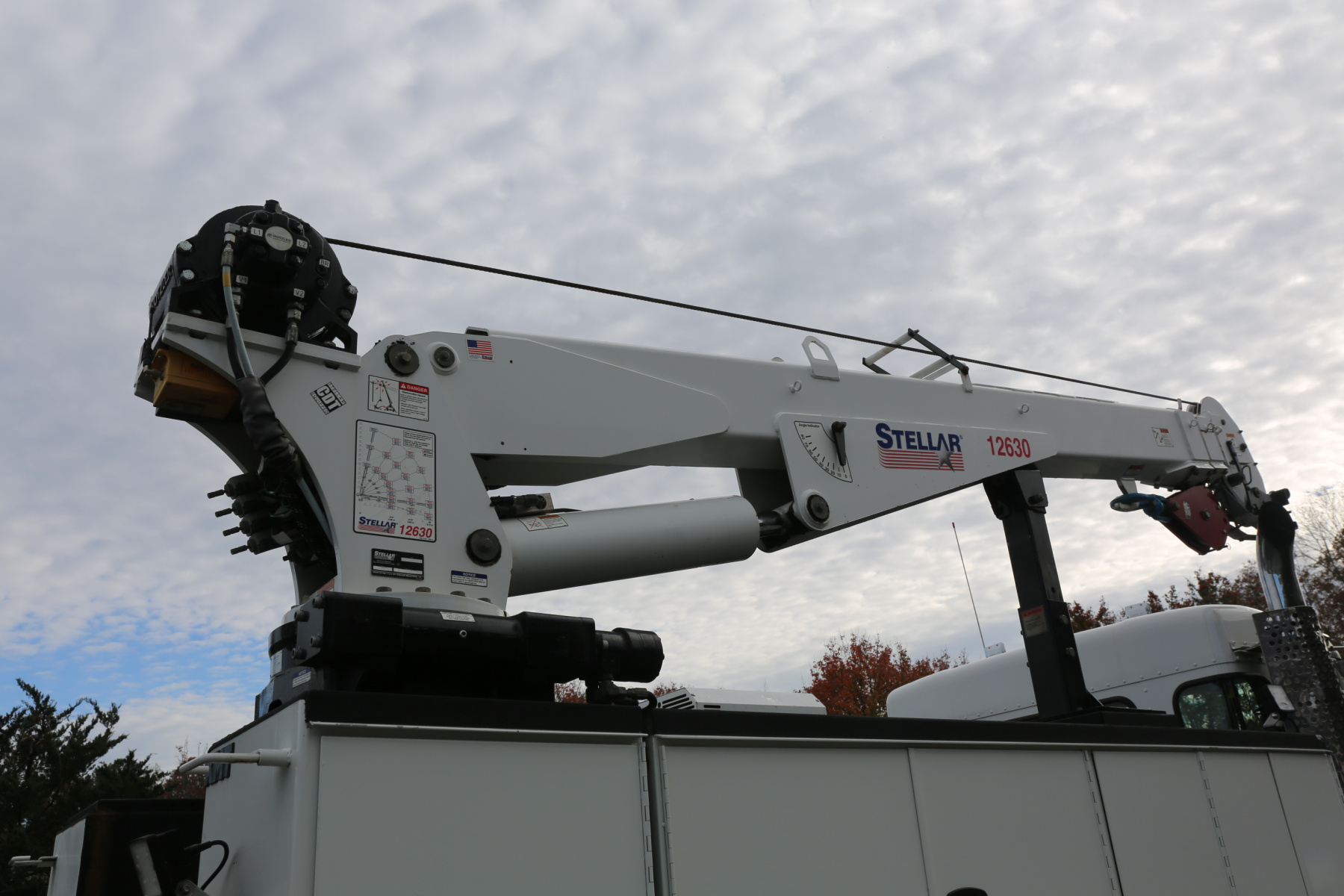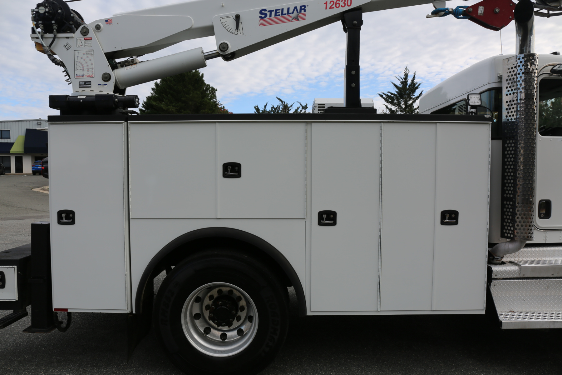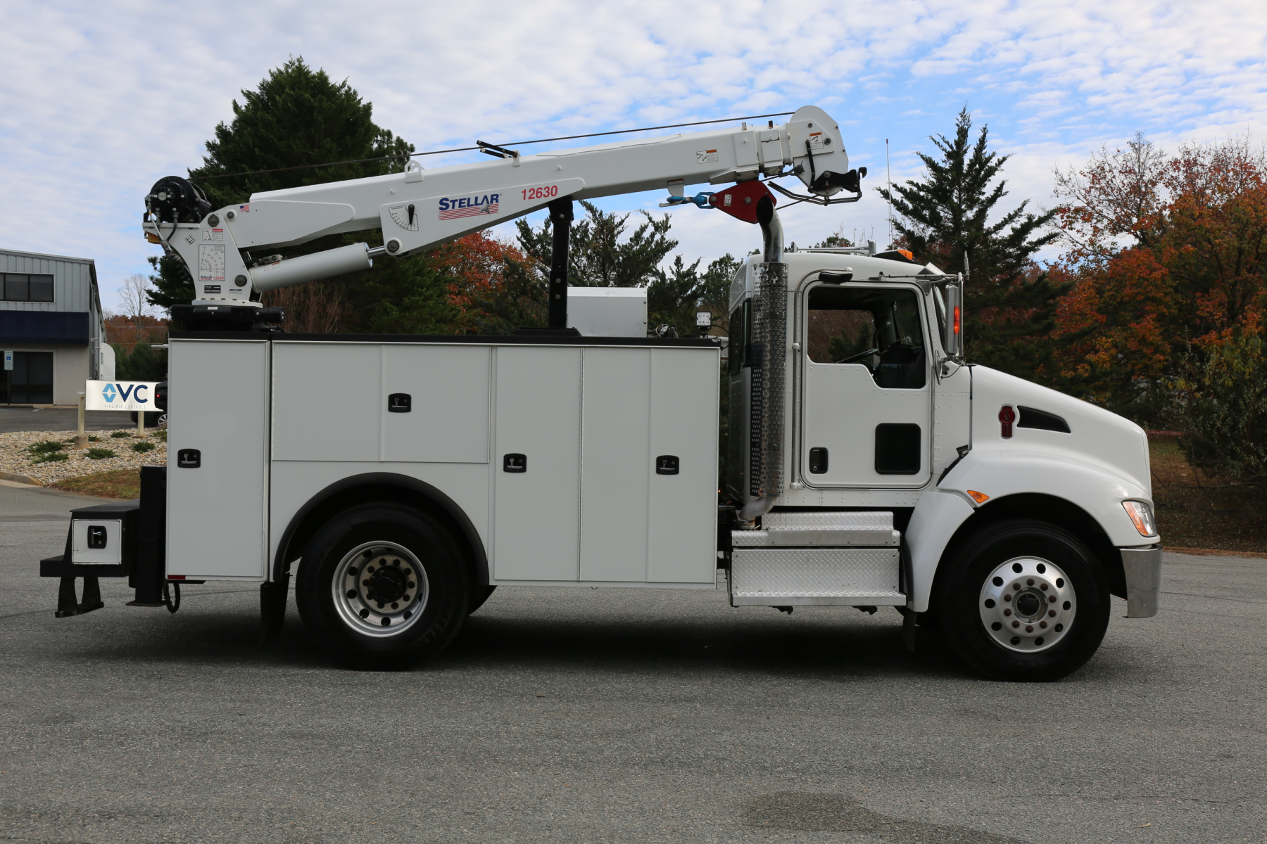The crane is a Stellar 12630 crane, with a 12,000# maximum lifting capacity and a two stage extension out to 30′ of reach. Run off a factory wireless remote – the remote controls the compressor, and can turn the truck on and off.