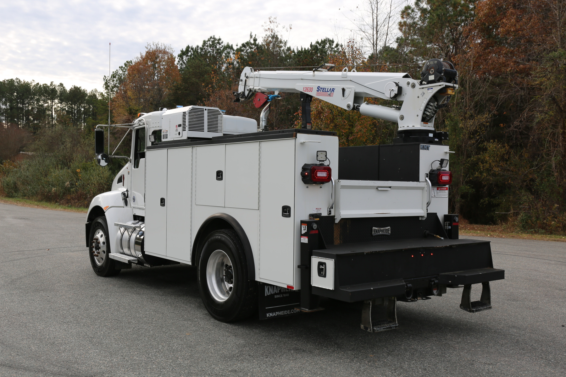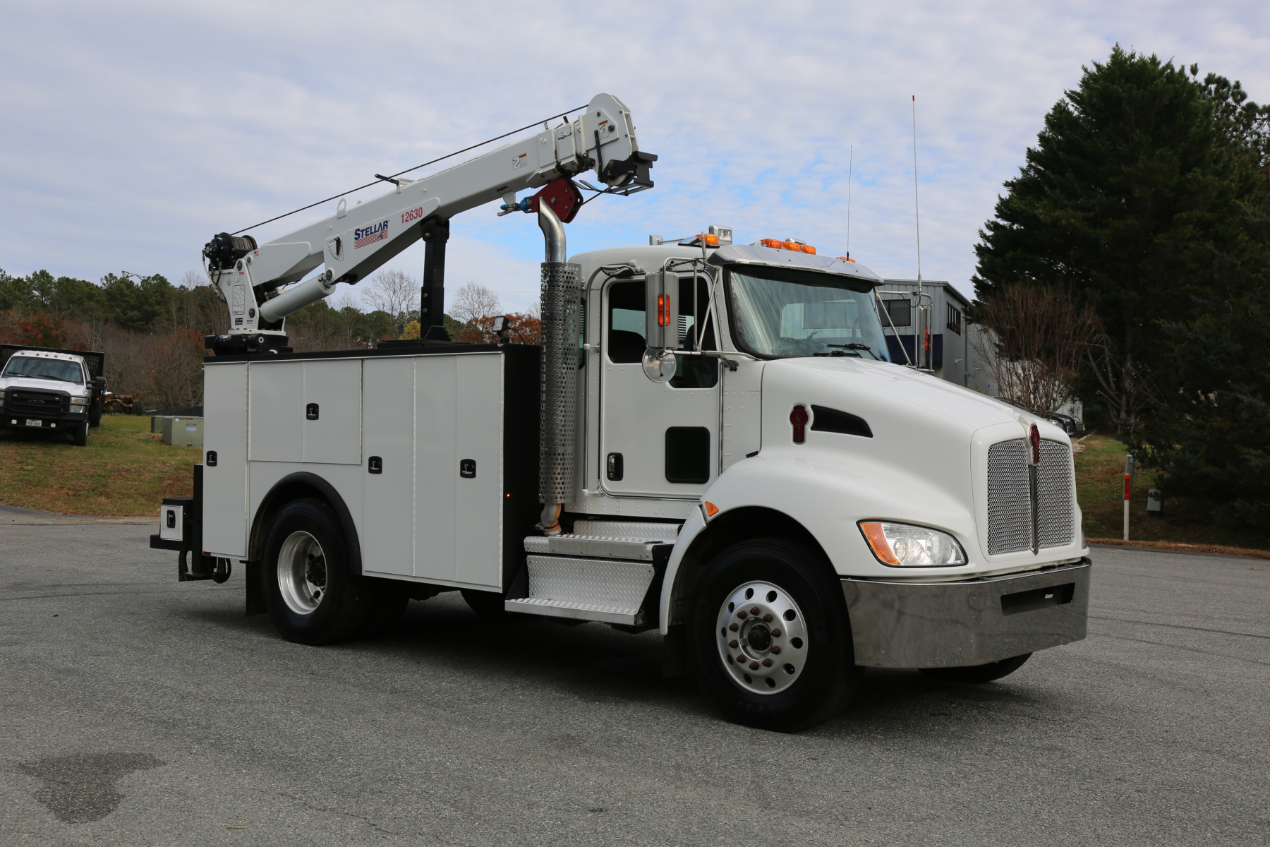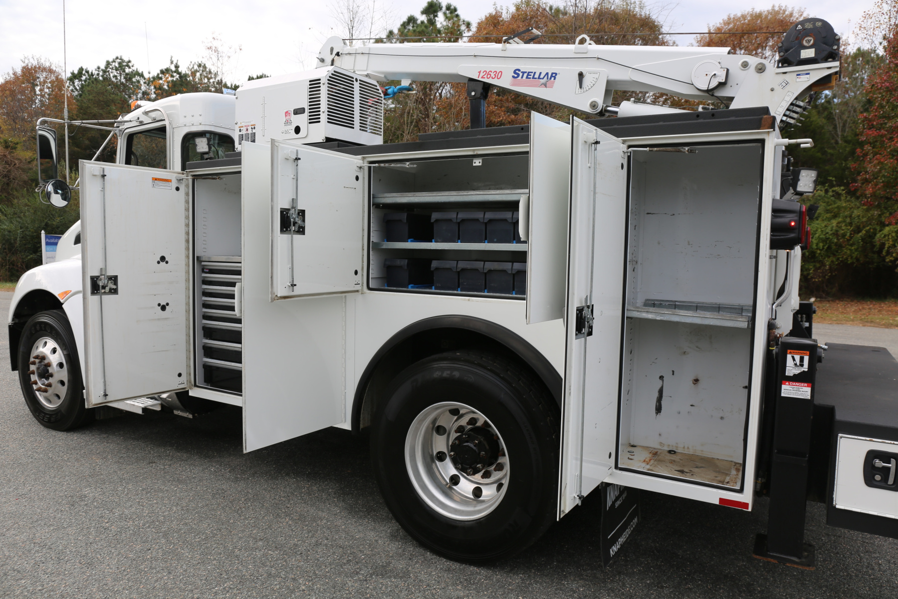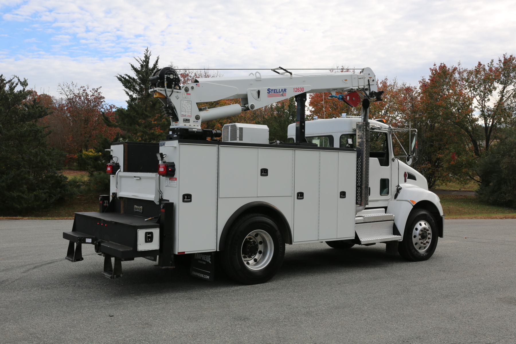 Equipped with an 11′ Knapheide service body, a Stellar 12630 crane, a Boss BA440 hydraulic compressor, two sets of CTech drawers, and hydraulic outriggers. All of the equipment operates as it should.