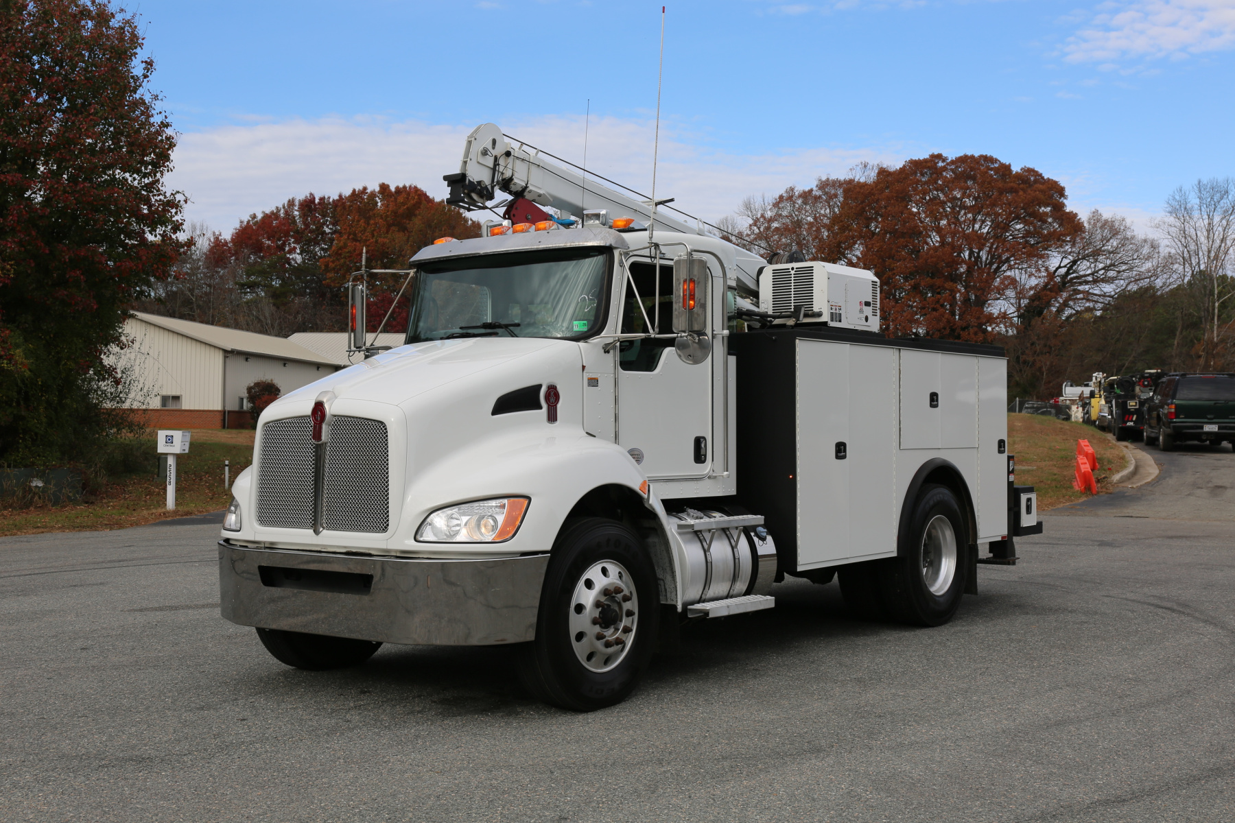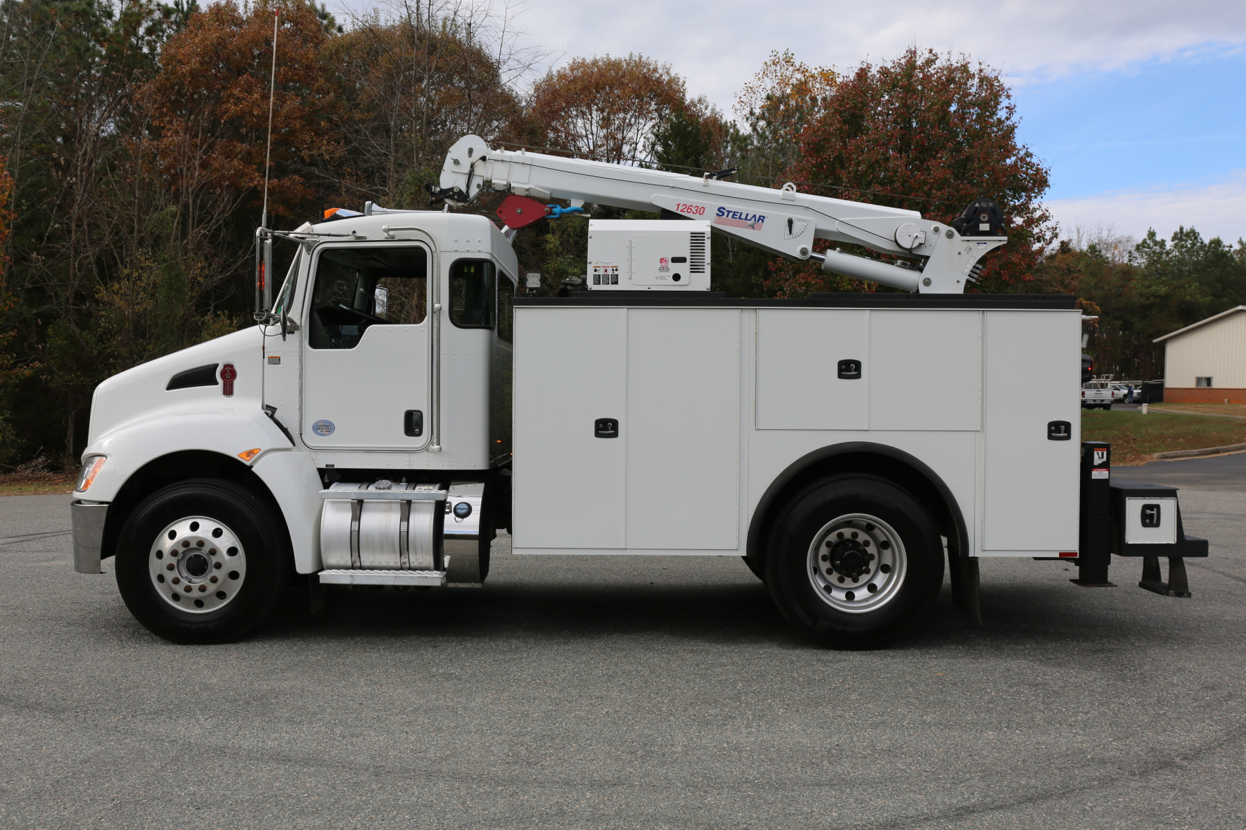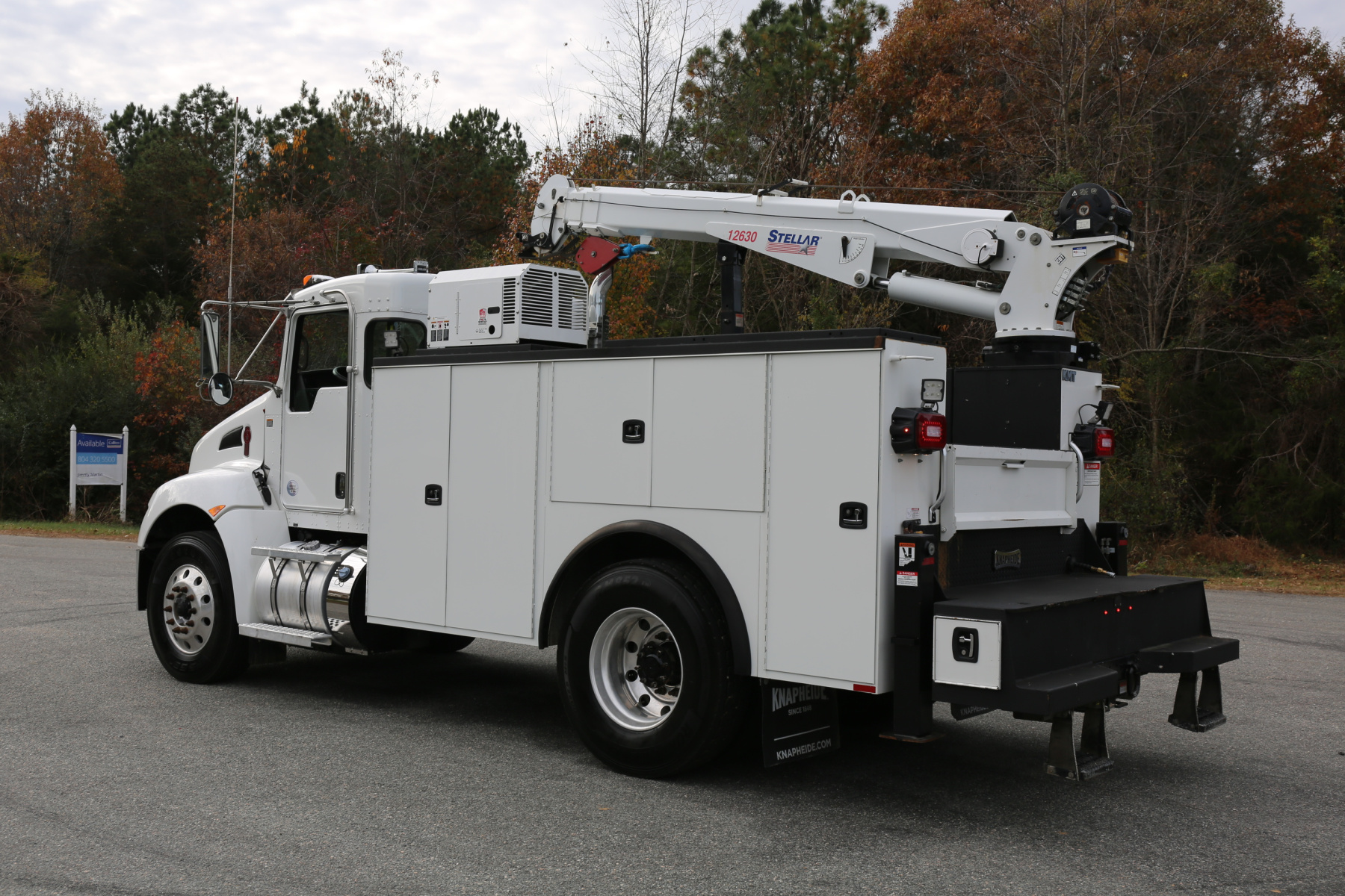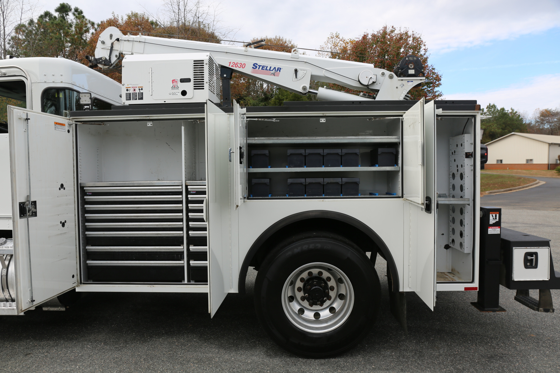 Equipped with an 11′ Knapheide service body, a Stellar 12630 crane, a Boss BA440 hydraulic compressor, two sets of CTech drawers, and hydraulic outriggers. All of the equipment operates as it should.