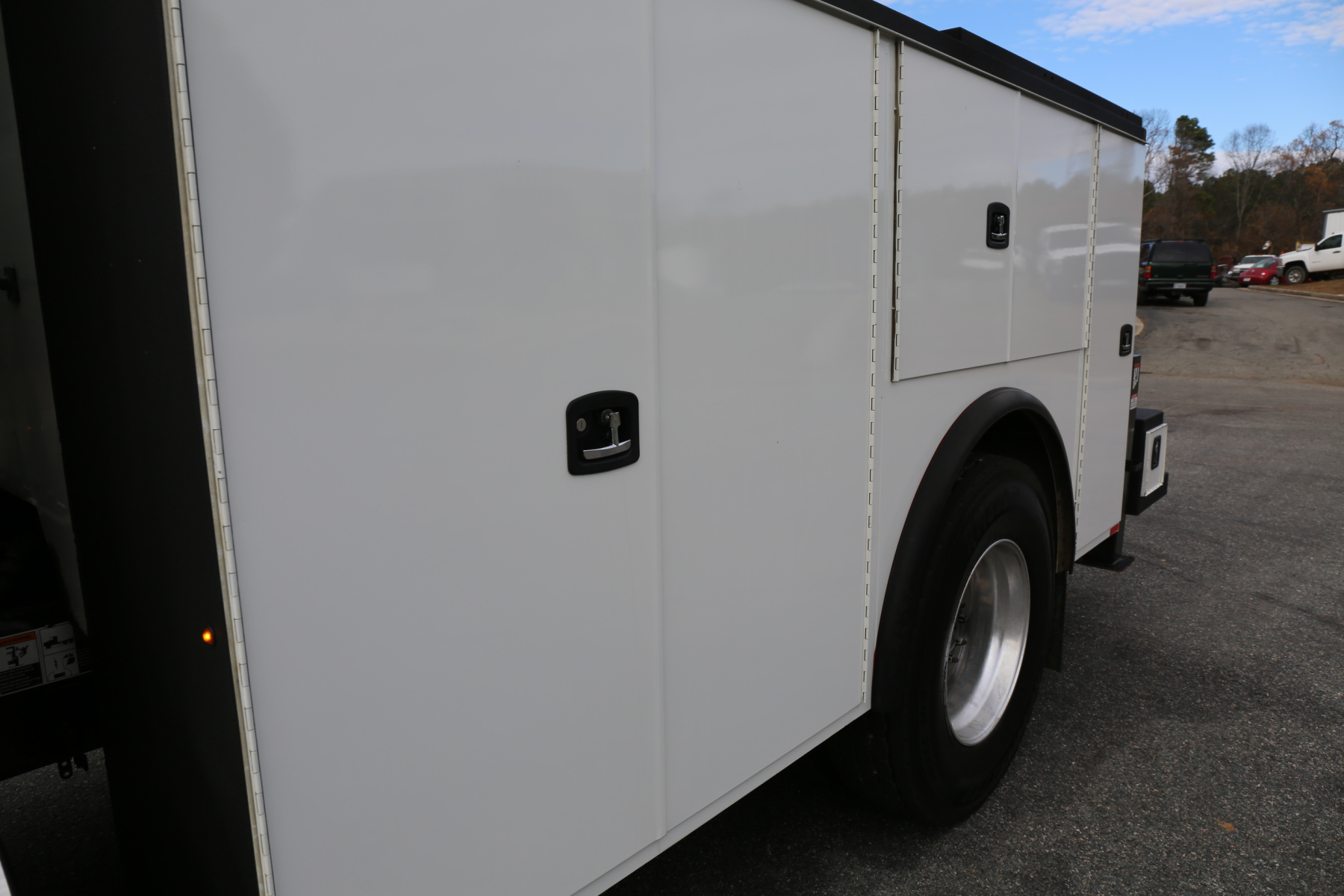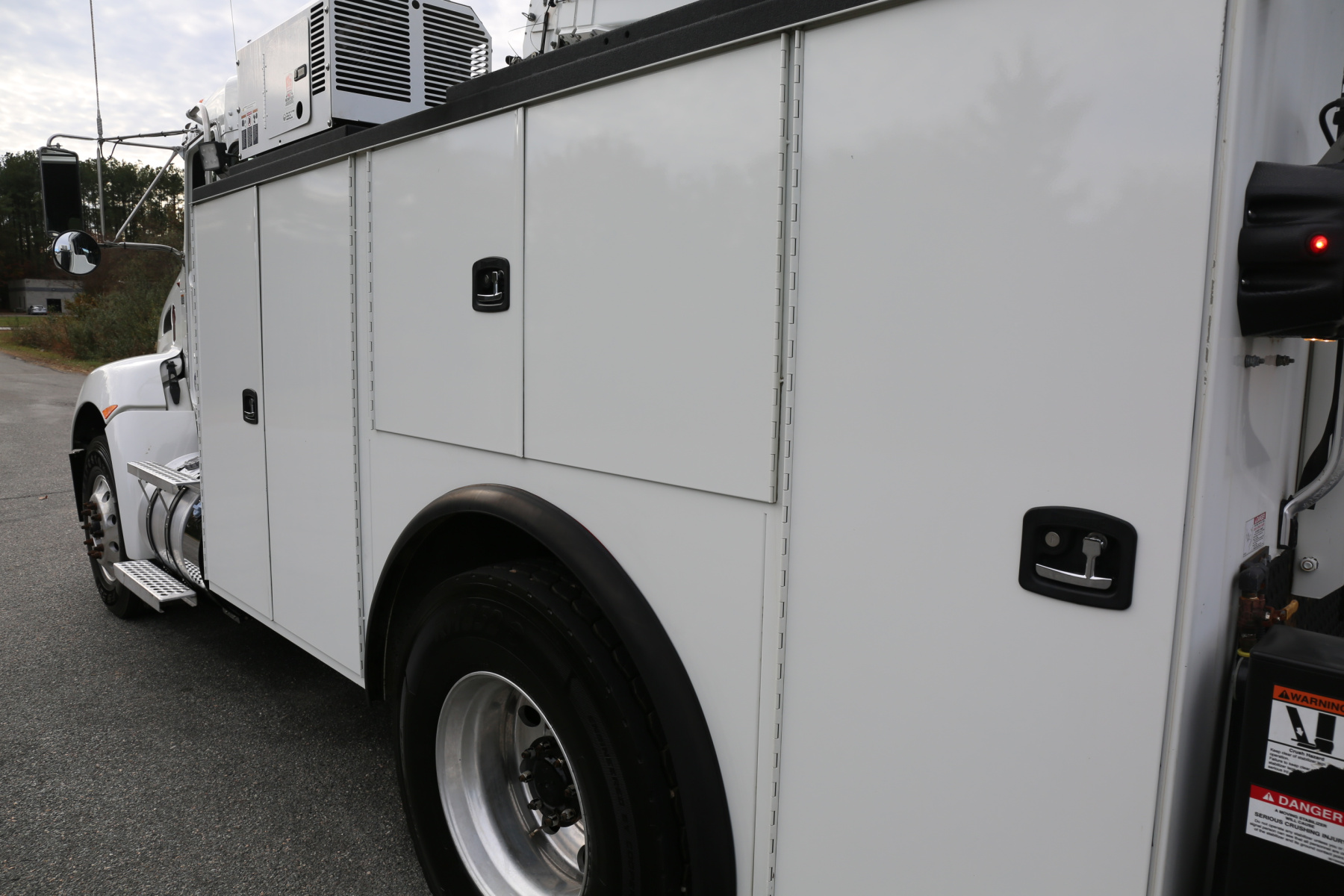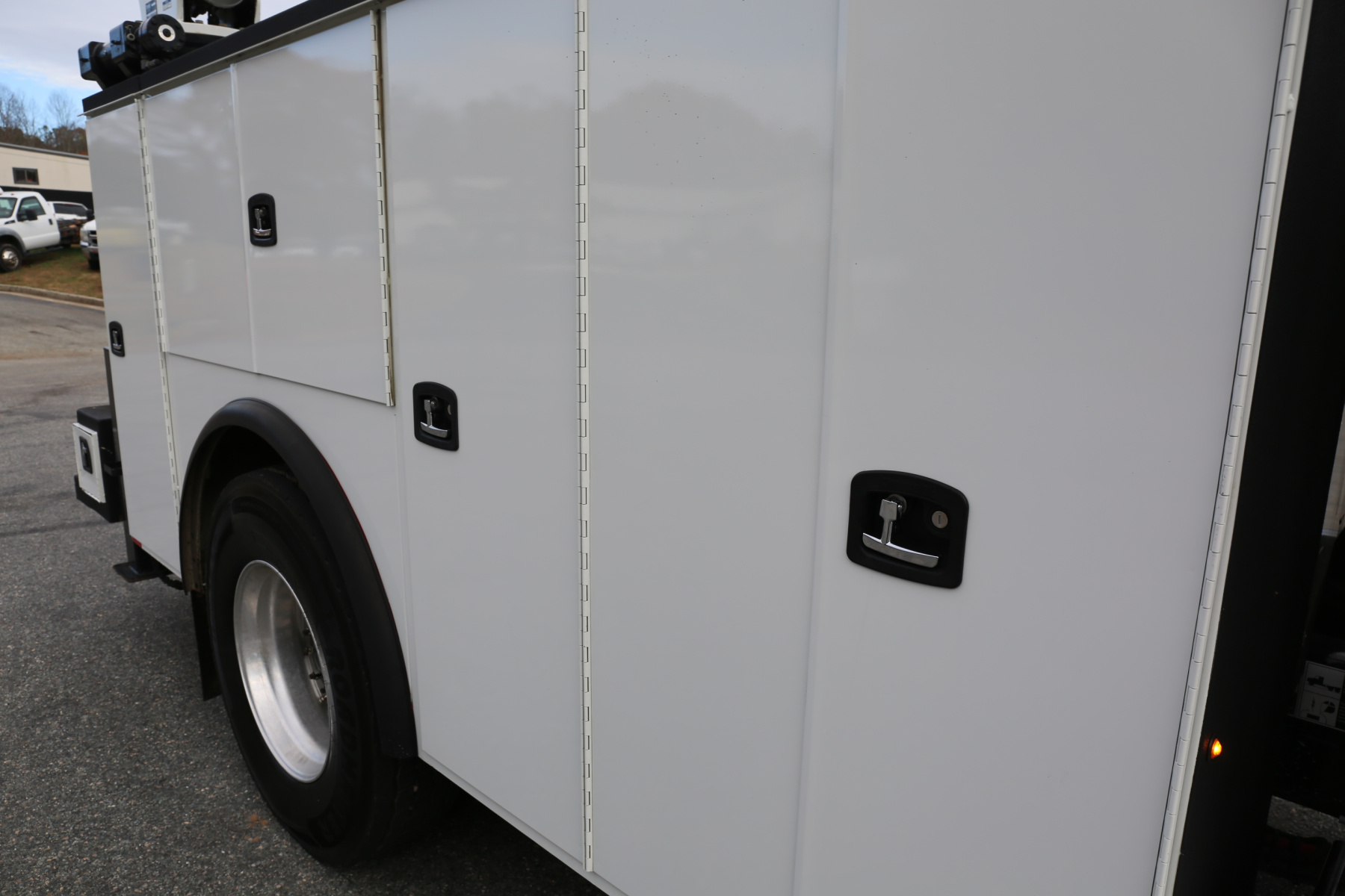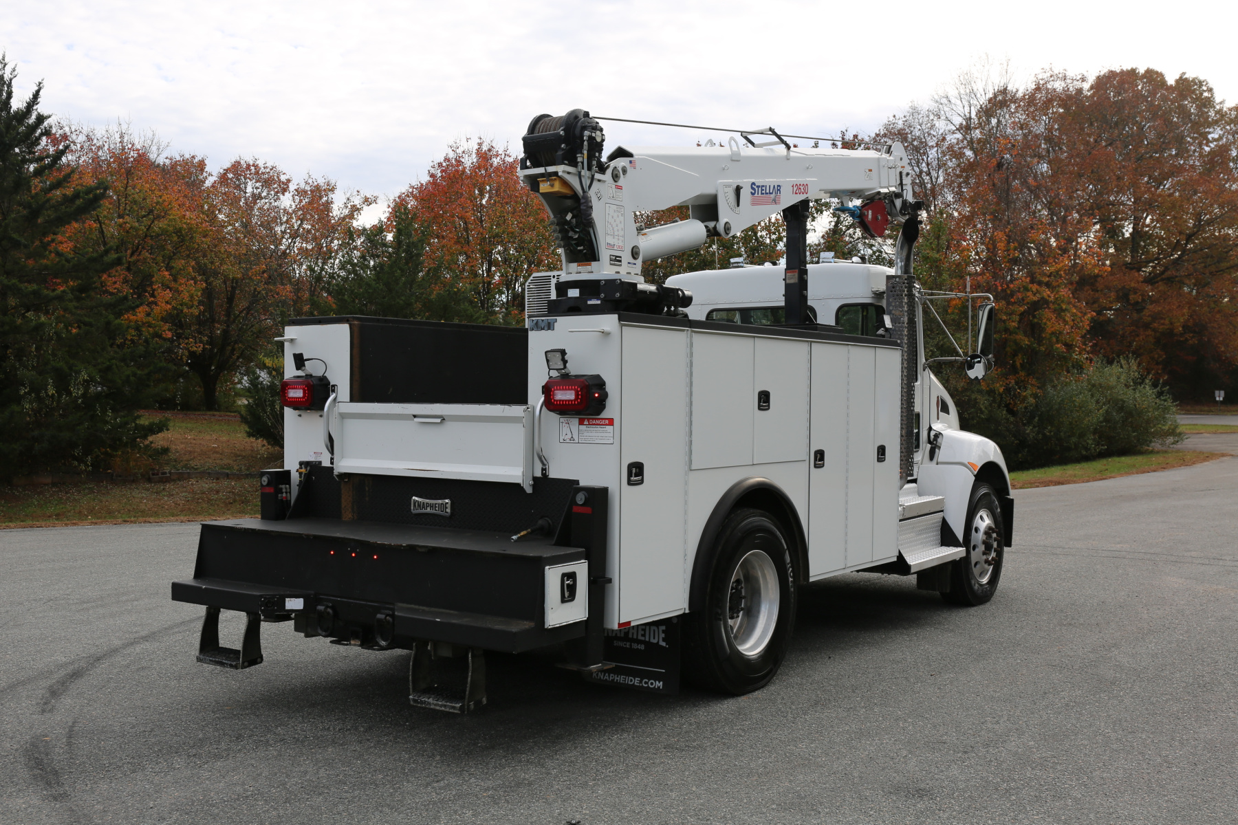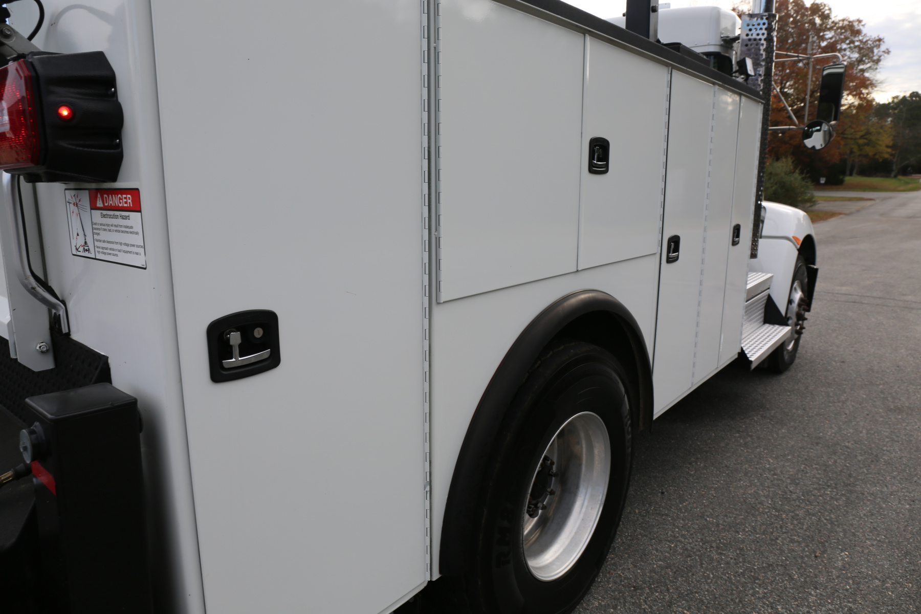 Work bench rear bumper with pass through storage compartment underneath, a tow hitch receiver, hydraulic outriggers, and rear strobes in the taillights. Master sliding locks on the rear to lock both bedsides. Factory welder mount on the top of the driver rear compartment.