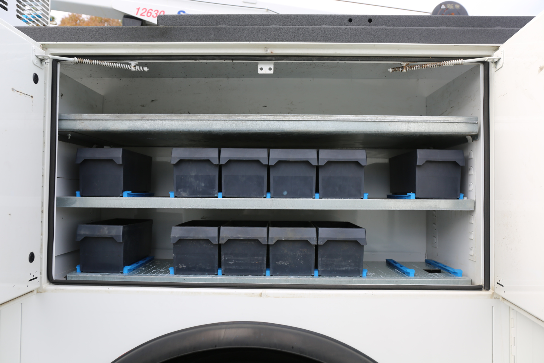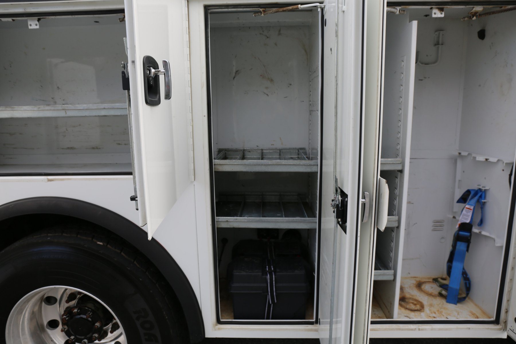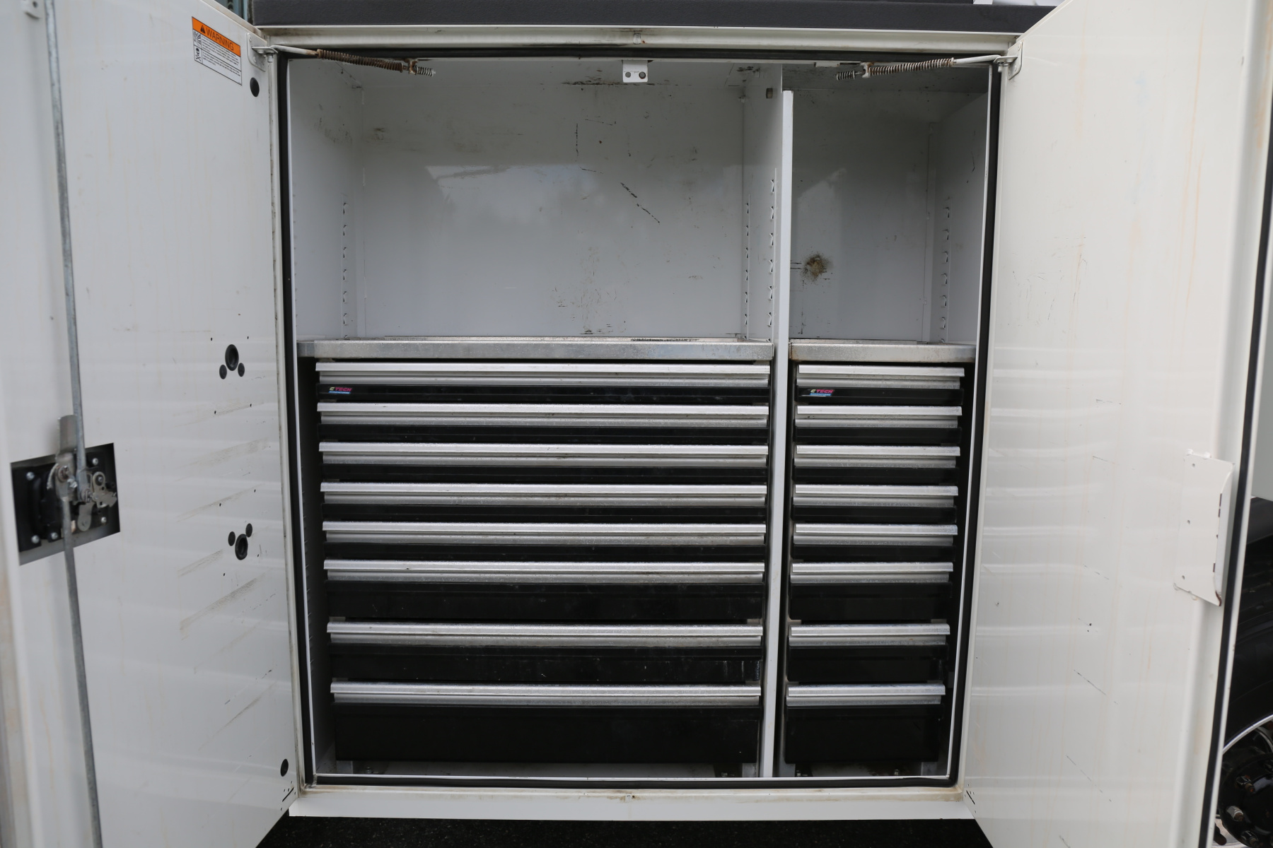 The D1 compartment has a full set of CTech drawers, eight total, with a shelf over top. The D2 compartment has another set of eight CTechs, with a shelf. A set of 16 bolt drawers over the driver wheel well, with a shelf. One shelf in the driver rear compartment.