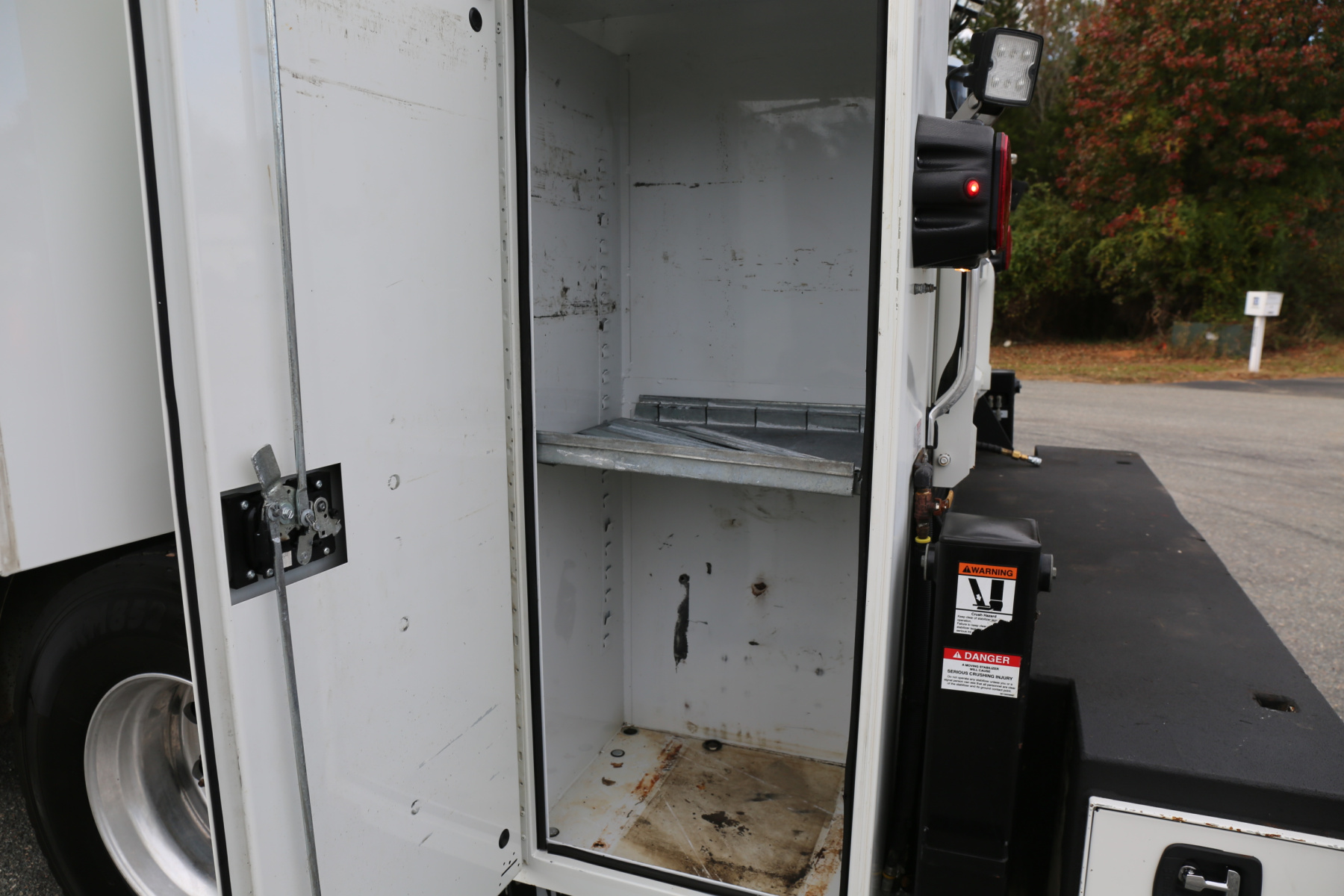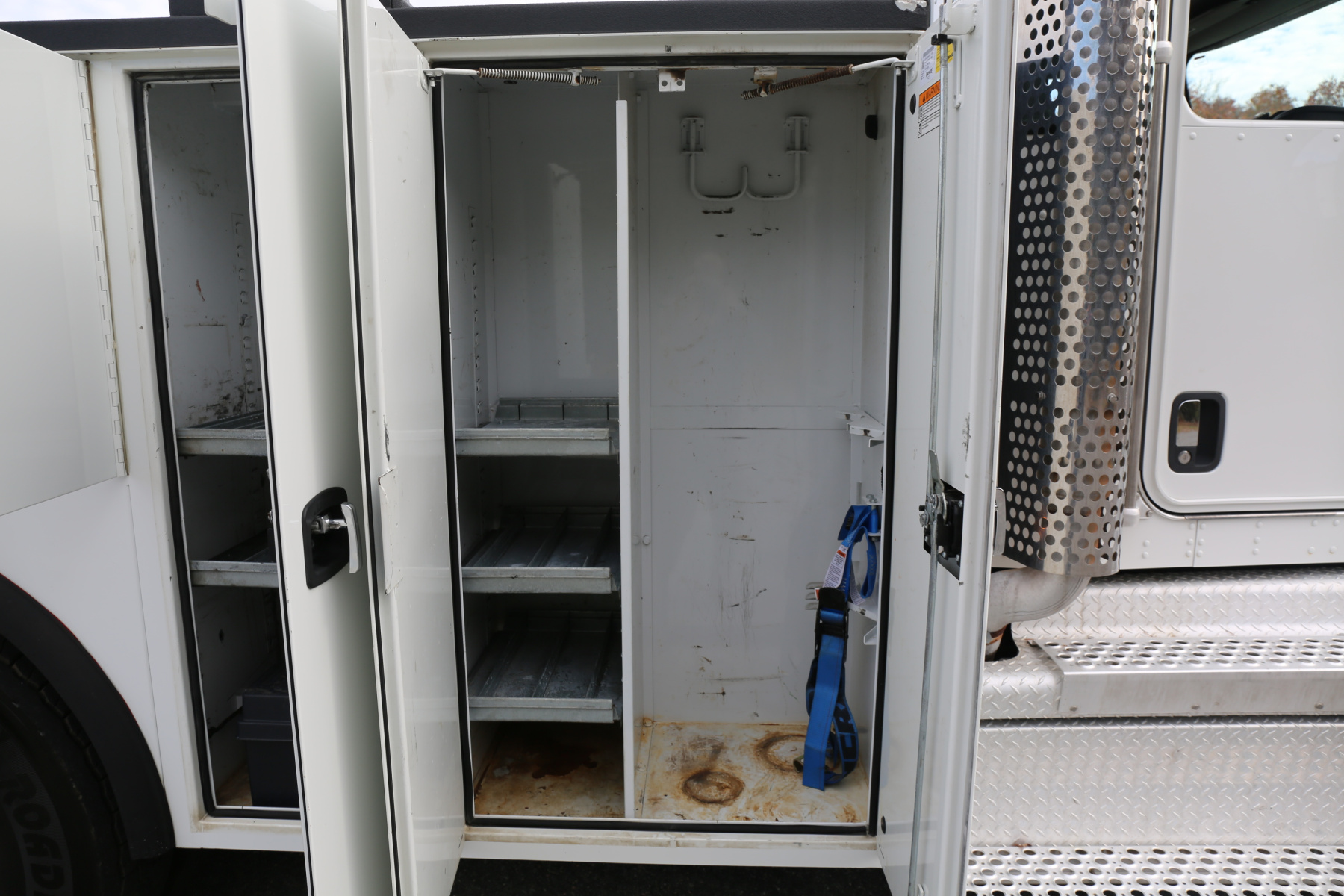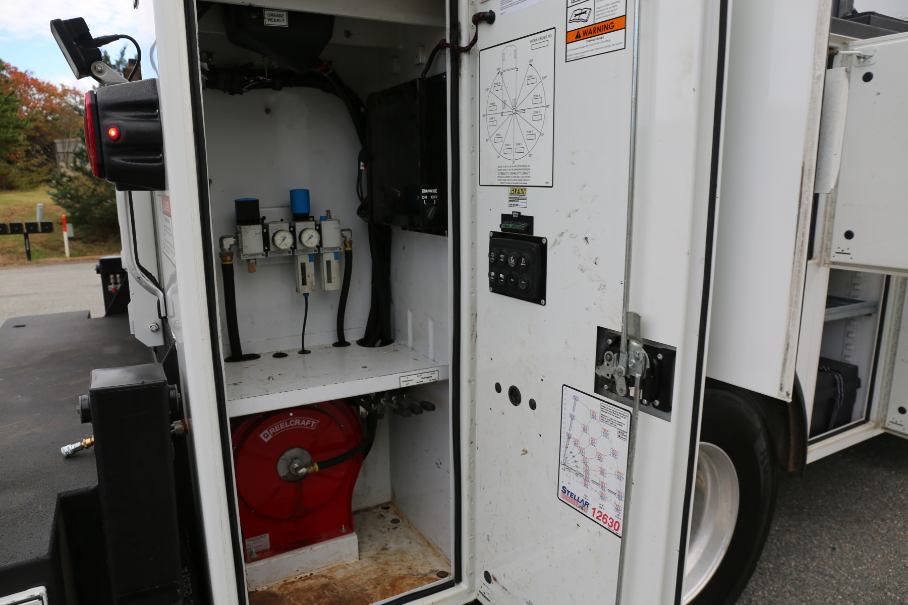 The crane compartment houses a Reelcraft hose reel, has one shelf, air regulator and drier, and a body control panel to control the bed lighting. One shelf over the passenger wheel well. Two shelves in the P2 compartment, with the truck batteries in the floor. Three shelves in the P1 compartment, with torch bottle racks and straps along the front wall.