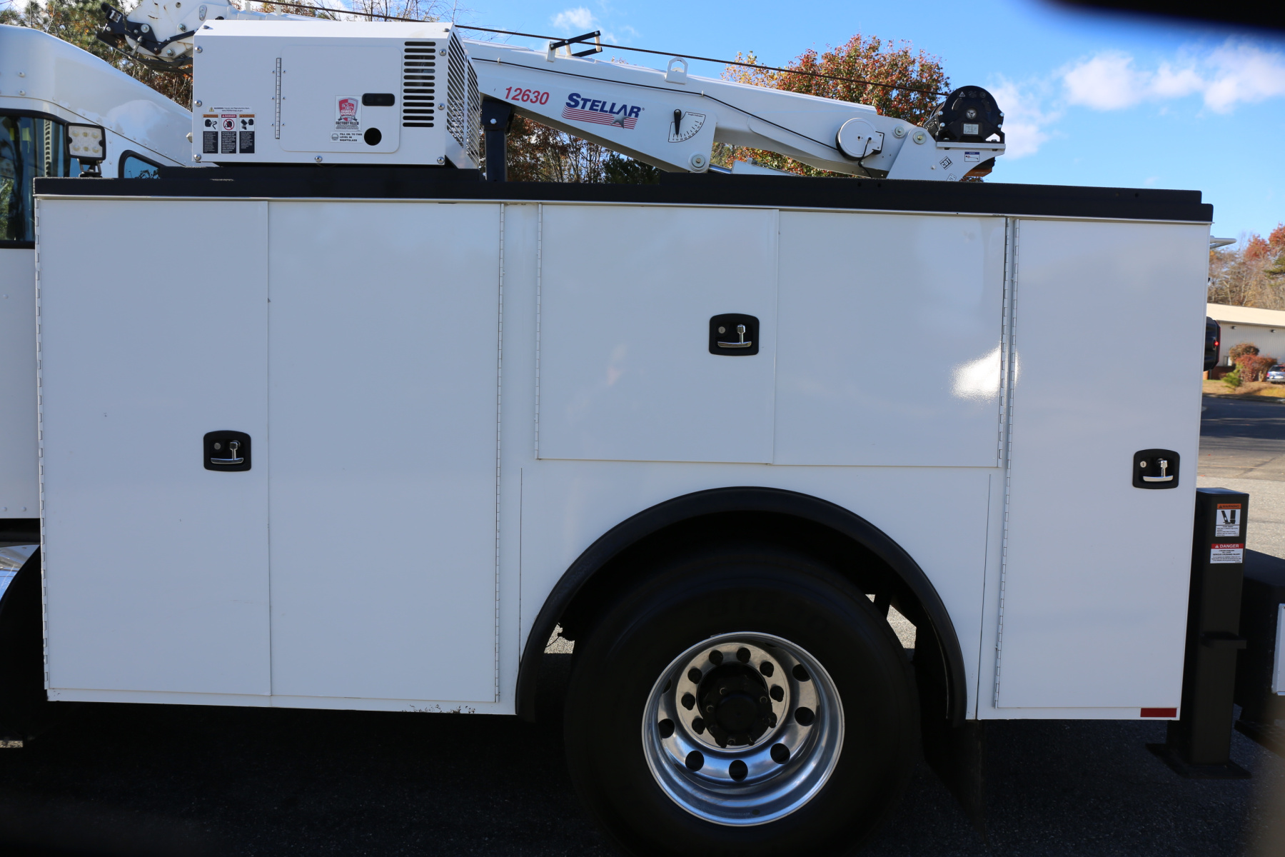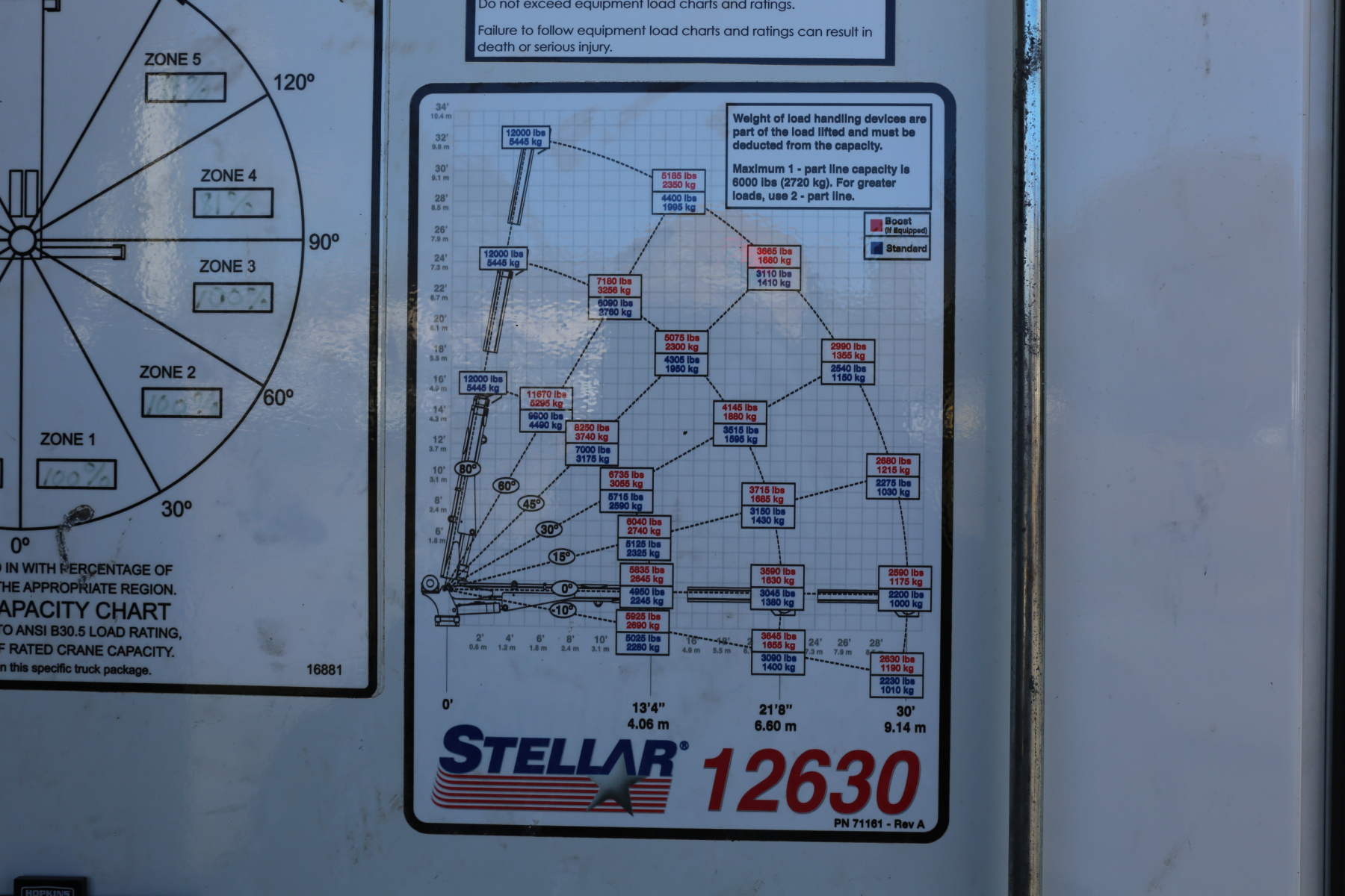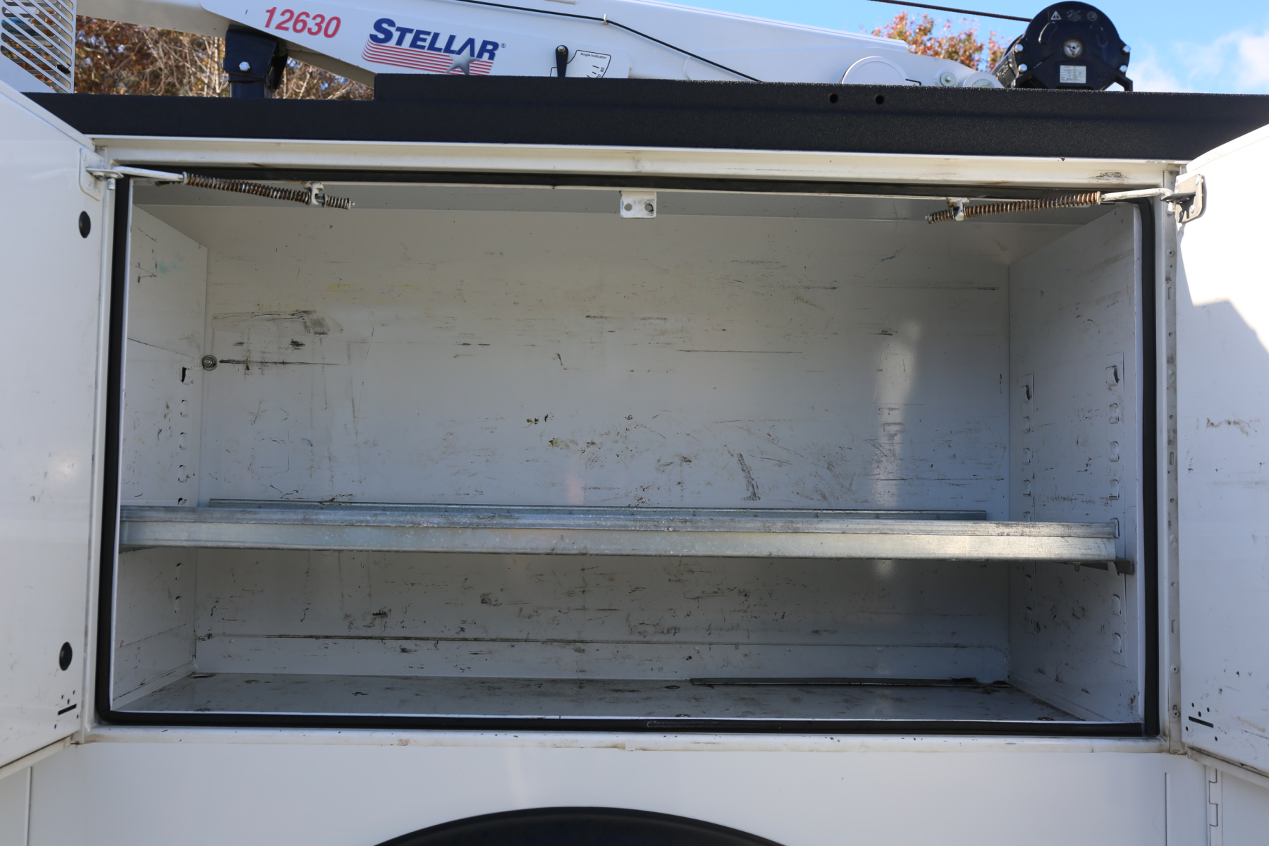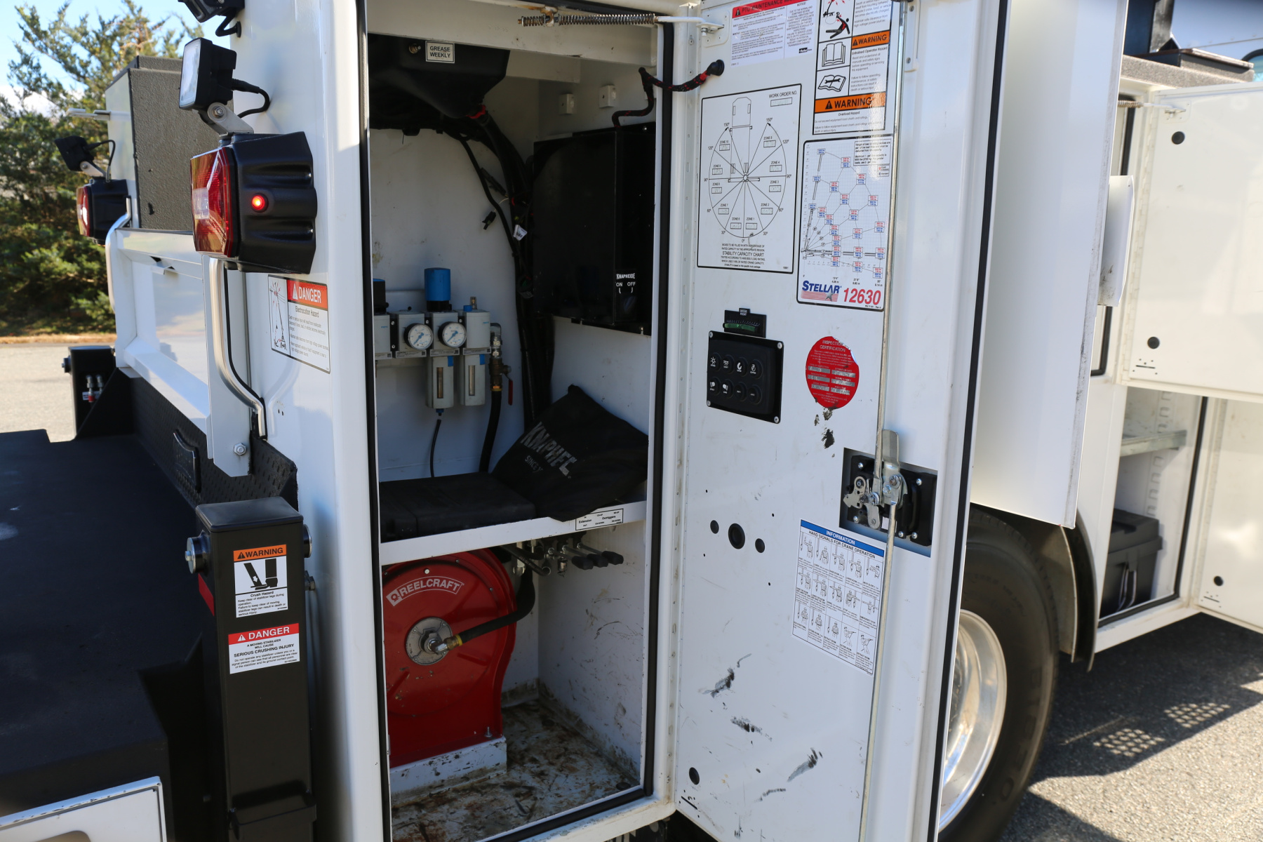 The crane is a Stellar 12630, with a 12,000# maximum lifting capacity and a two stage hydraulic extension out to 30′ of total reach. Run off a factory wireless remote, the remote controls the compressor and is also able to turn the truck on and off.