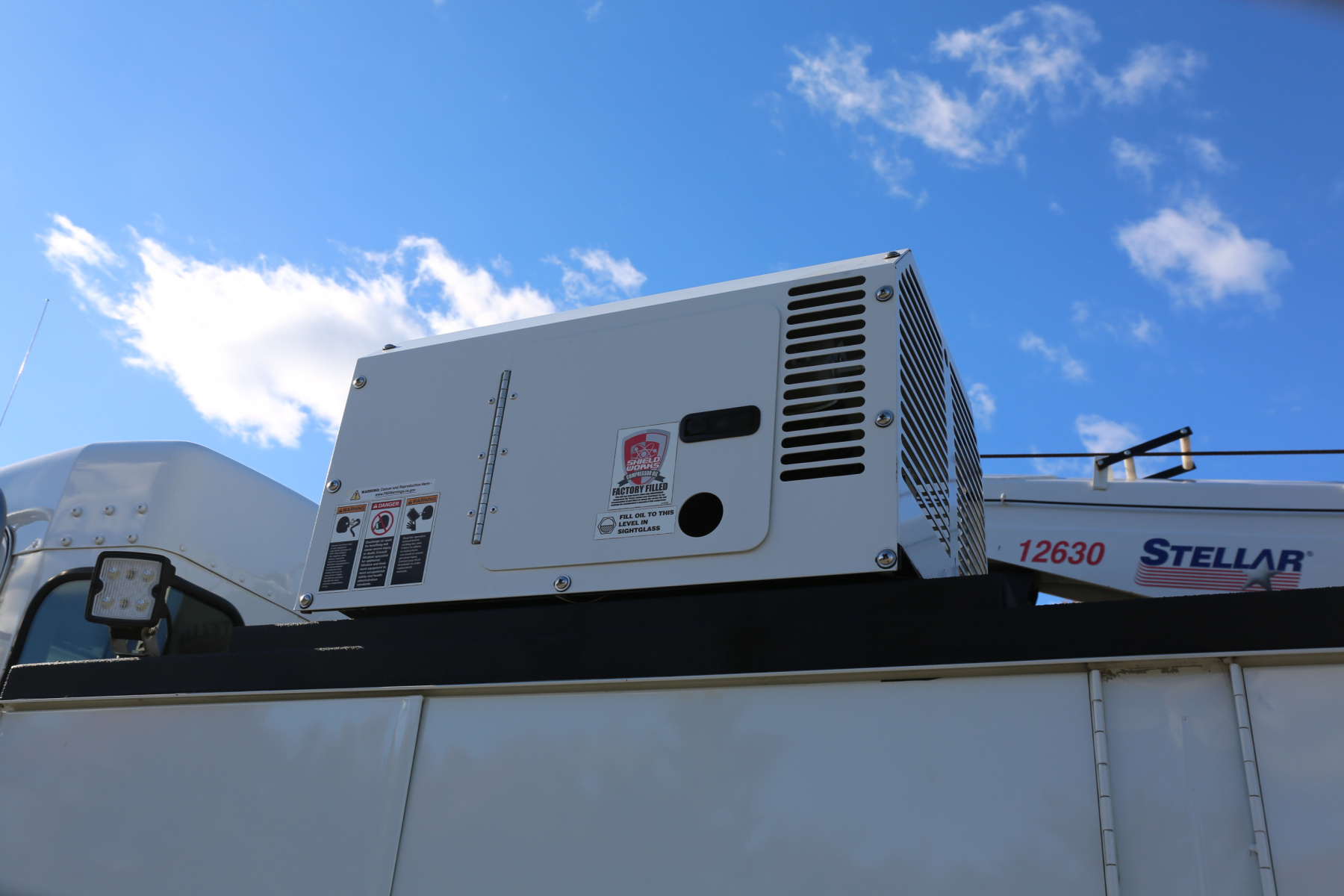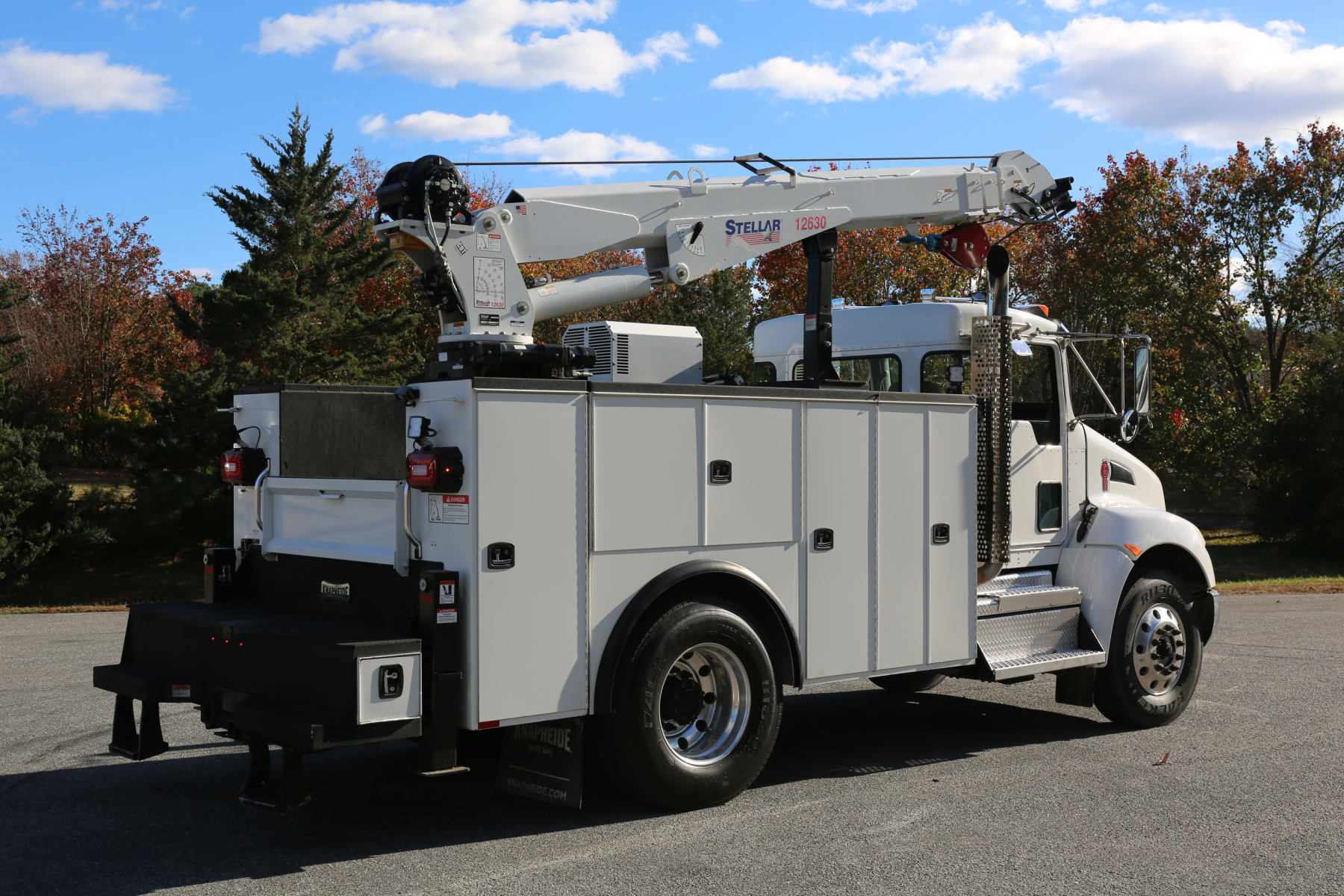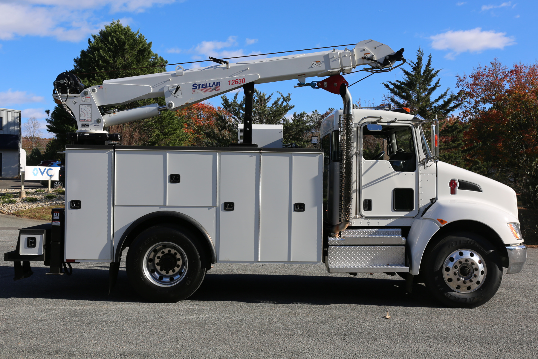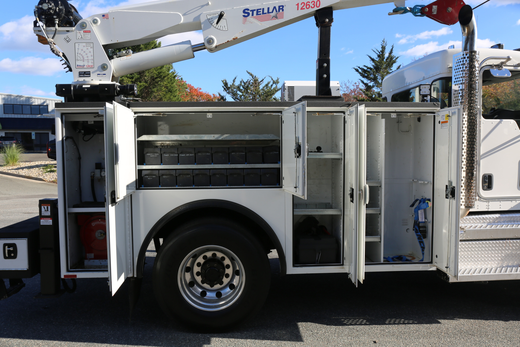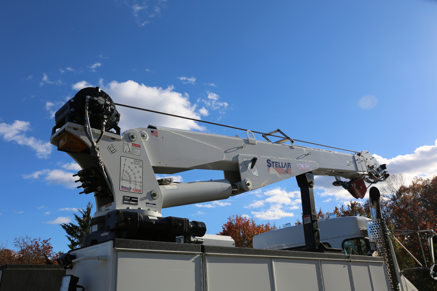 The crane is a Stellar 12630, with a 12,000# maximum lifting capacity and a two stage hydraulic extension out to 30′ of total reach. Run off a factory wireless remote, the remote controls the compressor and is also able to turn the truck on and off.