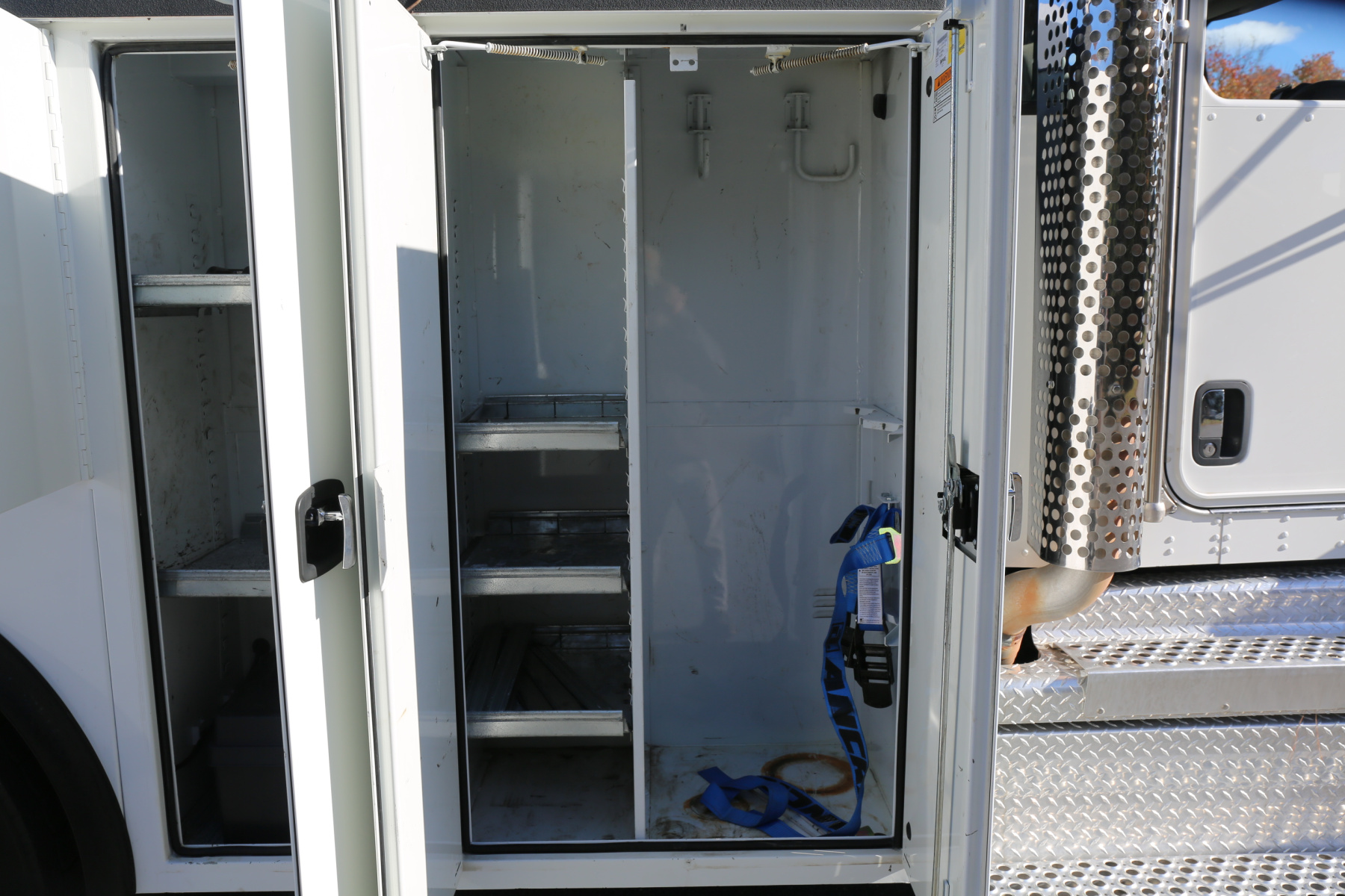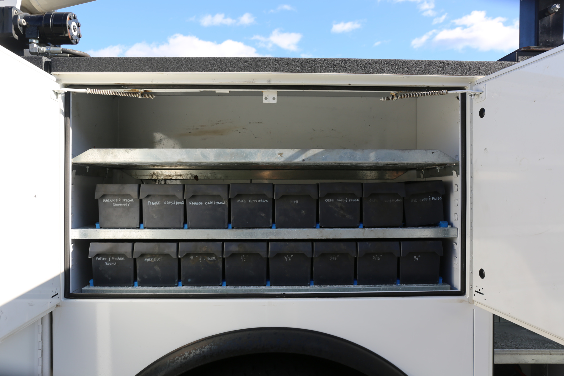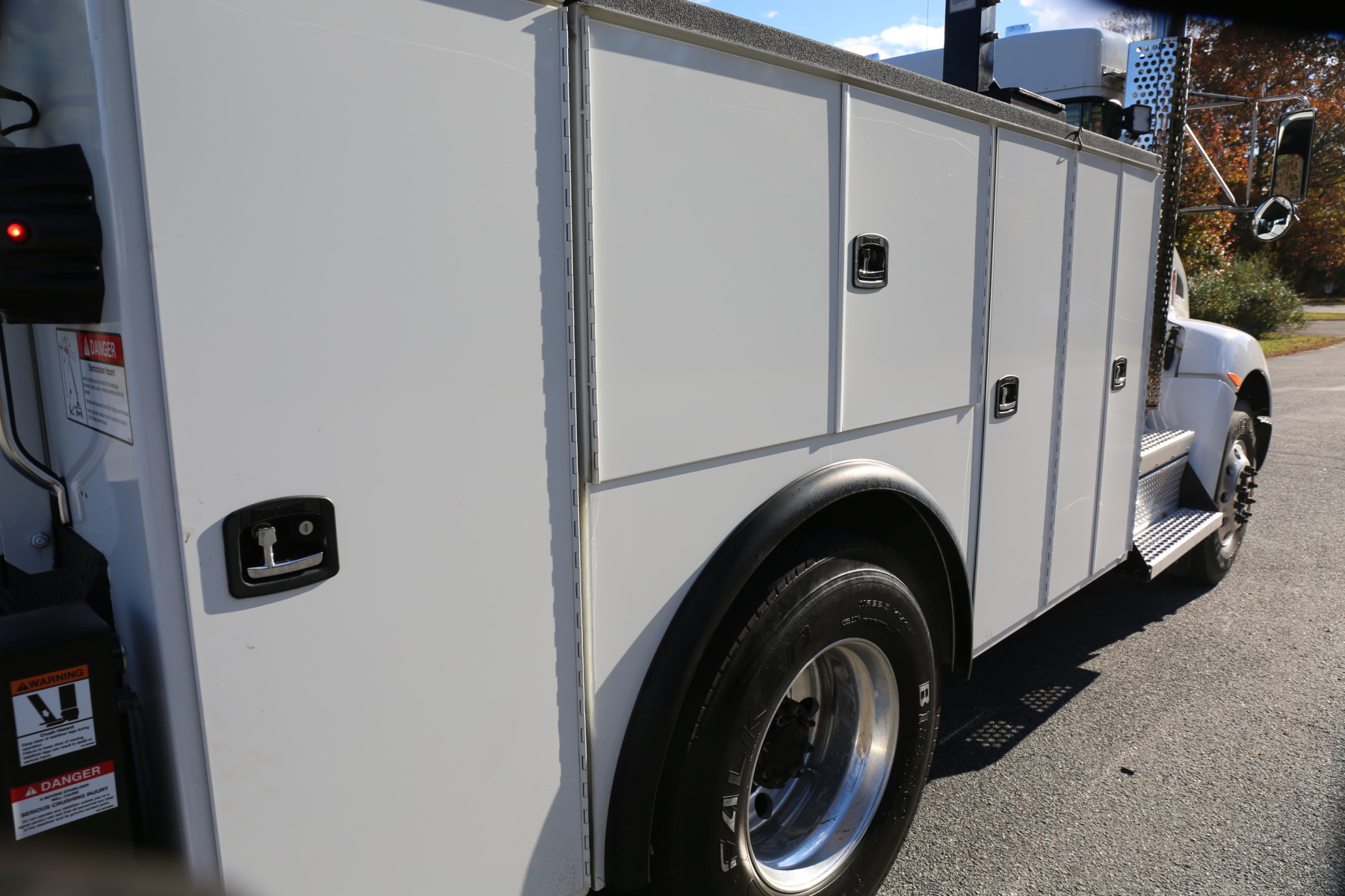 The bed is an 11′ Knapheide mechanics body in excellent condition overall. Zero rust, minimal rock chipping, no major dents or scratches. Factory paint intact and in good condition. All of the doors close, latch, lock, and seal as they should. All bins are watertight. Interior LED compartment lighting throughout, as well as exterior LED work lighting. All lighting is operational.