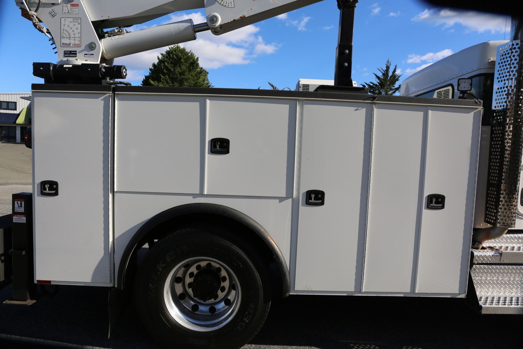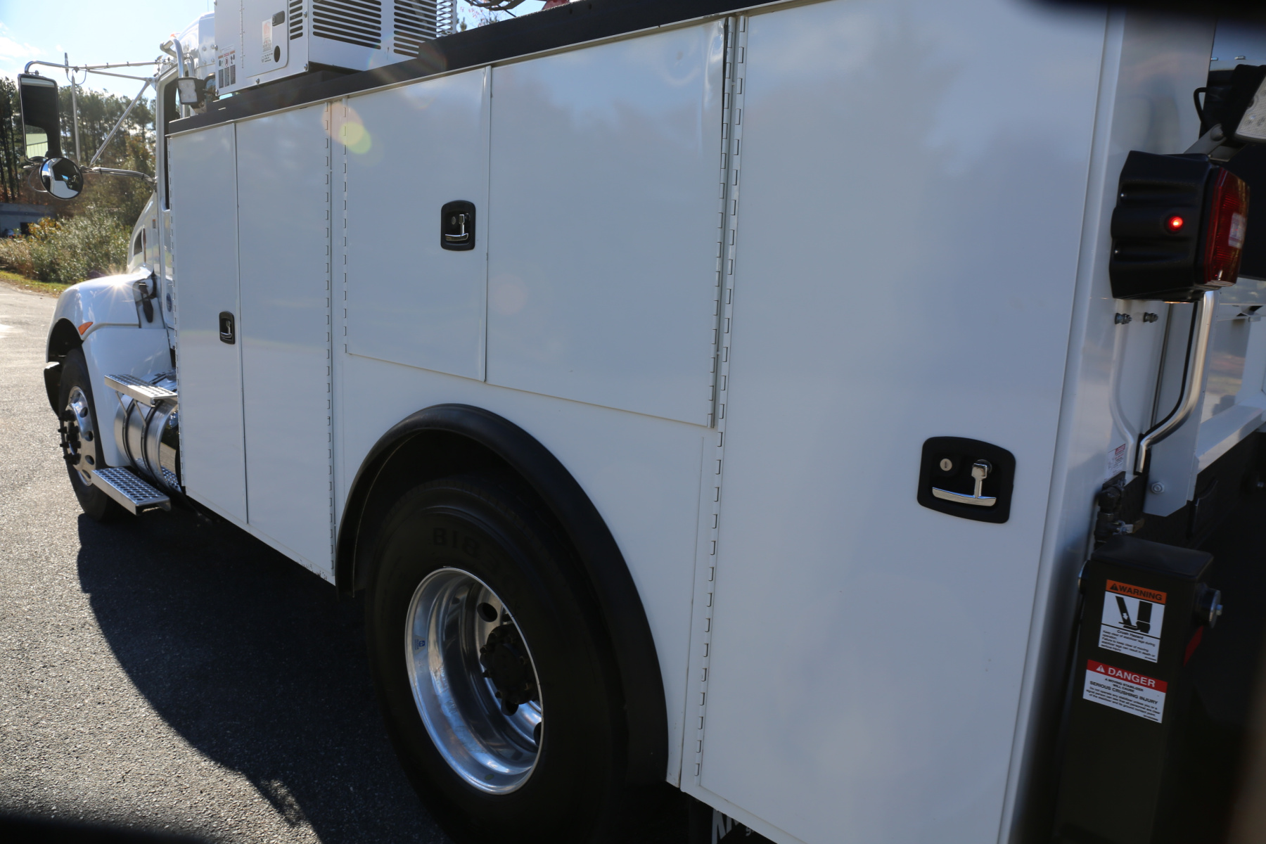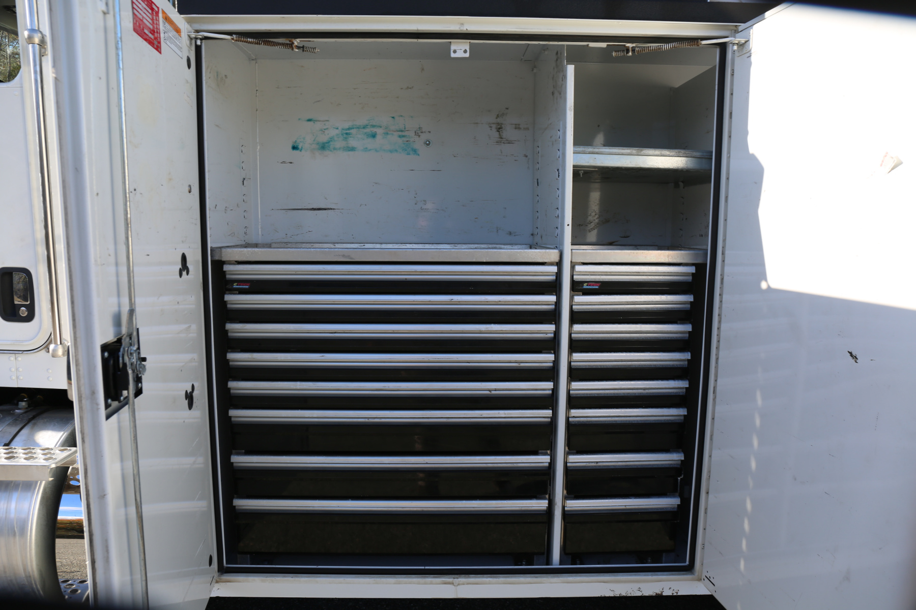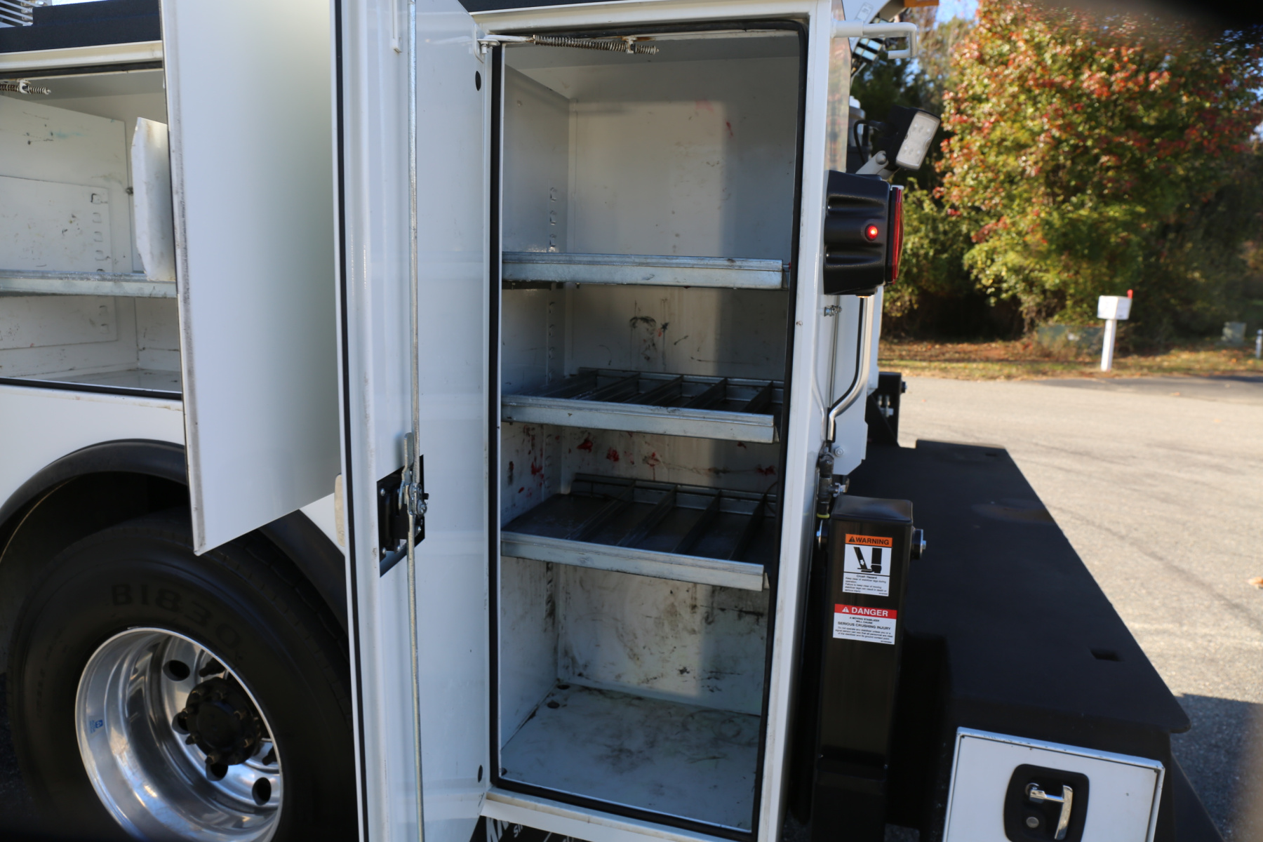 The bed is an 11′ Knapheide mechanics body in excellent condition overall. Zero rust, minimal rock chipping, no major dents or scratches. Factory paint intact and in good condition. All of the doors close, latch, lock, and seal as they should. All bins are watertight. Interior LED compartment lighting throughout, as well as exterior LED work lighting. All lighting is operational.