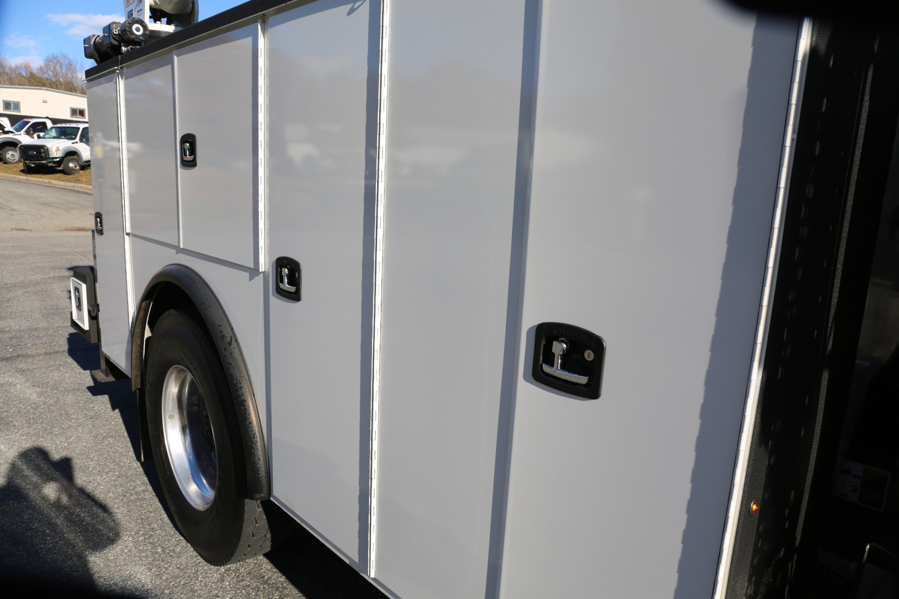 Work bench rear bumper with pass through bin storage underneath. Master slide locks for the bins, tow hitch receiver, and hydraulic outriggers. Factory mounted bracket for a welder on the driver rear cabinet.