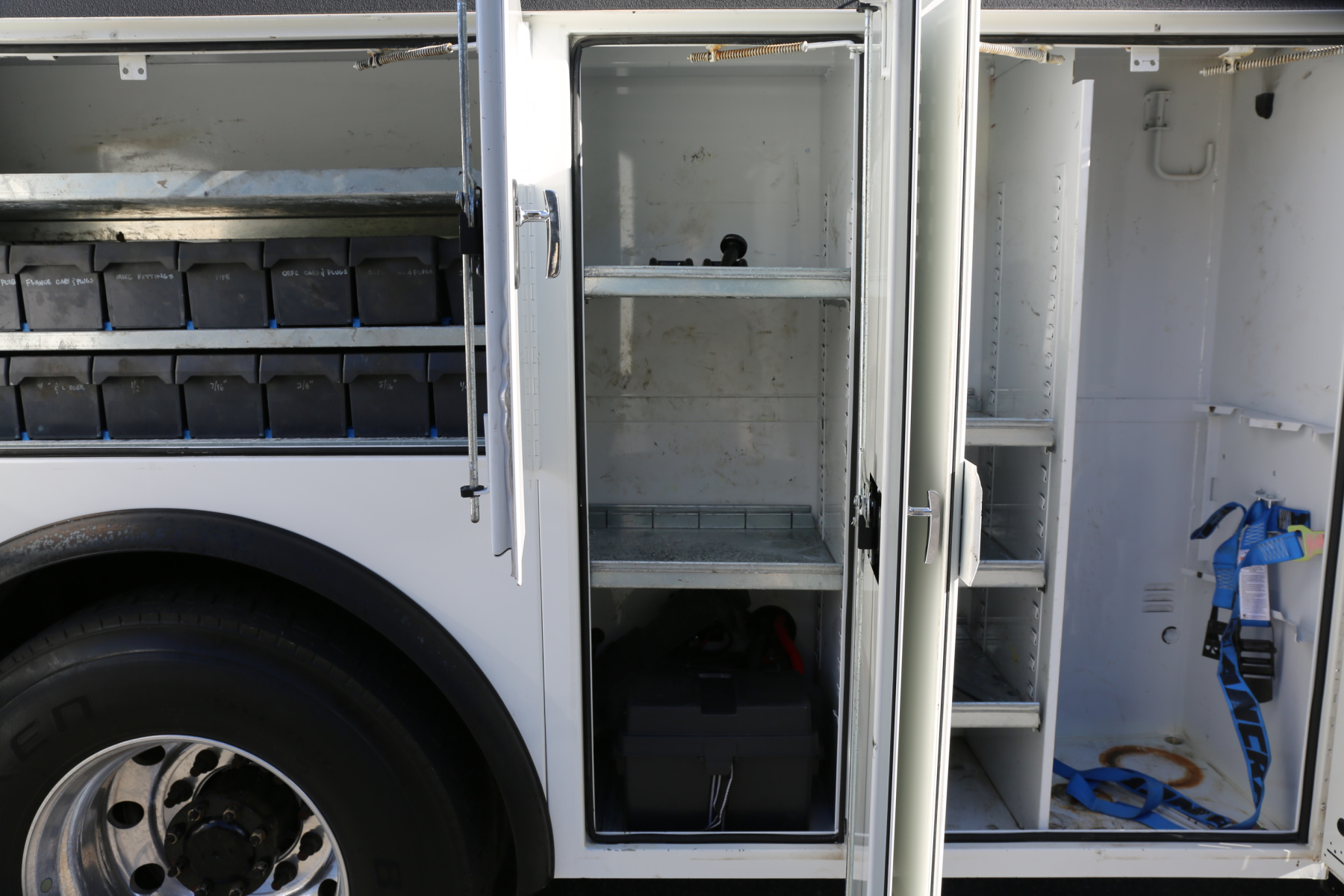 The passenger wheel well compartment has a full set of bolt drawers, 16 total, with an additional shelf over top. Two shelves in the P2 compartment, with the truck batteries located in the bottom. Three more shelves in the P1 compartment, as well as torch bottle racks and straps.
