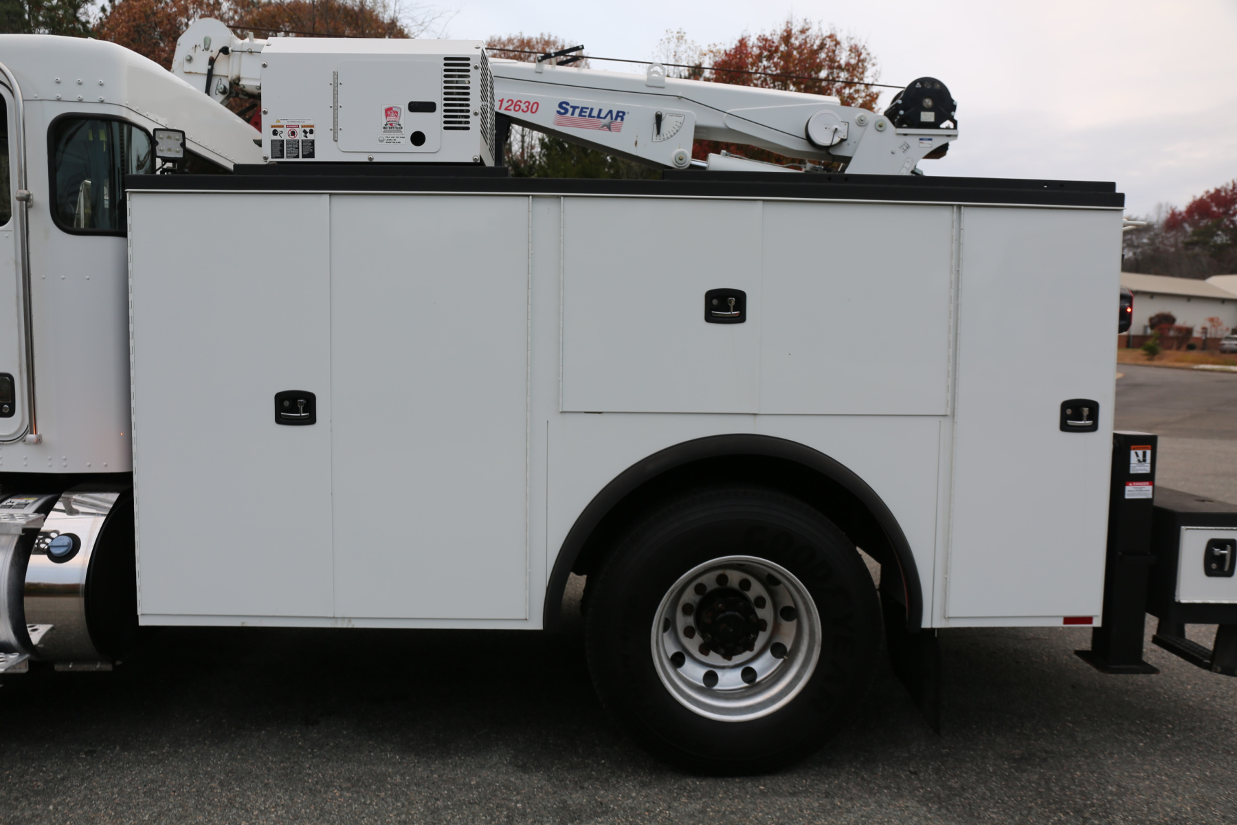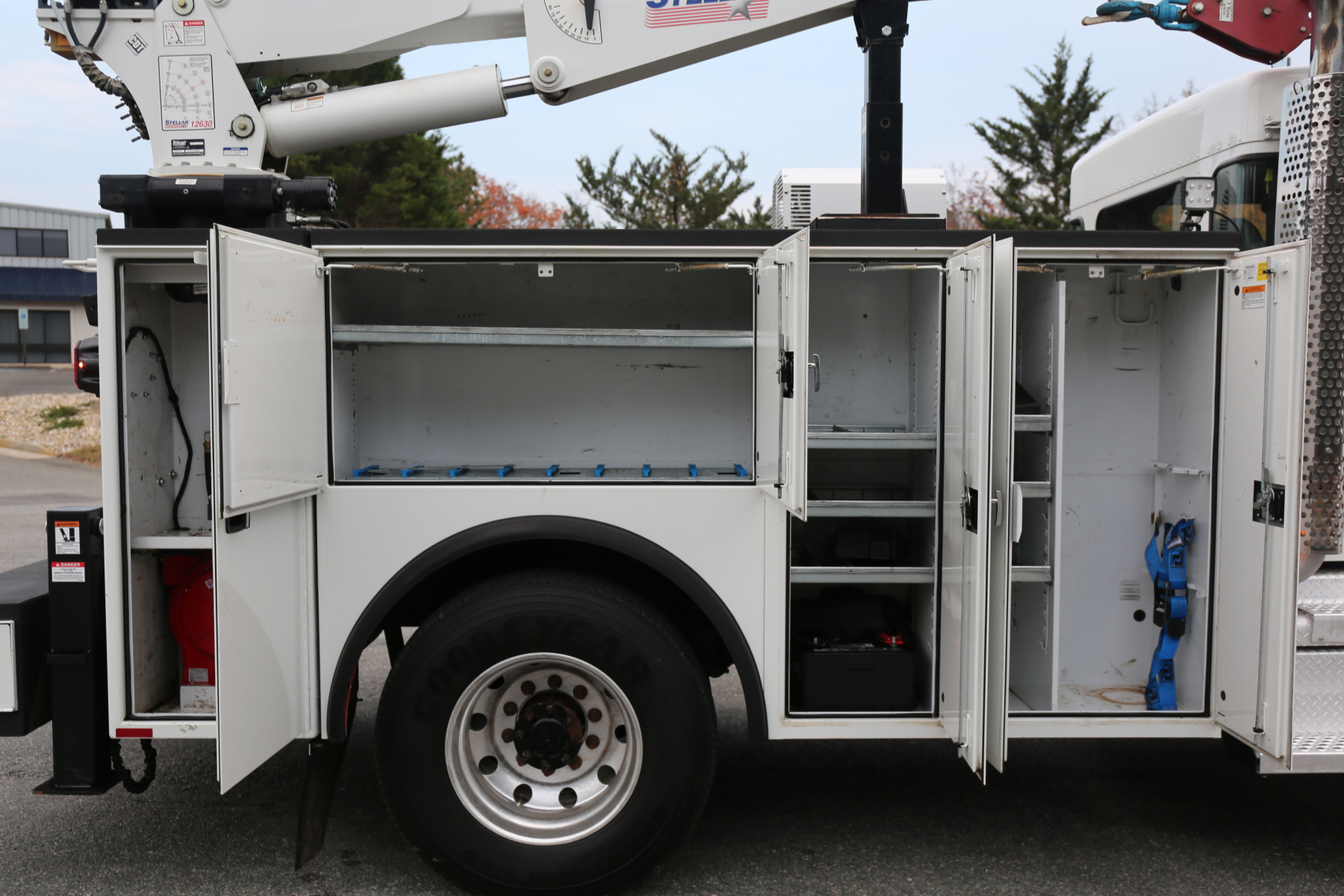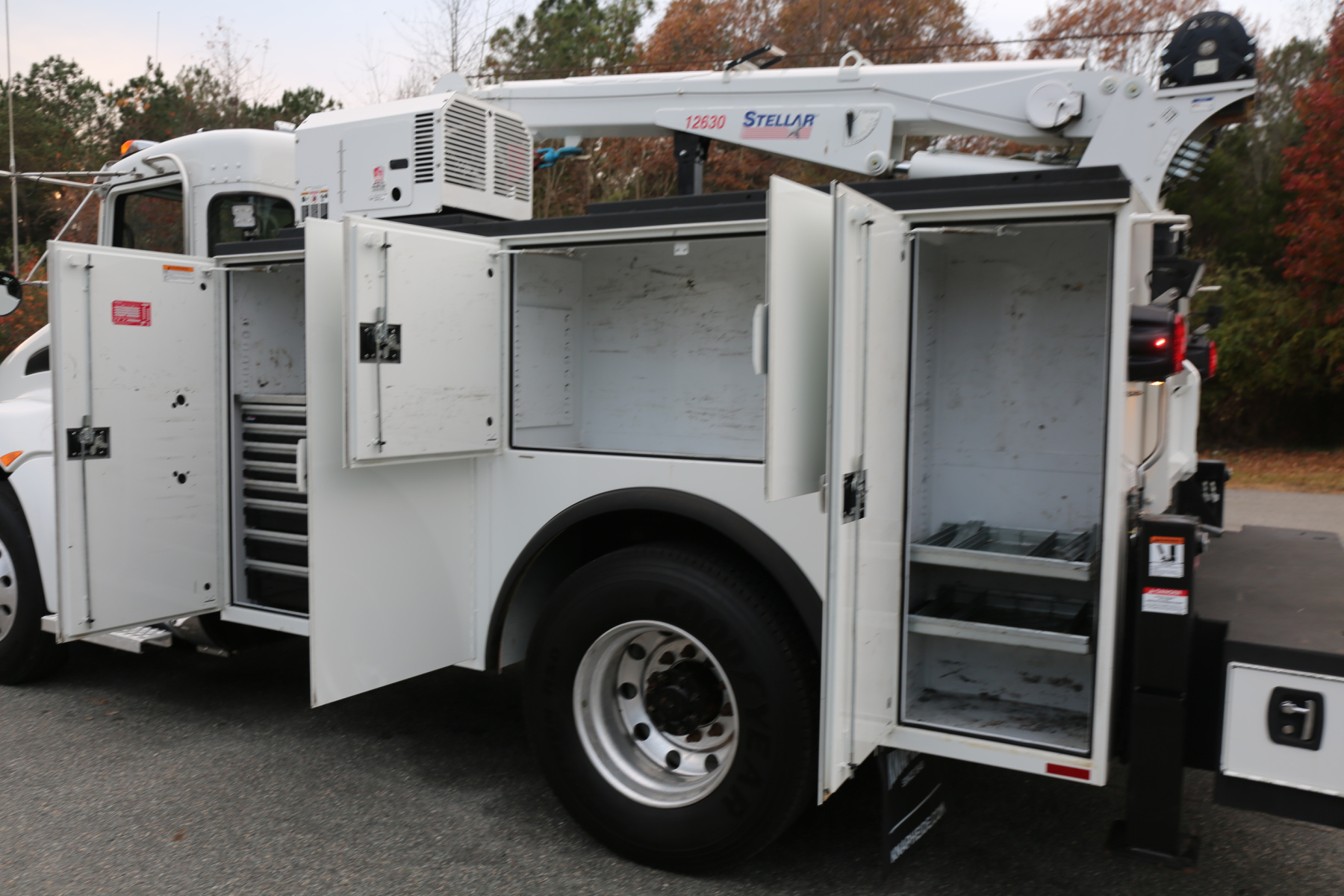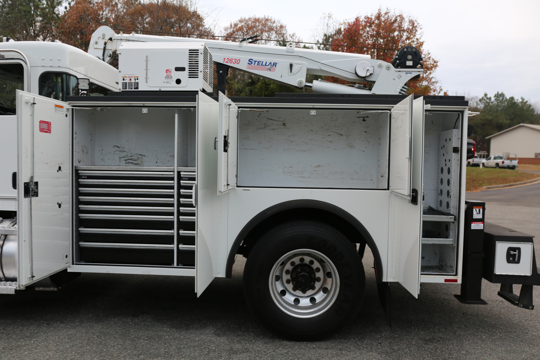 Equipped with an 11′ Knapheide service body, a Stellar 12630 crane, a Boss BA440 hydraulic compressor, hydraulic outriggers, and two sets of CTech drawers. All of the equipment works as it should.