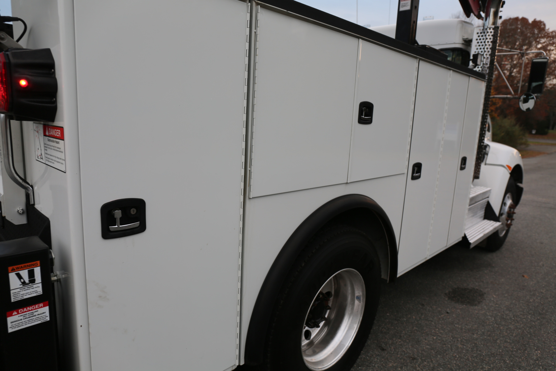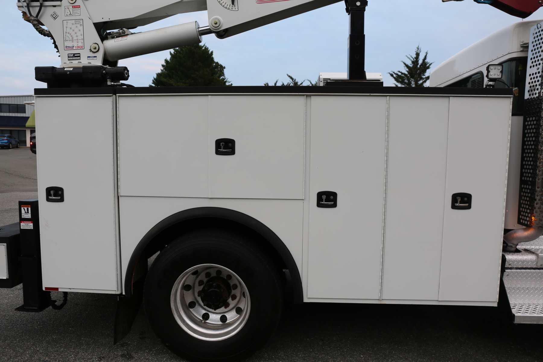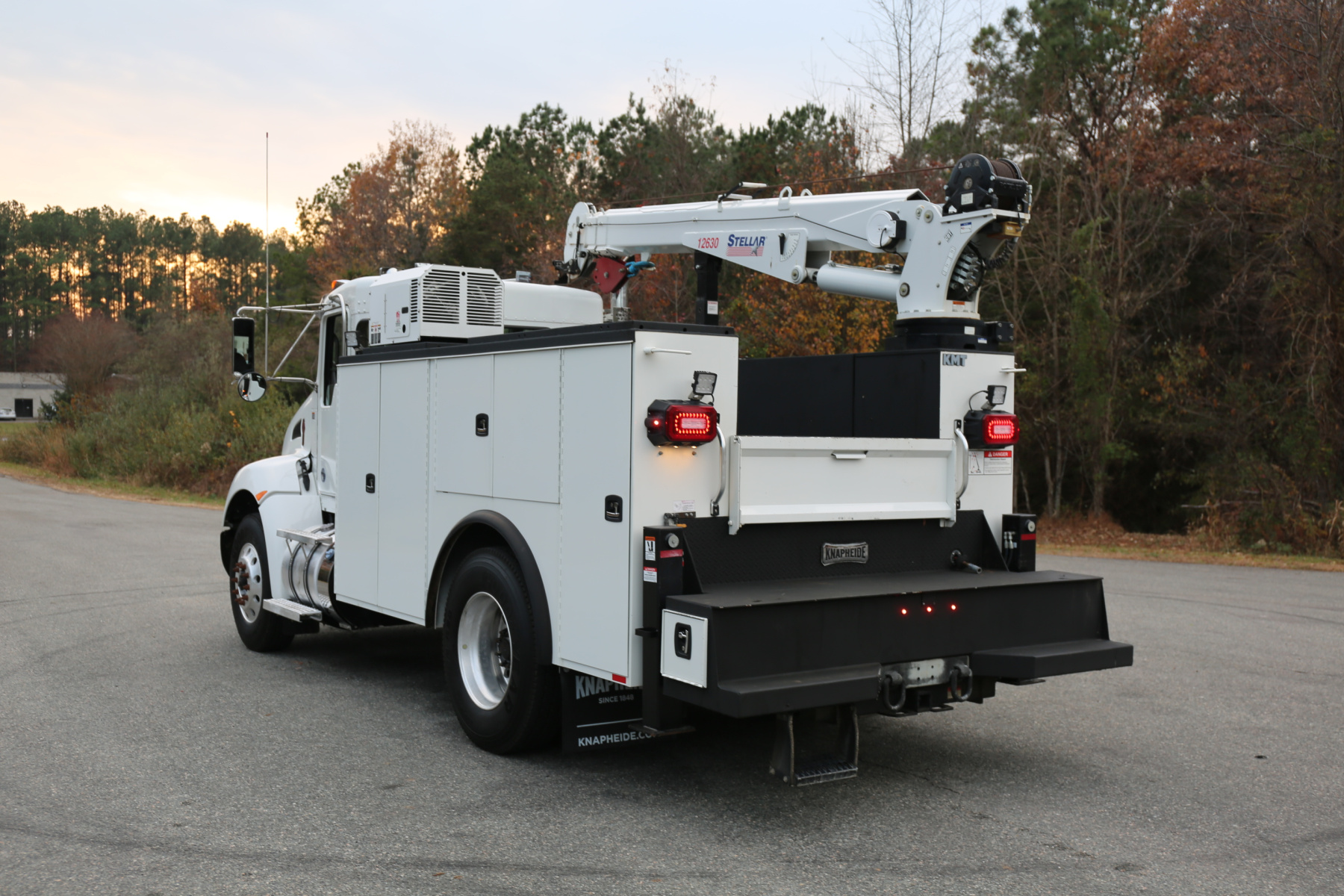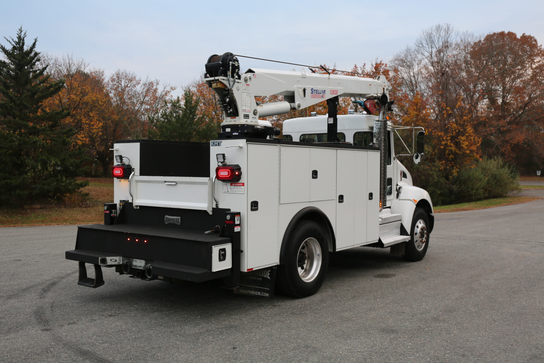 Equipped with an 11′ Knapheide service body, a Stellar 12630 crane, a Boss BA440 hydraulic compressor, hydraulic outriggers, and two sets of CTech drawers. All of the equipment works as it should.