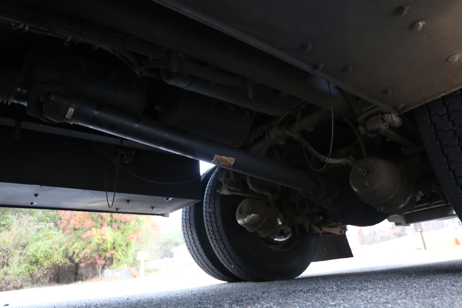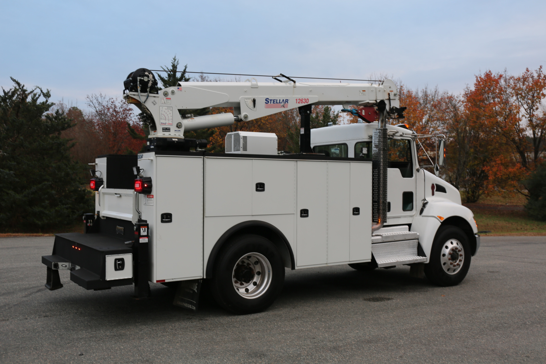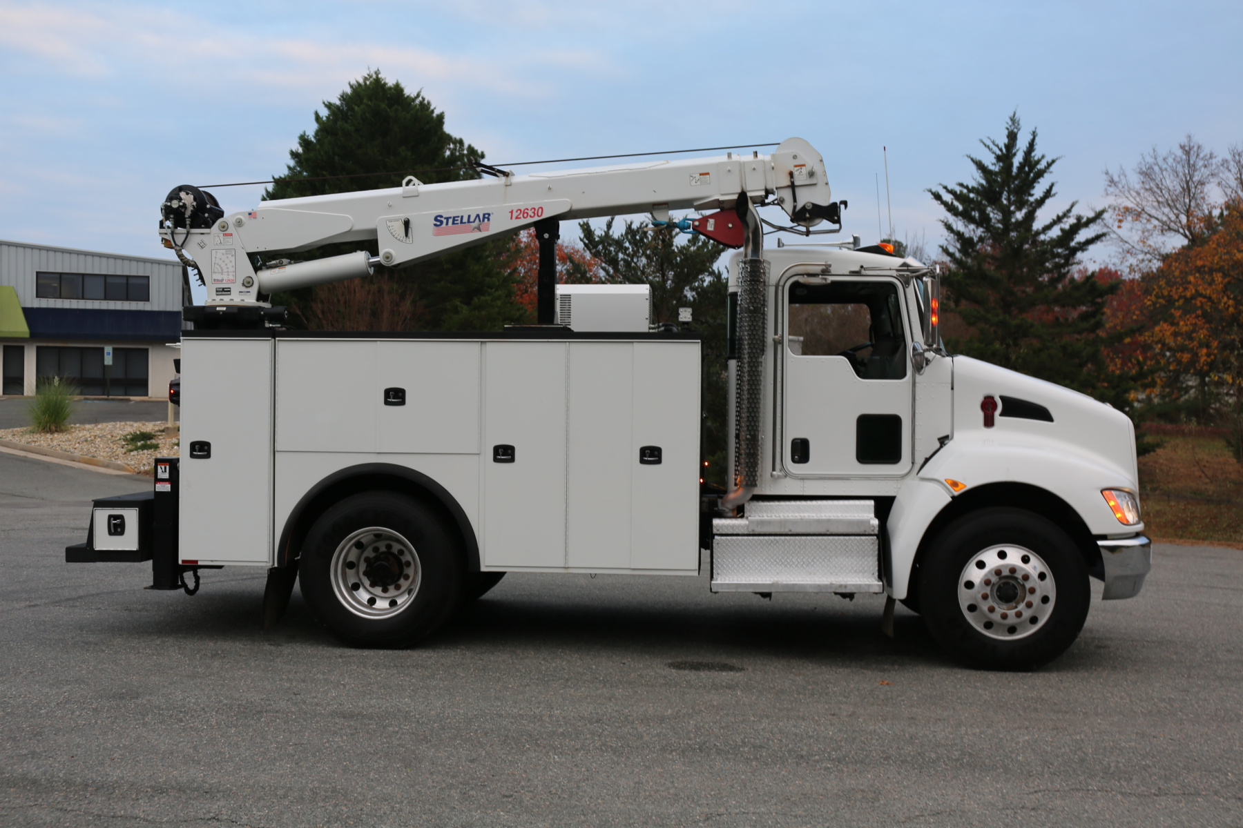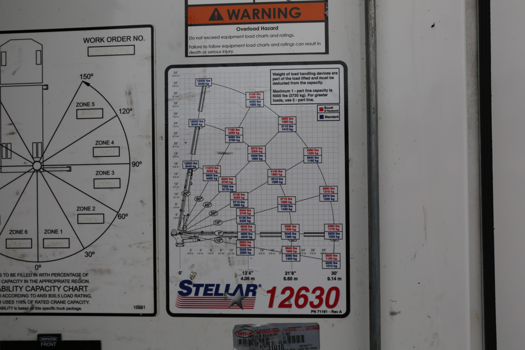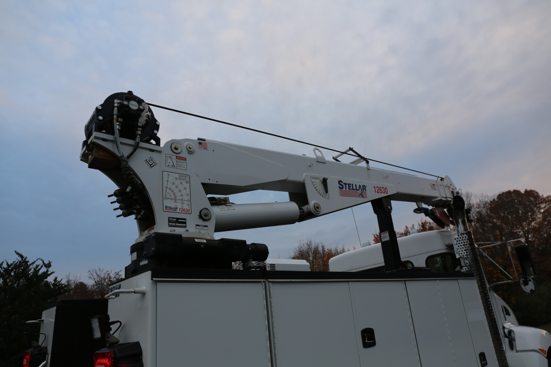 The crane is a Stellar 12630, with a 12,000# maximum lifting capacity and a two stage hydraulic reach out to 30′. 76 total hours on the crane. Run off a factory wireless remote – the remote turns the compressor on and off, and can also start and stop the truck.