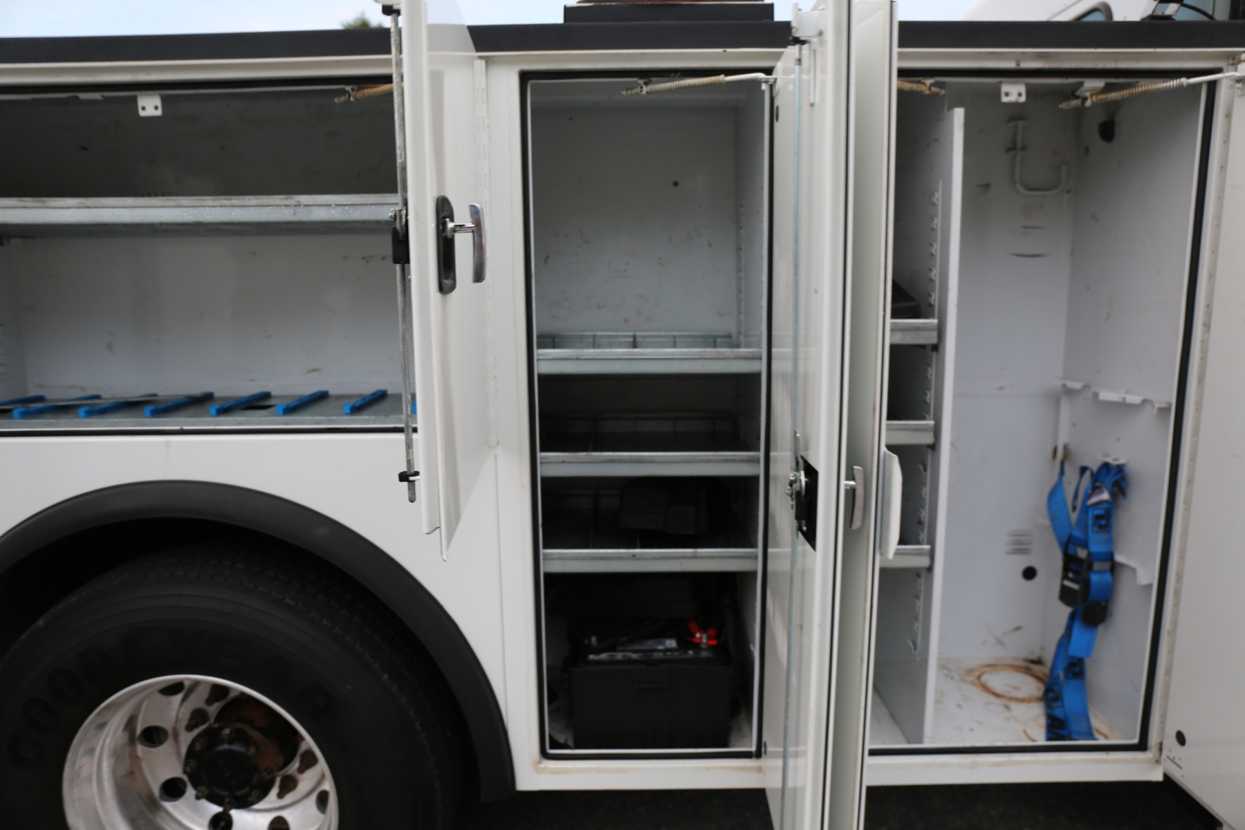 One shelf over the passenger wheel well. Three shelves in the P2 compartment, with the truck batteries located in the bottom. Three shelves in the P1 compartment, as well as torch bottle racks and straps.
