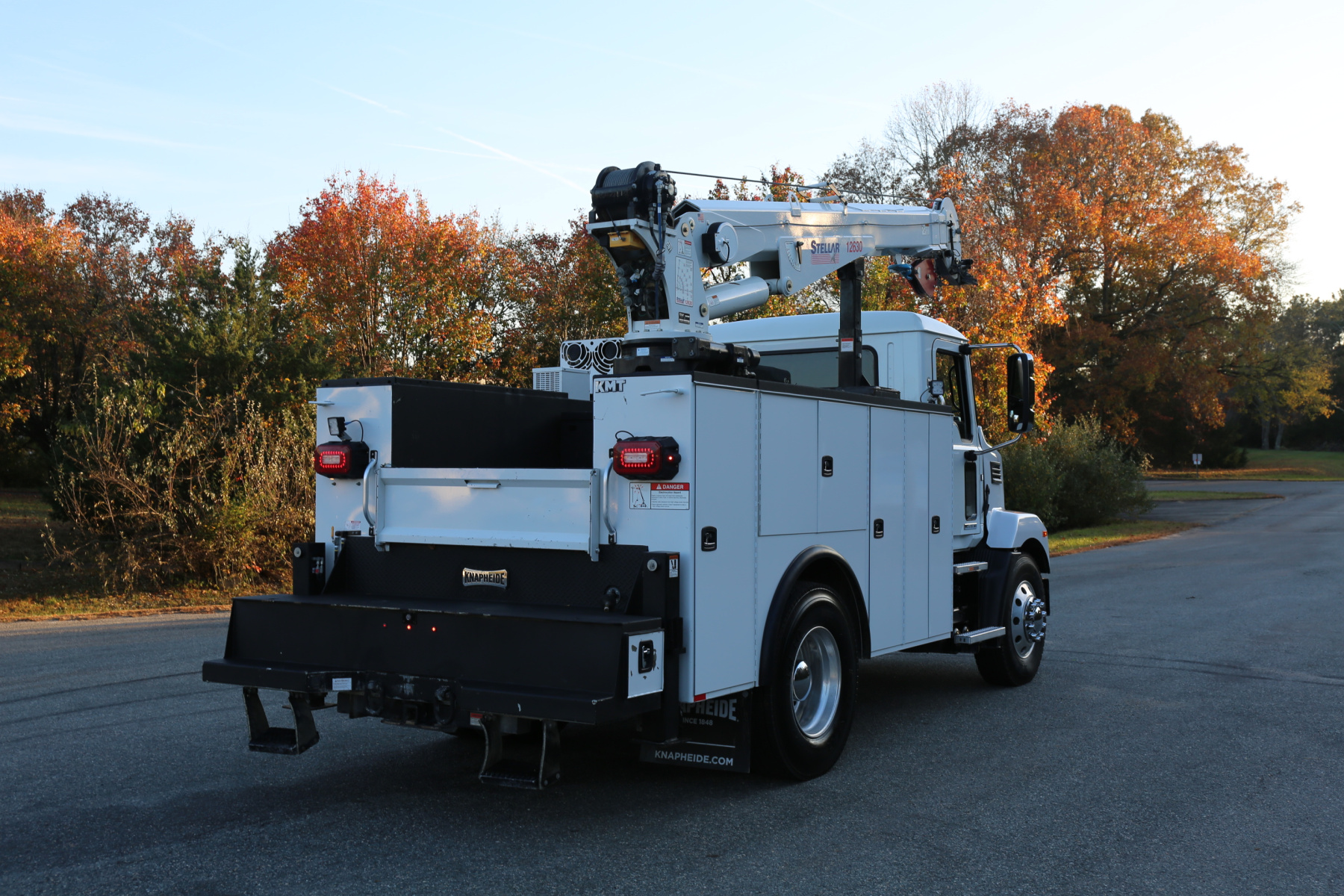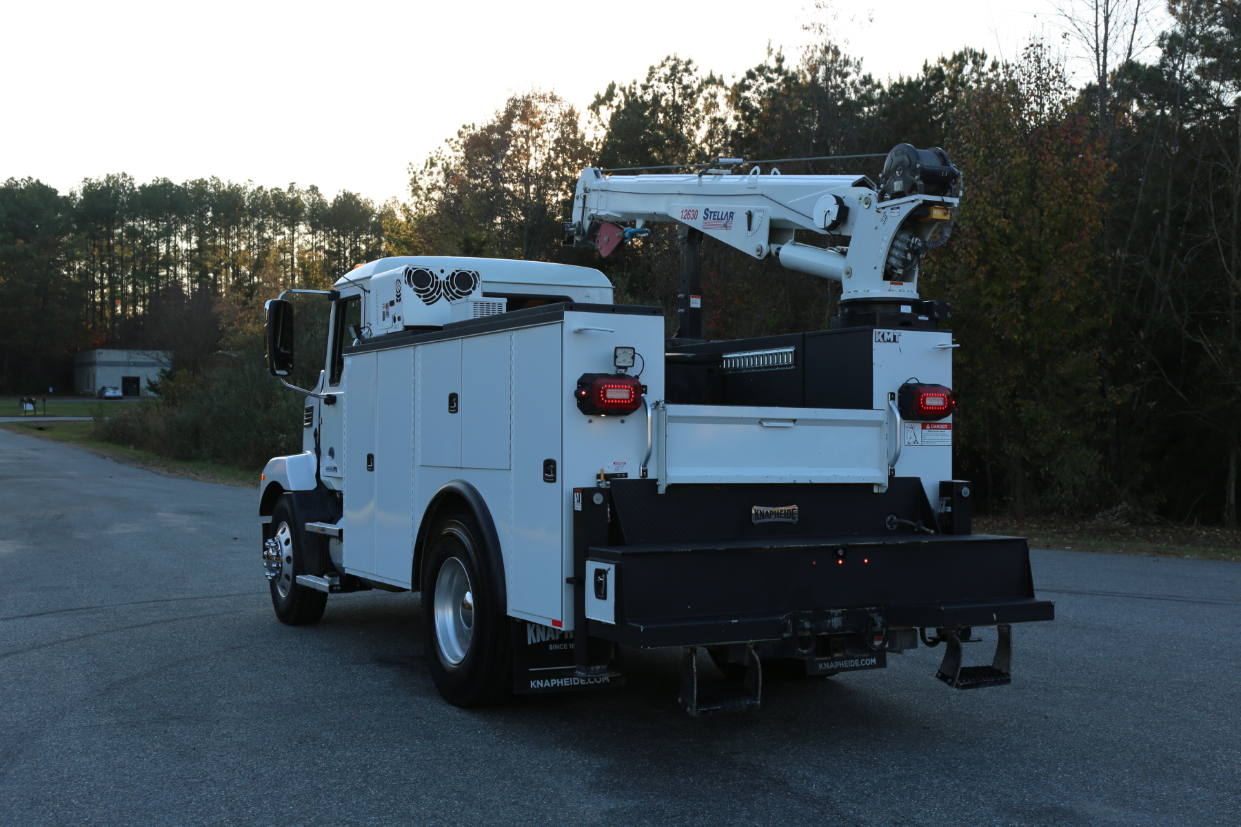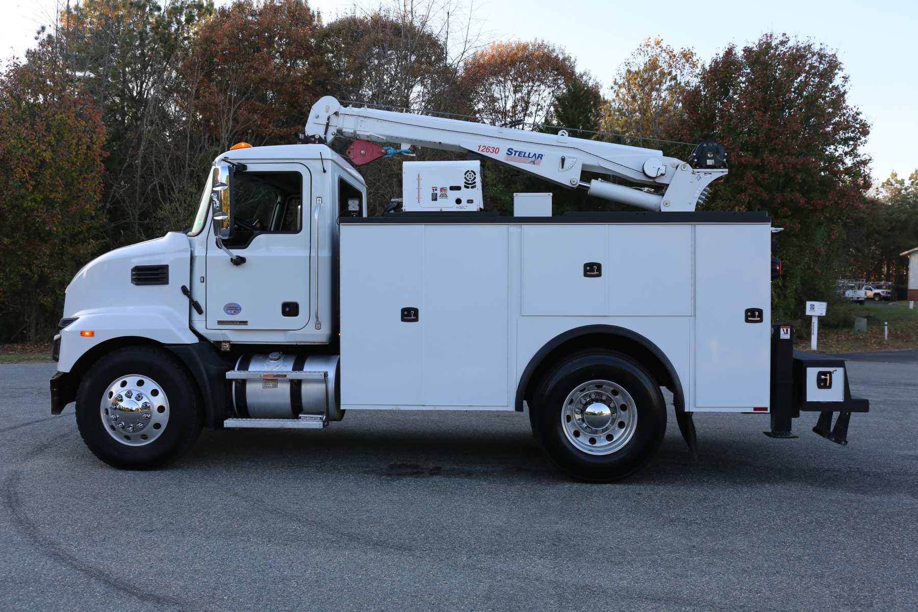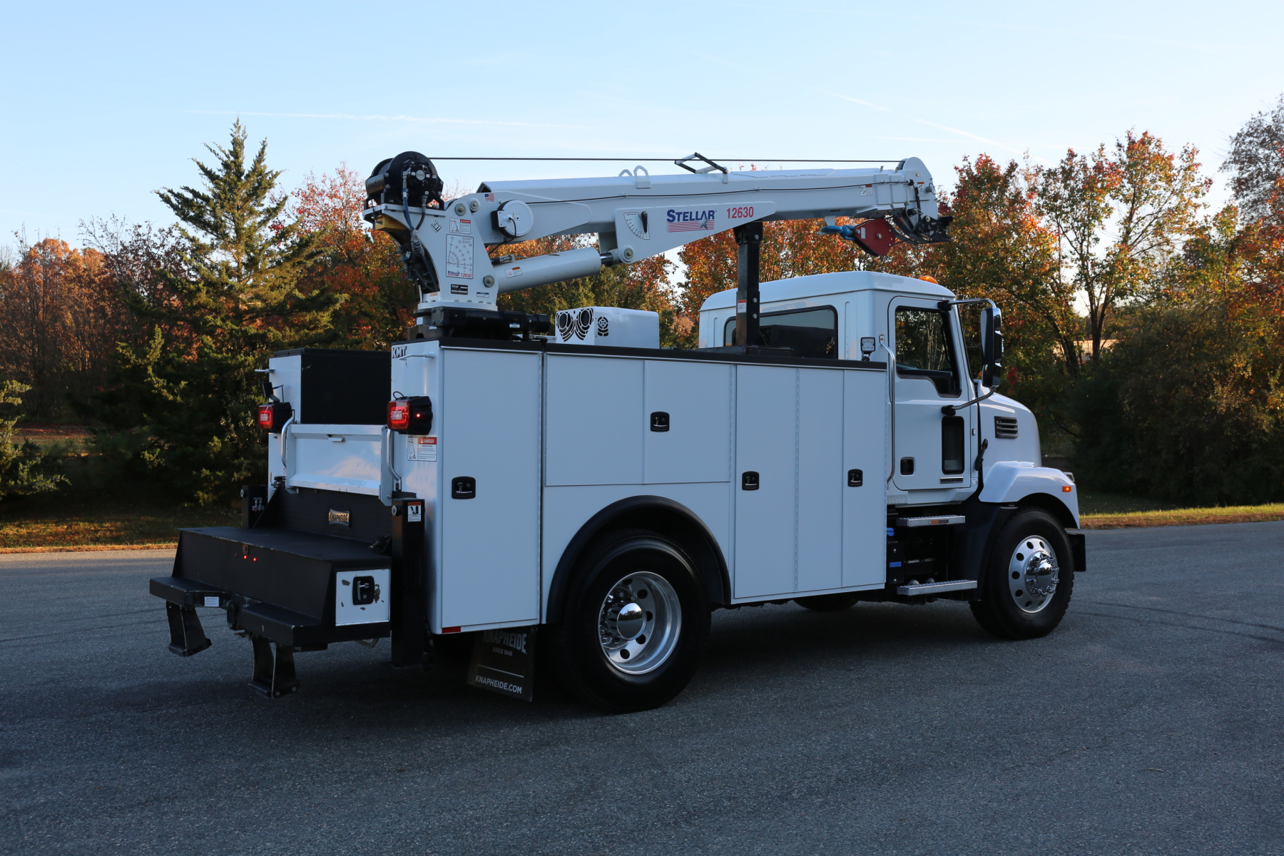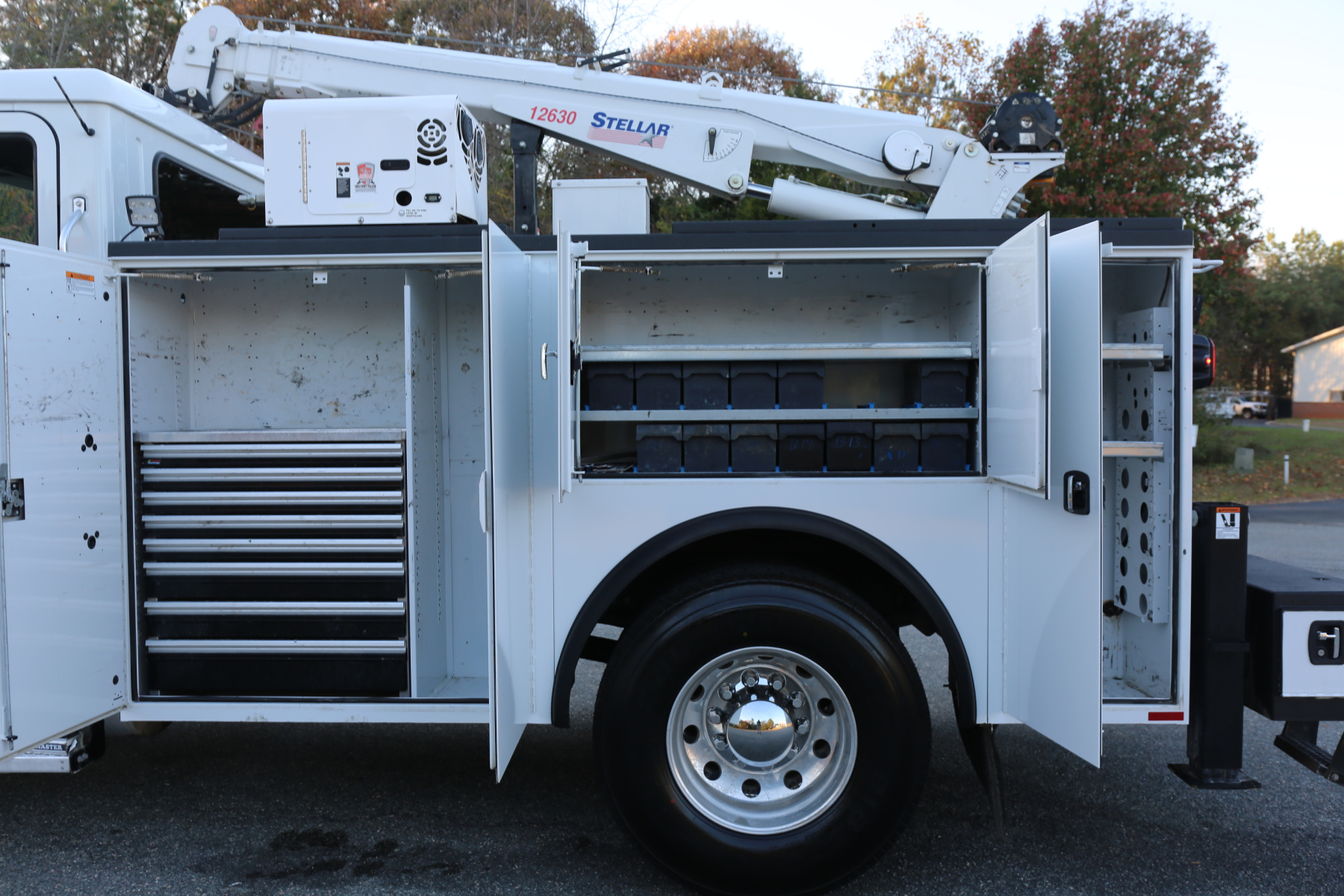 Equipped with an 11′ Knapheide service body, one set of CTech drawers, one set of bolt drawers, a Stellar 12630 crane, a Boss BA440 hydraulic compressor, and hydraulic outriggers.