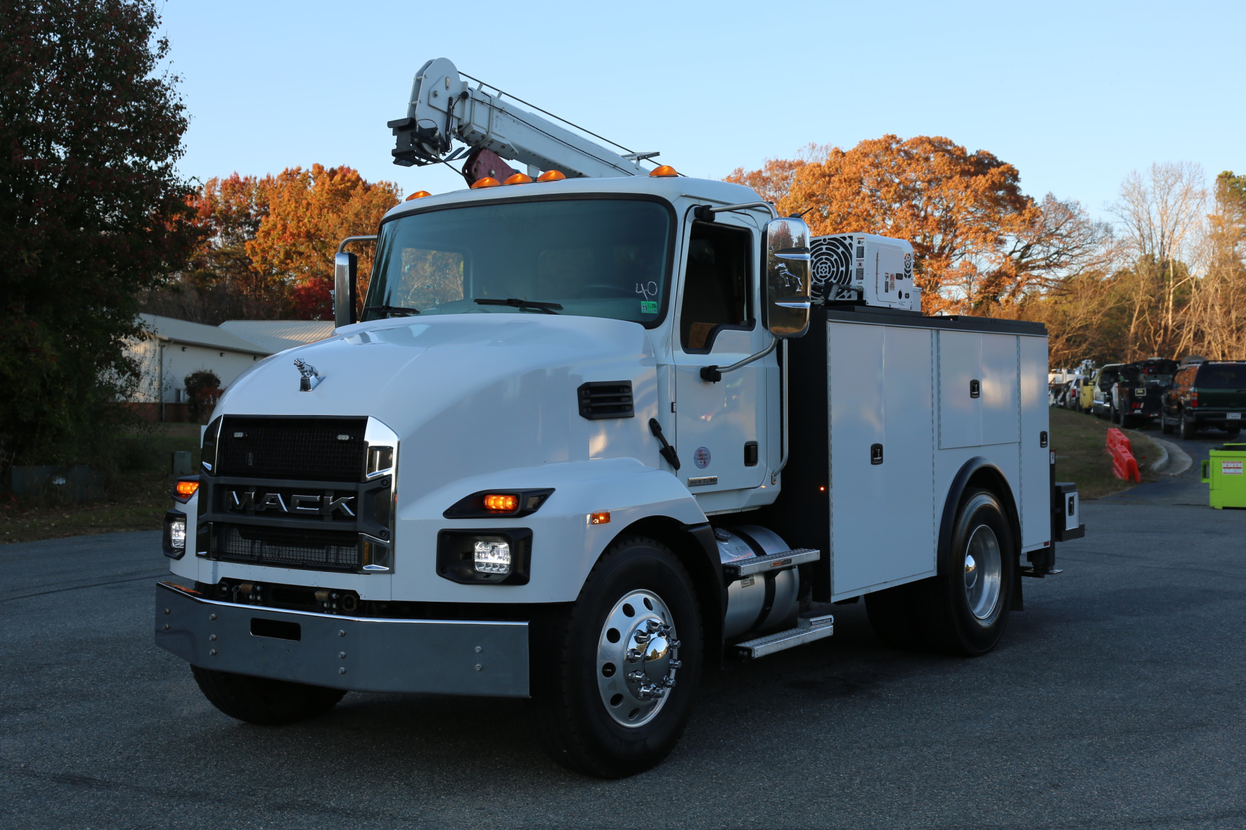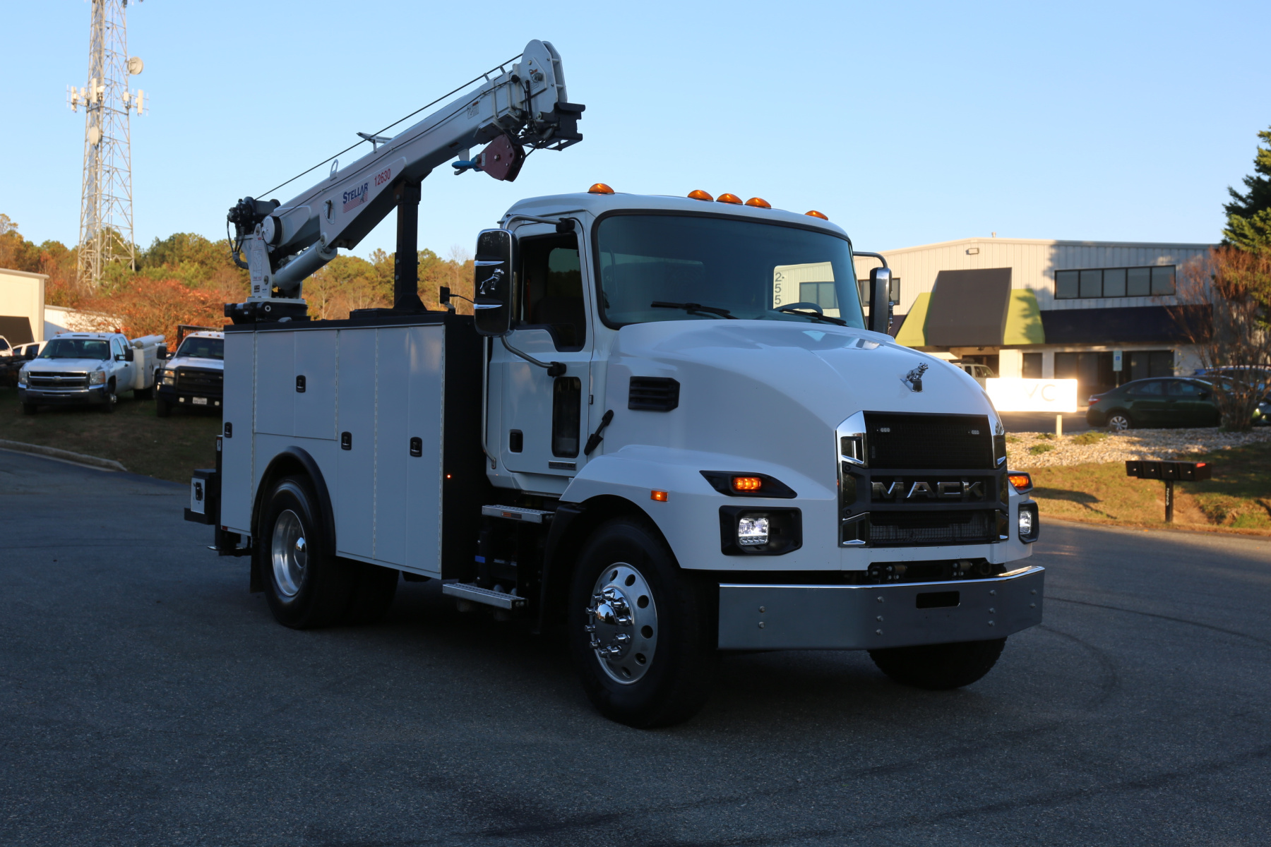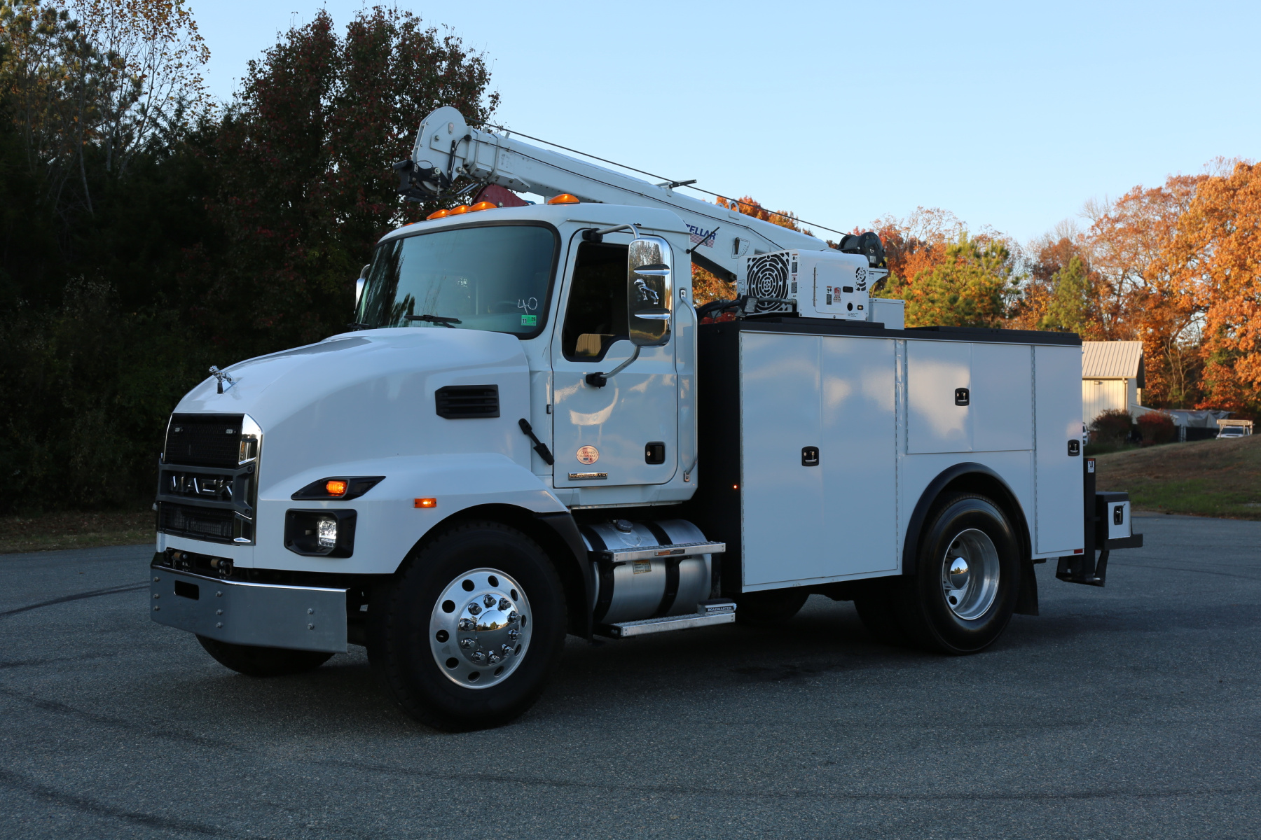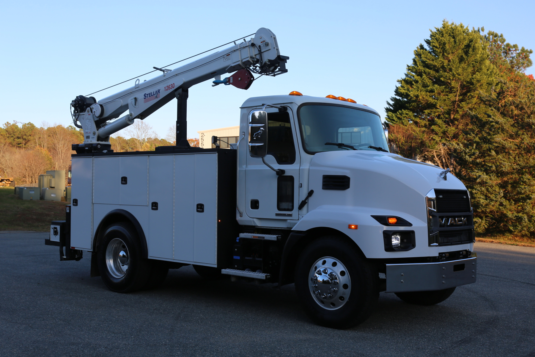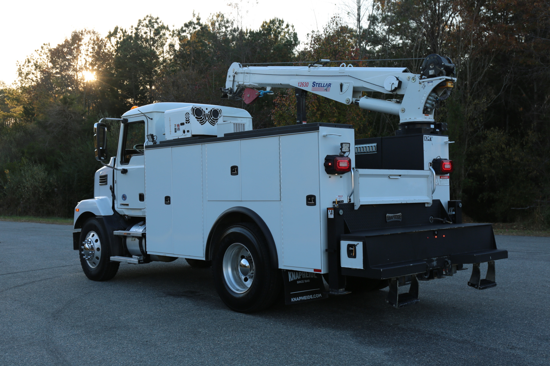 Equipped with an 11′ Knapheide service body, one set of CTech drawers, one set of bolt drawers, a Stellar 12630 crane, a Boss BA440 hydraulic compressor, and hydraulic outriggers.
