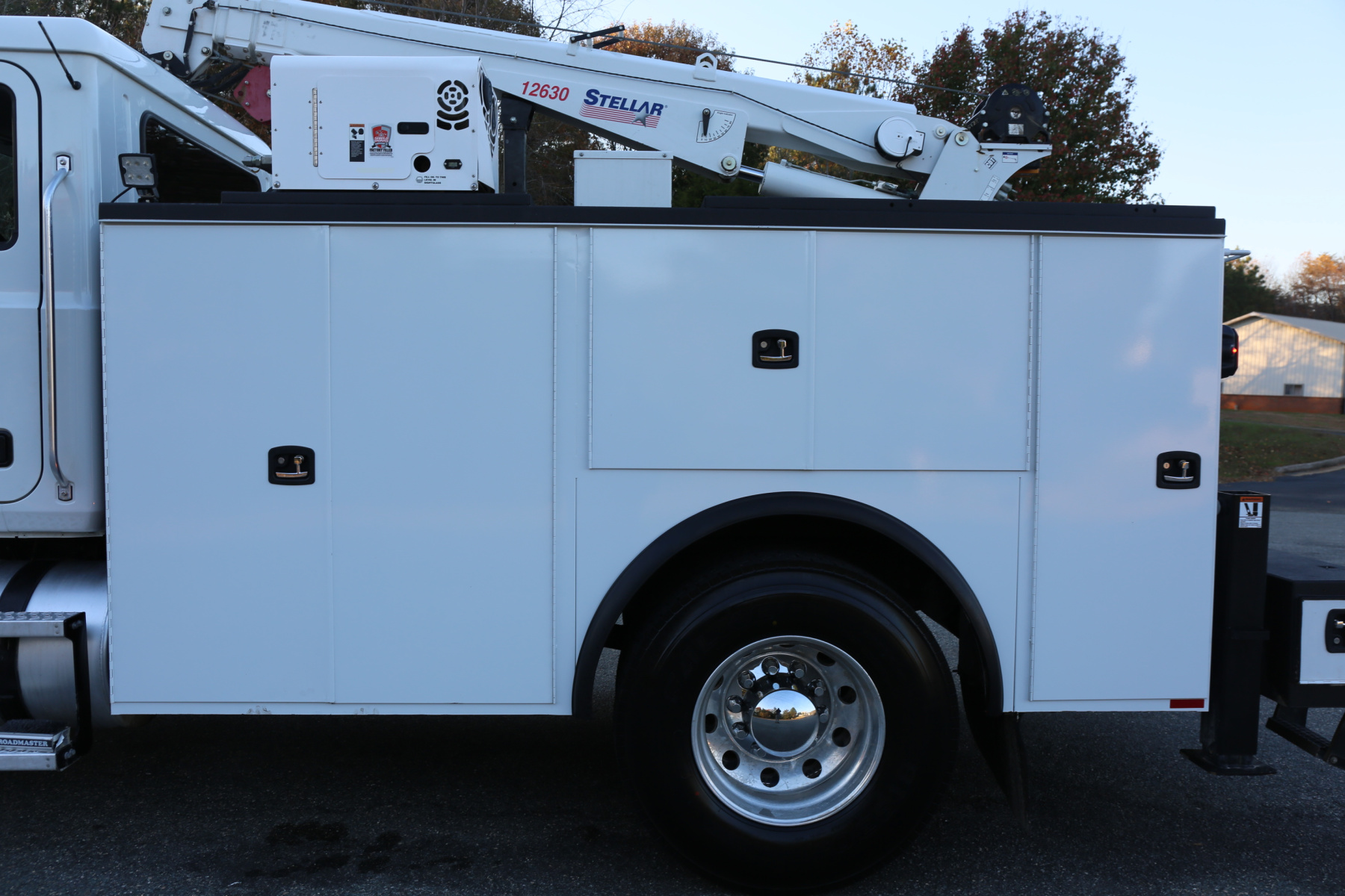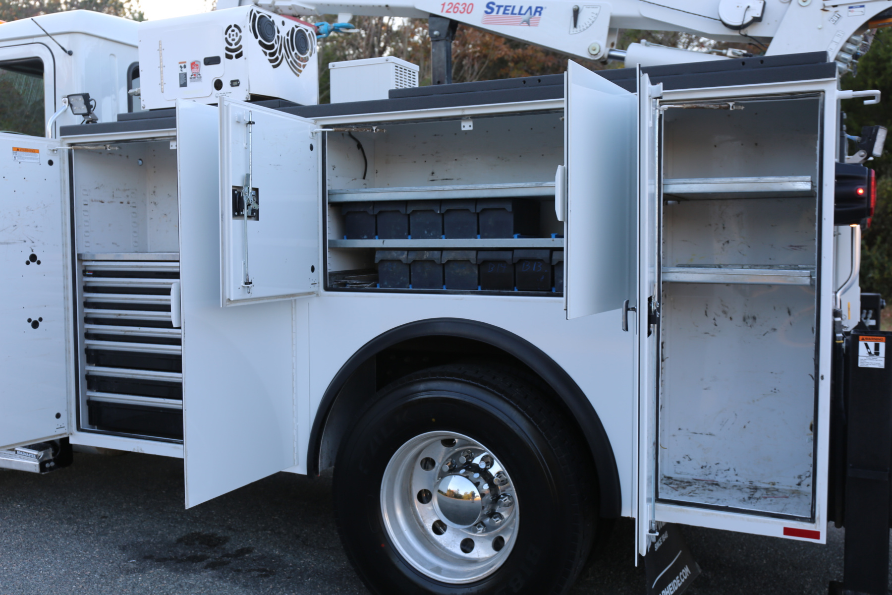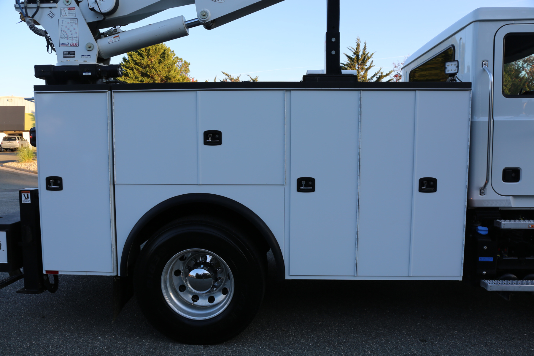 The crane is a Stellar 12630, with a 12,000# maximum lifting capacity and a two stage reach out to 30′. Run off a factory wireless remote – the remote controls the compressor, and can turn the truck on and off as well.