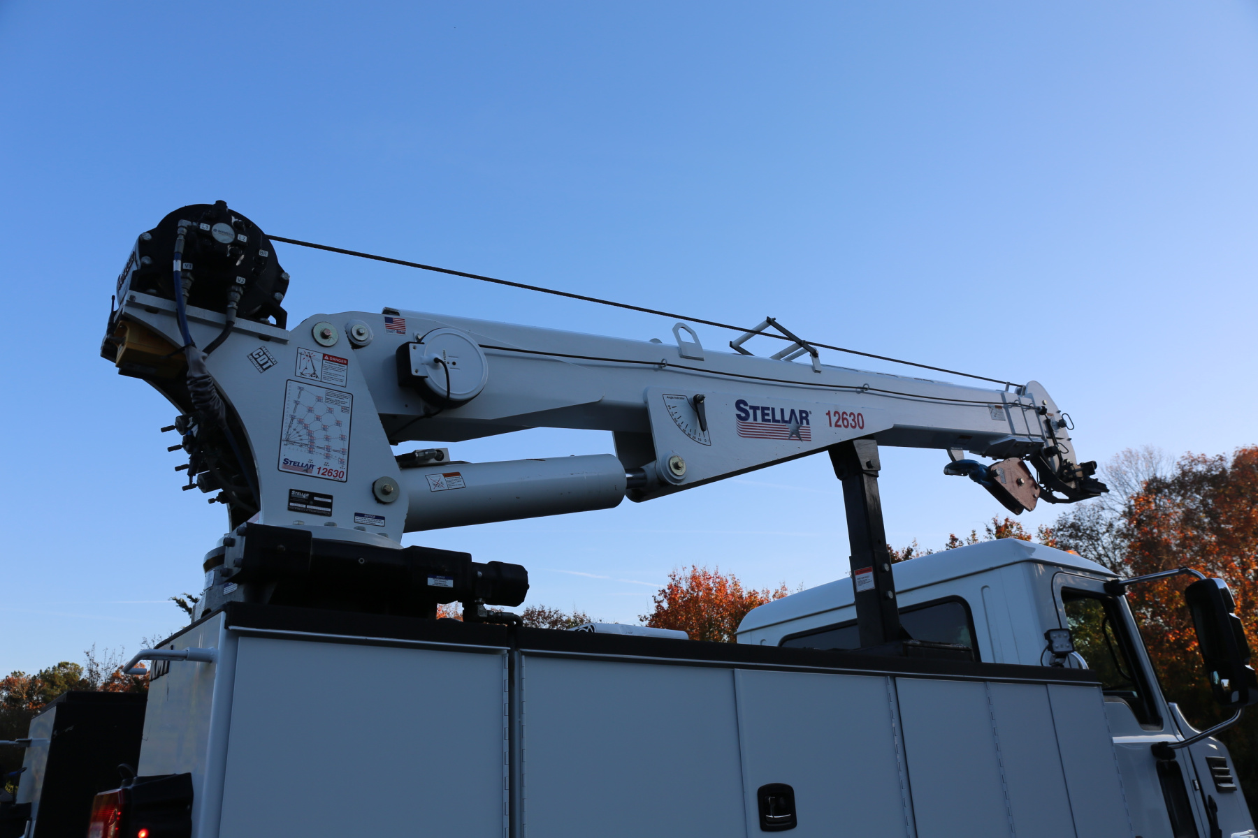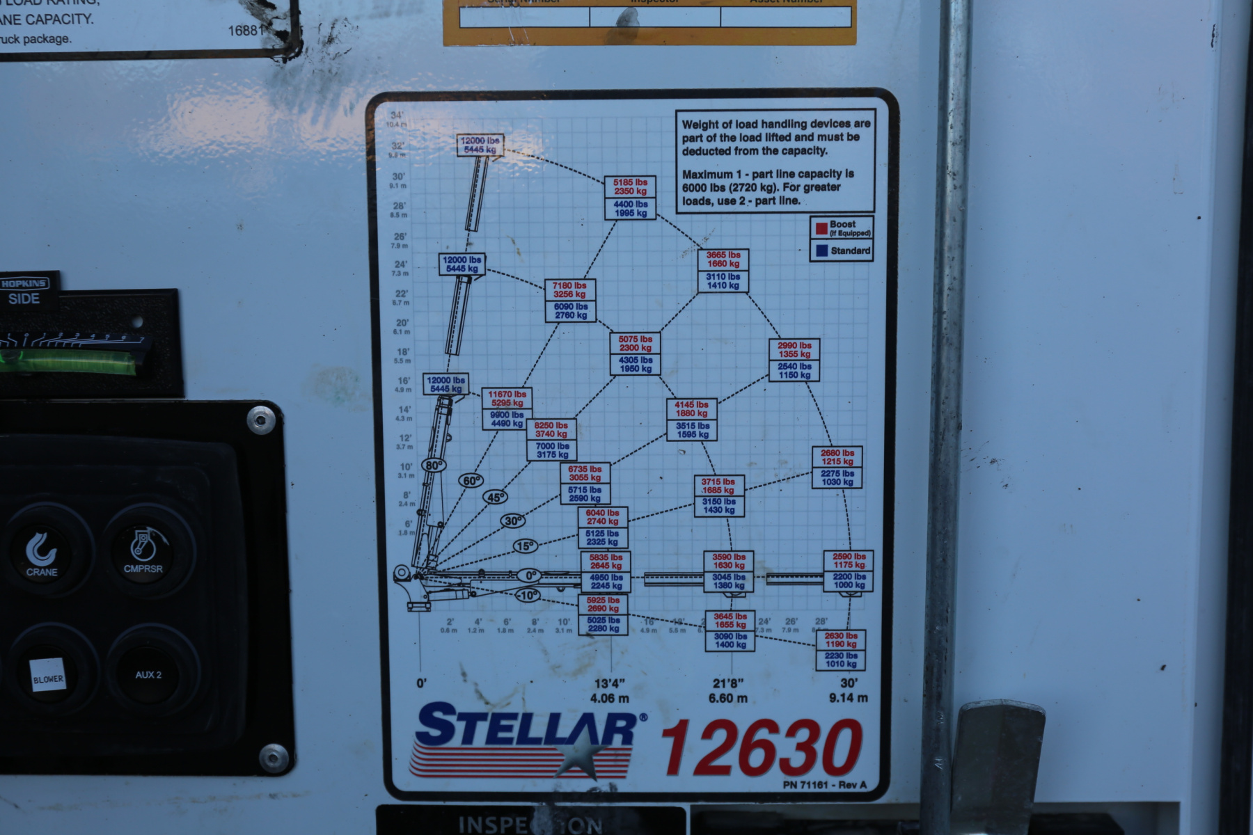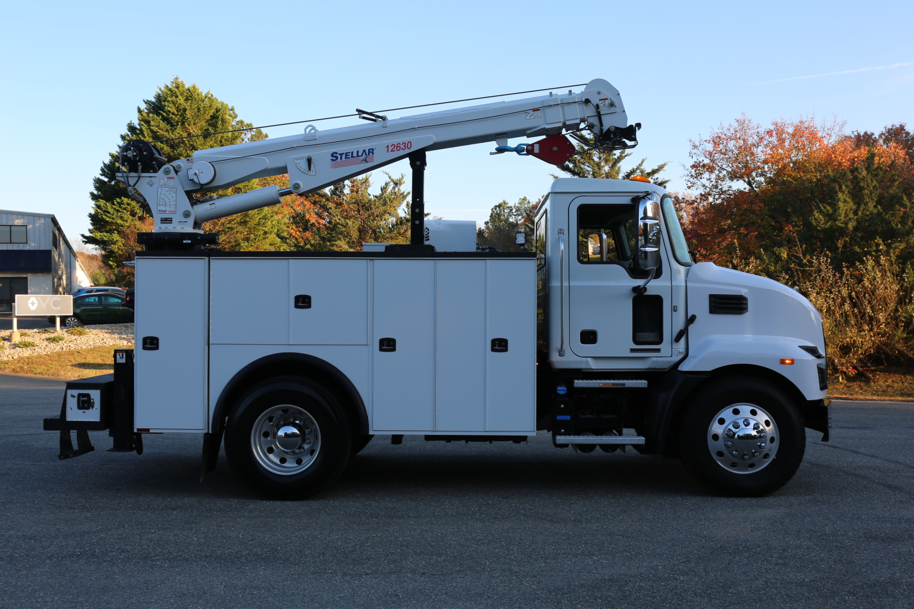 The crane is a Stellar 12630, with a 12,000# maximum lifting capacity and a two stage reach out to 30′. Run off a factory wireless remote – the remote controls the compressor, and can turn the truck on and off as well.