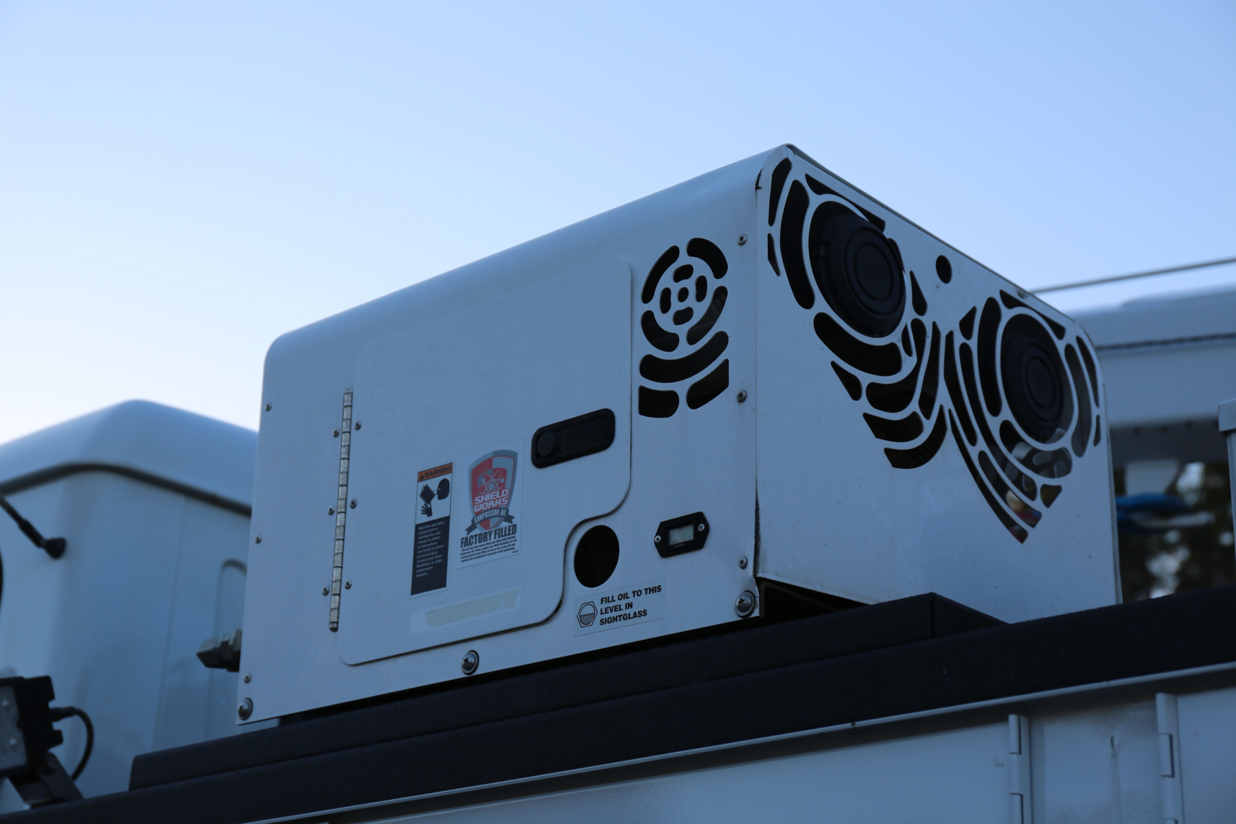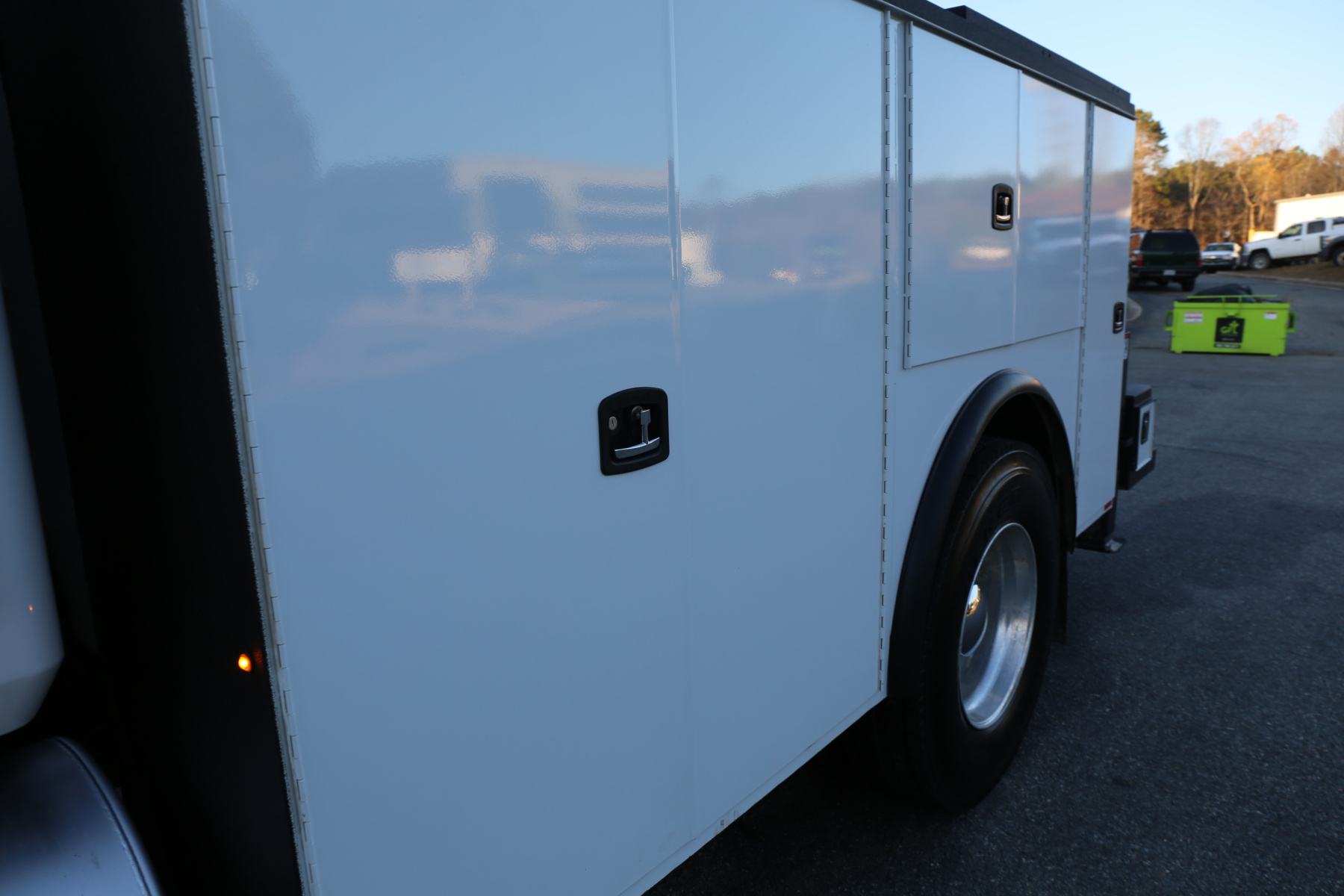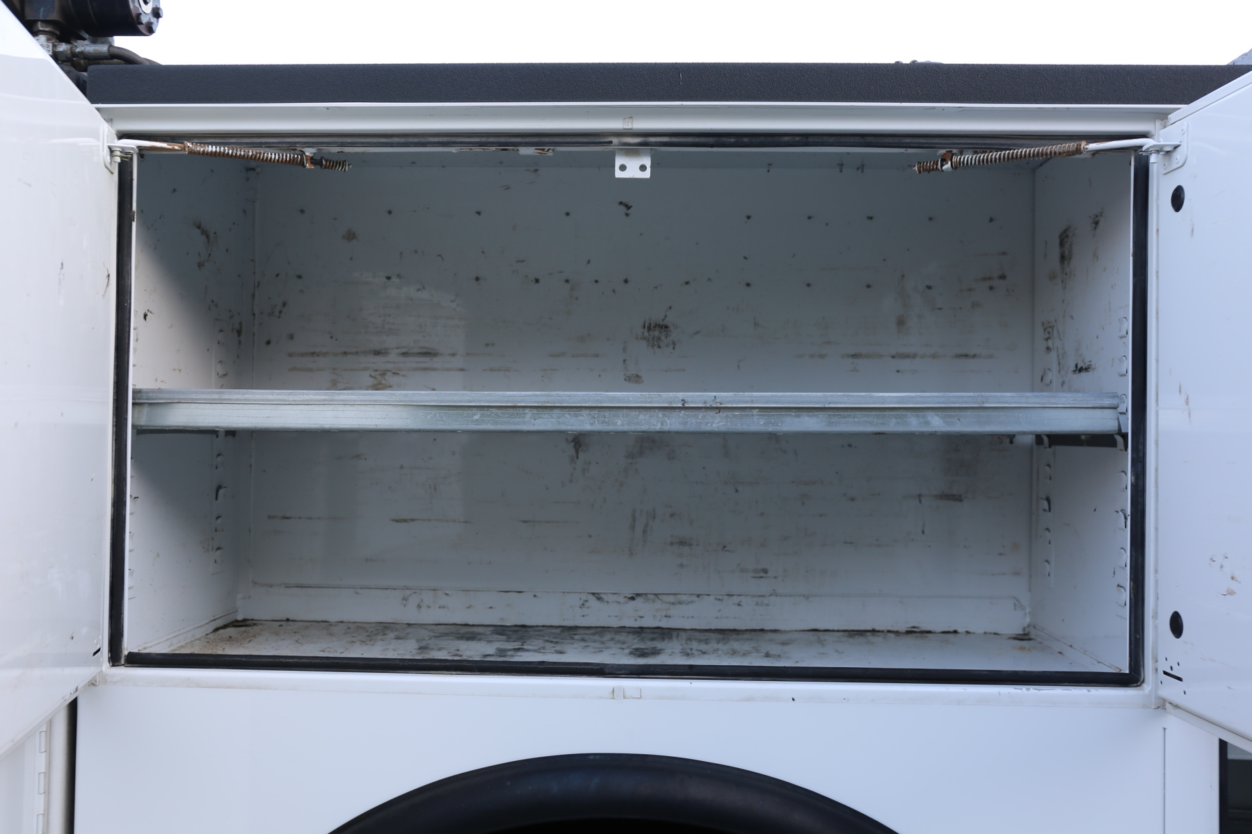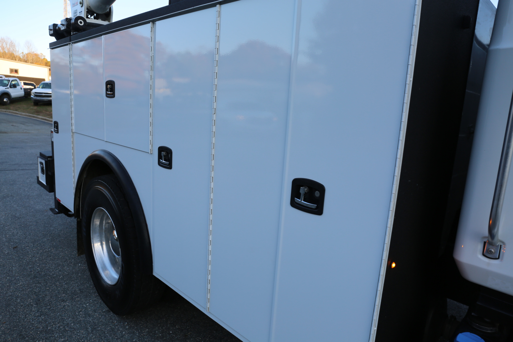 The bed is in excellent condition overall, with just some minor rock chipping – no major dings, dents, or scratches on the service body. No rust whatsoever. All of the doors close, latch, lock, and seal as they should. We have the keys for the bins – they are all keyed the same. Interior compartment lighting throughout, as well as exterior LED work lights. All lighting is operational.