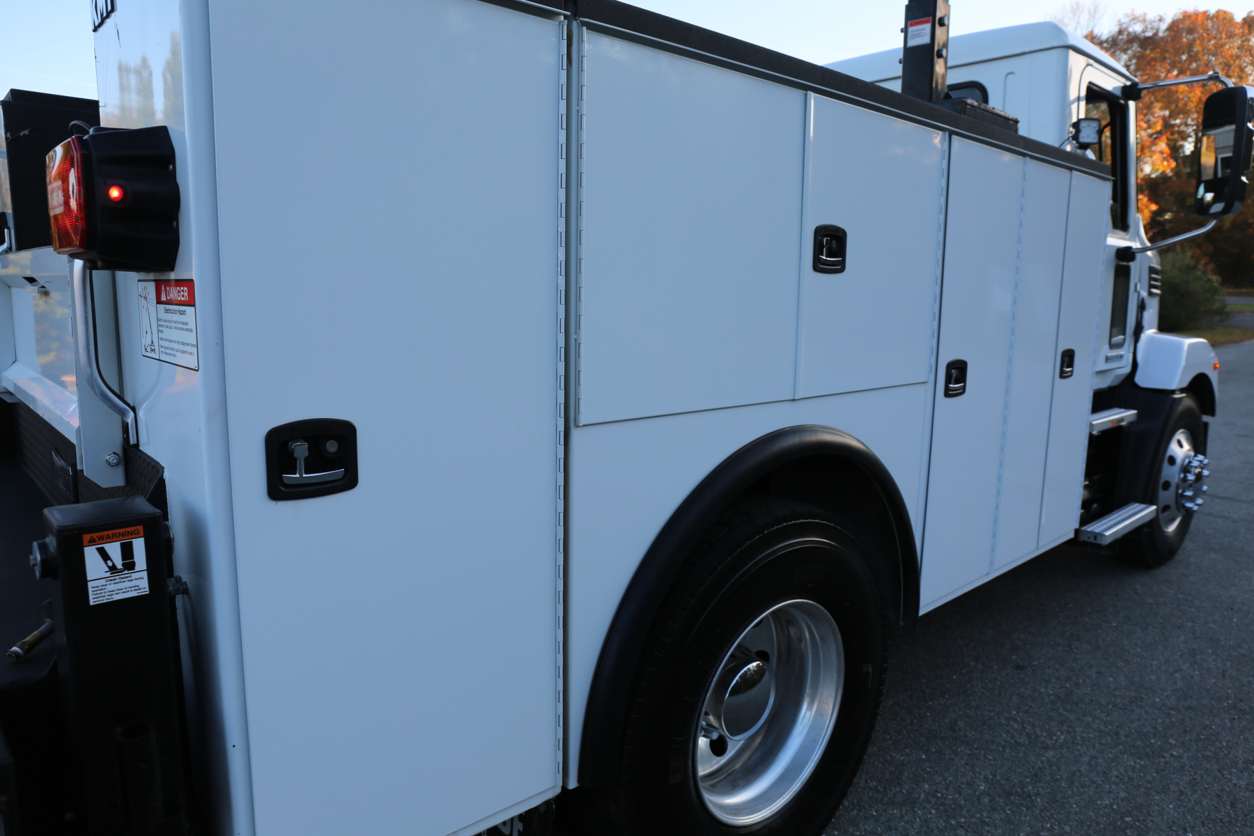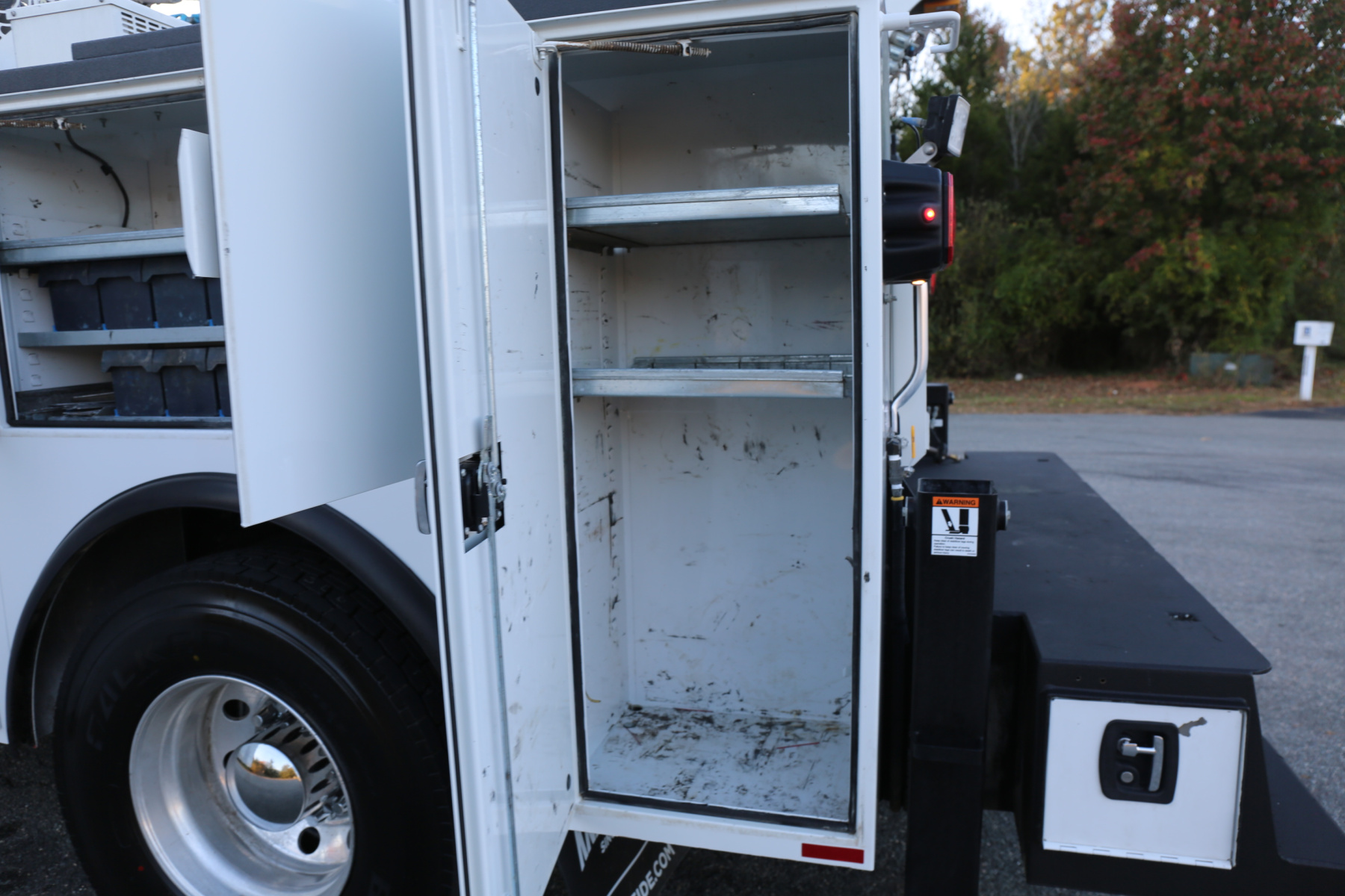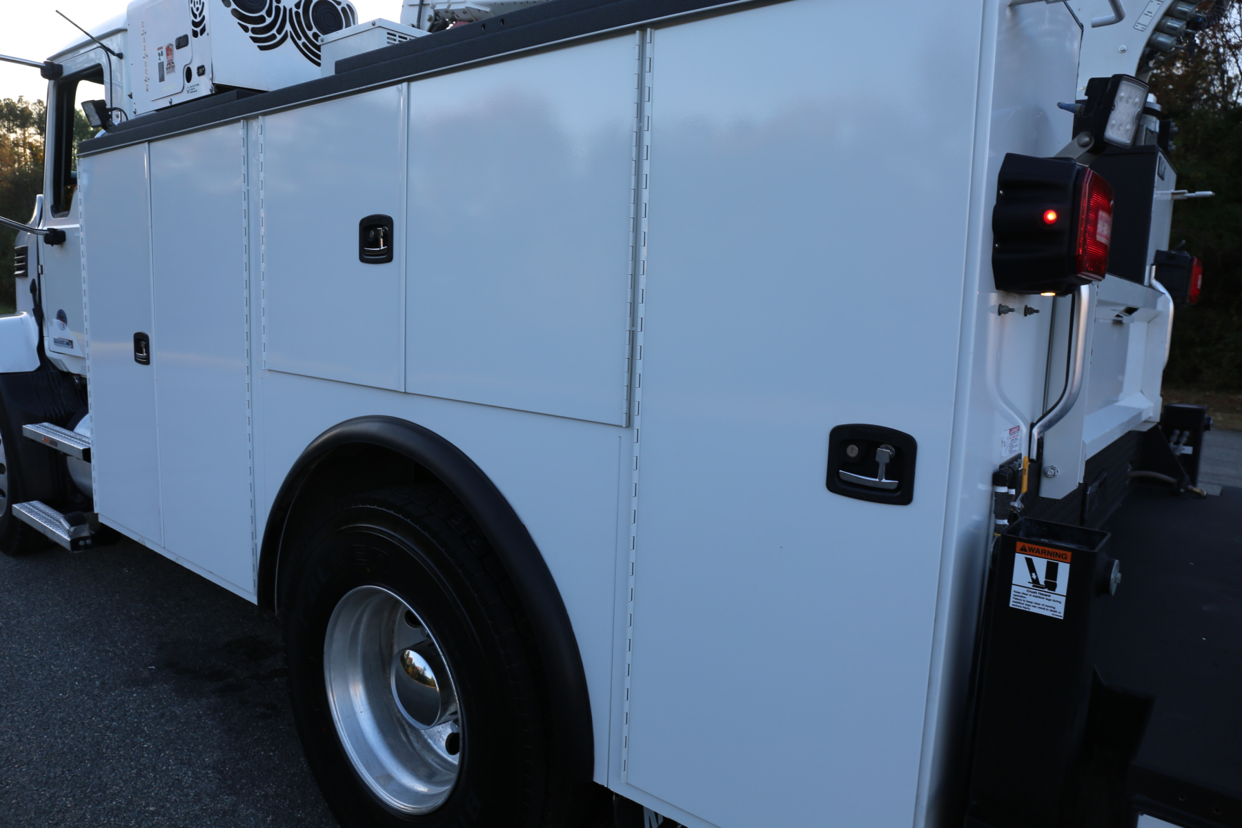 Work bench rear bumper with pass through bin storage underneath, hydraulic outriggers, and master slide locks for the bed. Strobes located in the taillights, two rear mount LED work lights.