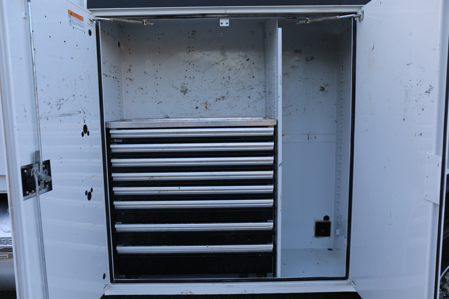 The D1 compartment has a set of CTech drawers, eight total, with a shelf over top. No shelving in the D2 compartment. A set of bolt drawers over the driver wheel well, 16 total. Two shelves in the driver rear compartment.