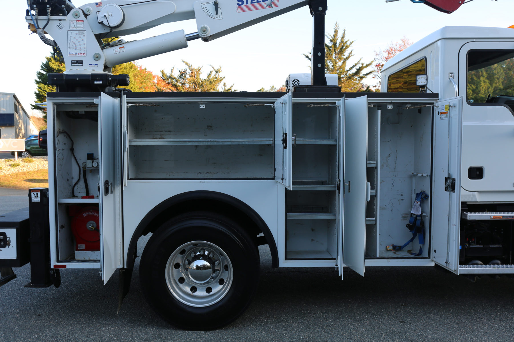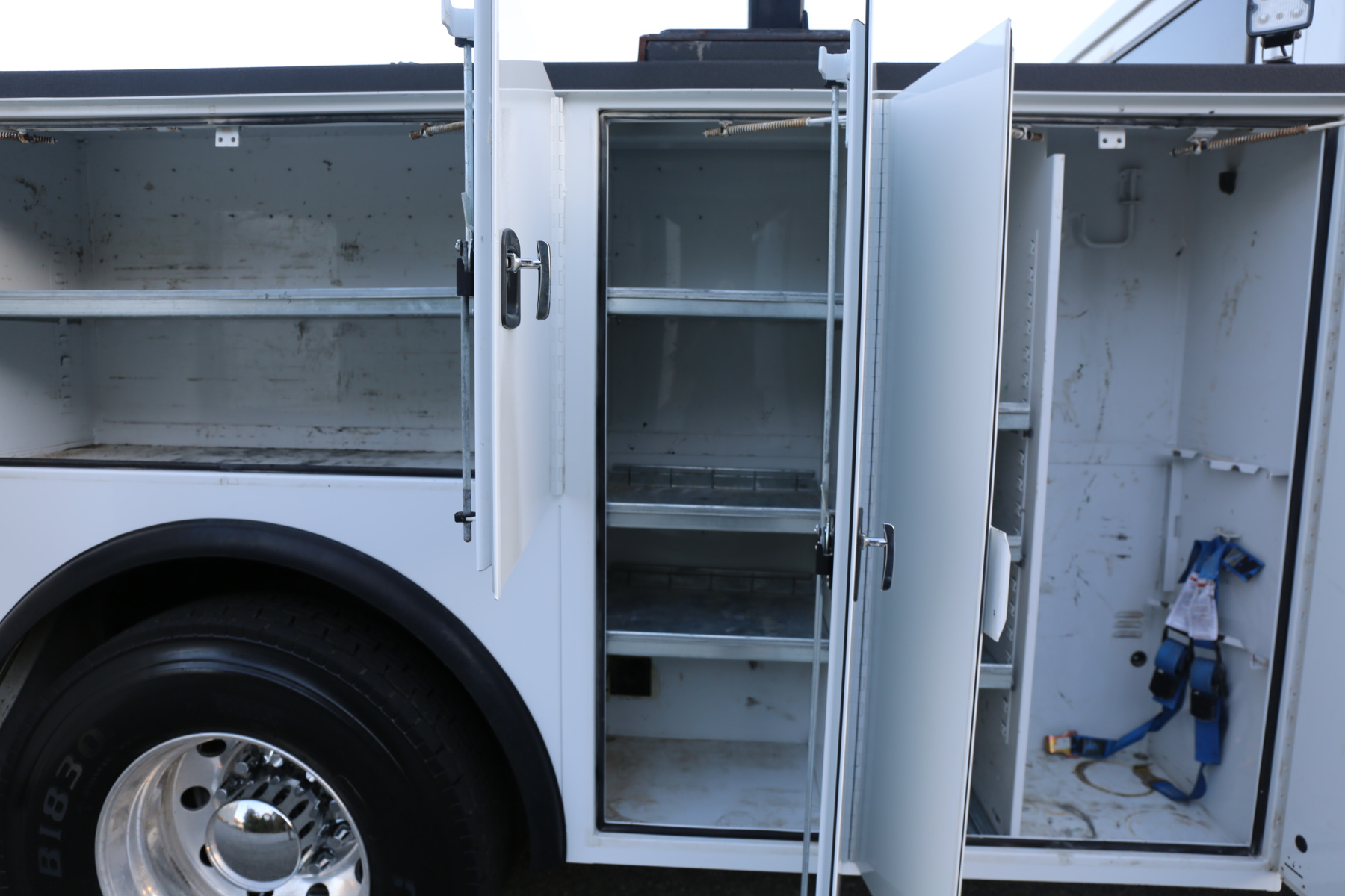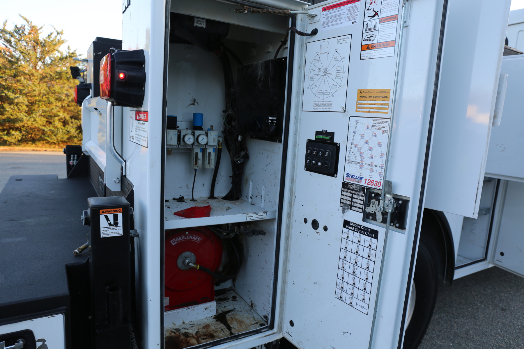 The crane compartment houses a Reelcraft hose reel, has one shelf, outrigger control levers, and the body control panel to control the bed lighting. One shelf over the passenger wheel well, three shelves in the P2 compartment. The P1 compartment has torch bottle racks and straps on the right side, and three more shelves on the left side.