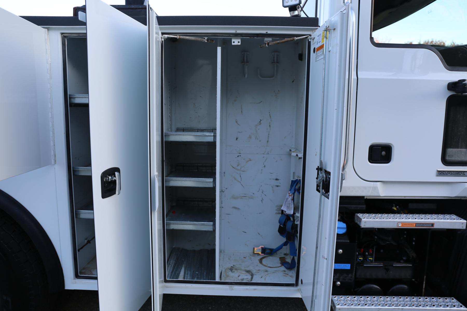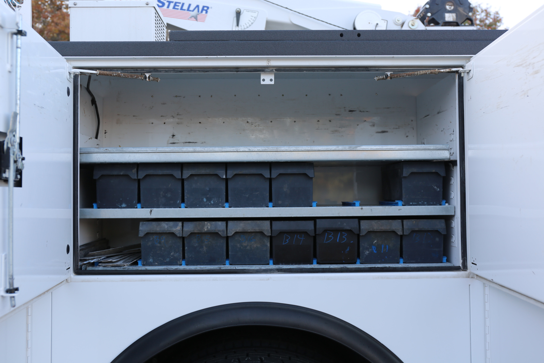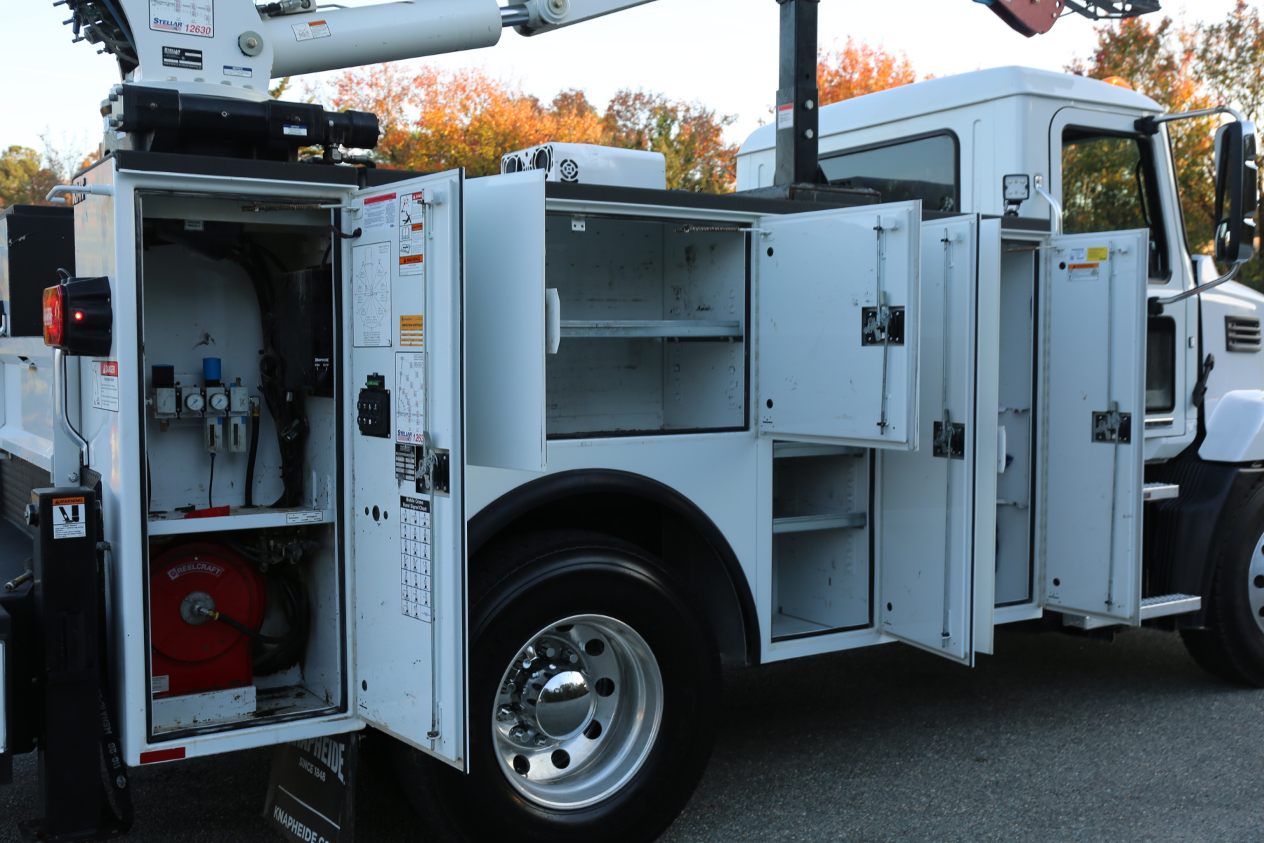 The crane compartment houses a Reelcraft hose reel, has one shelf, outrigger control levers, and the body control panel to control the bed lighting. One shelf over the passenger wheel well, three shelves in the P2 compartment. The P1 compartment has torch bottle racks and straps on the right side, and three more shelves on the left side.