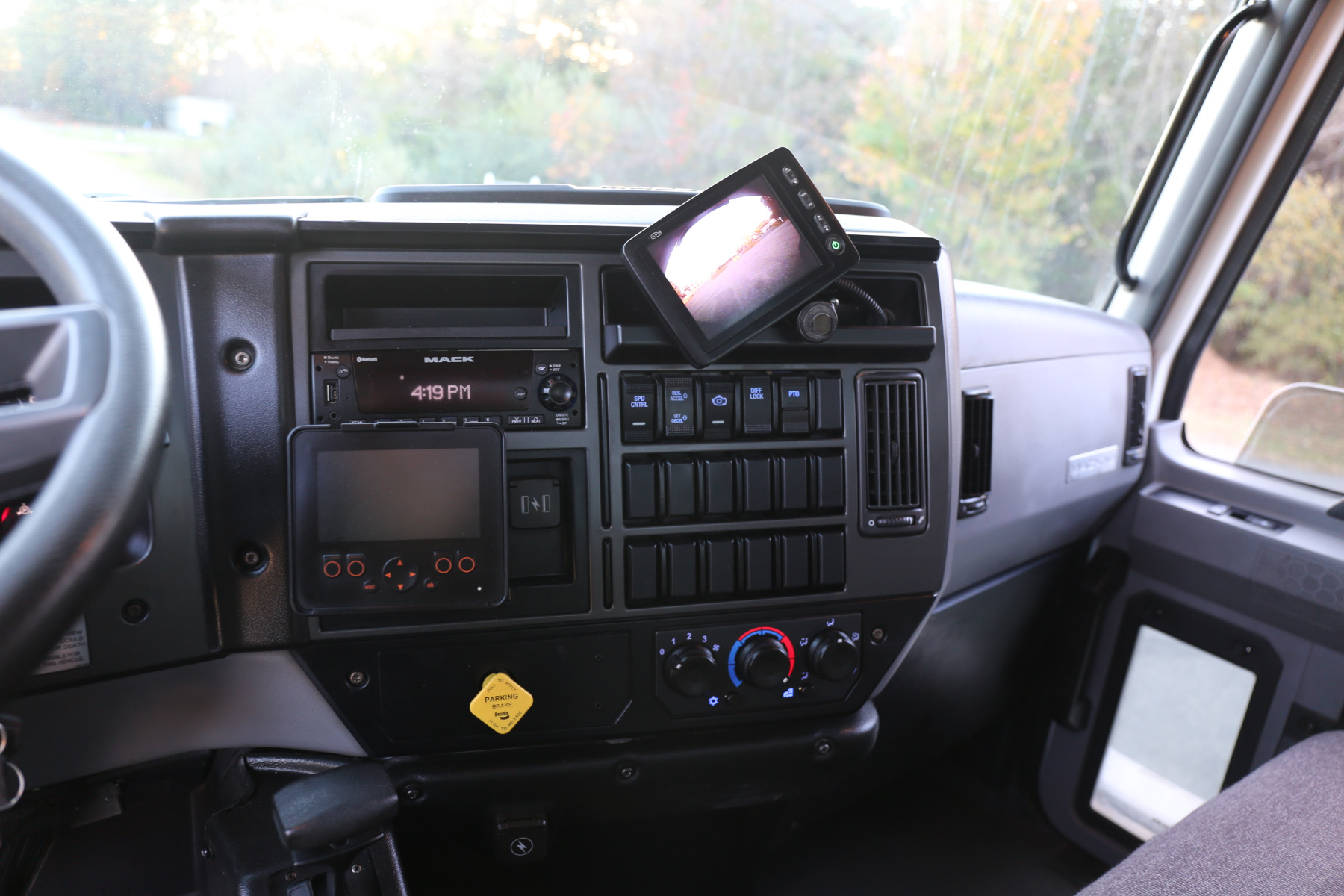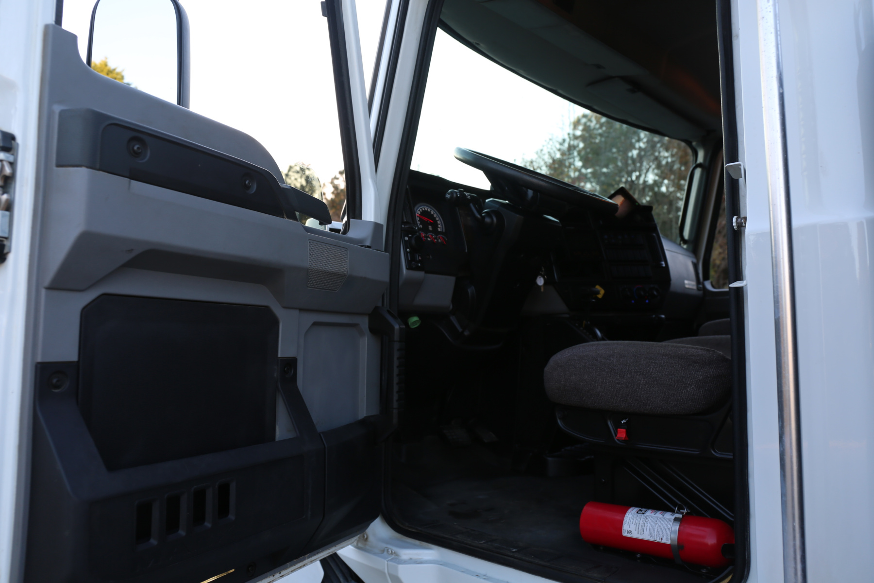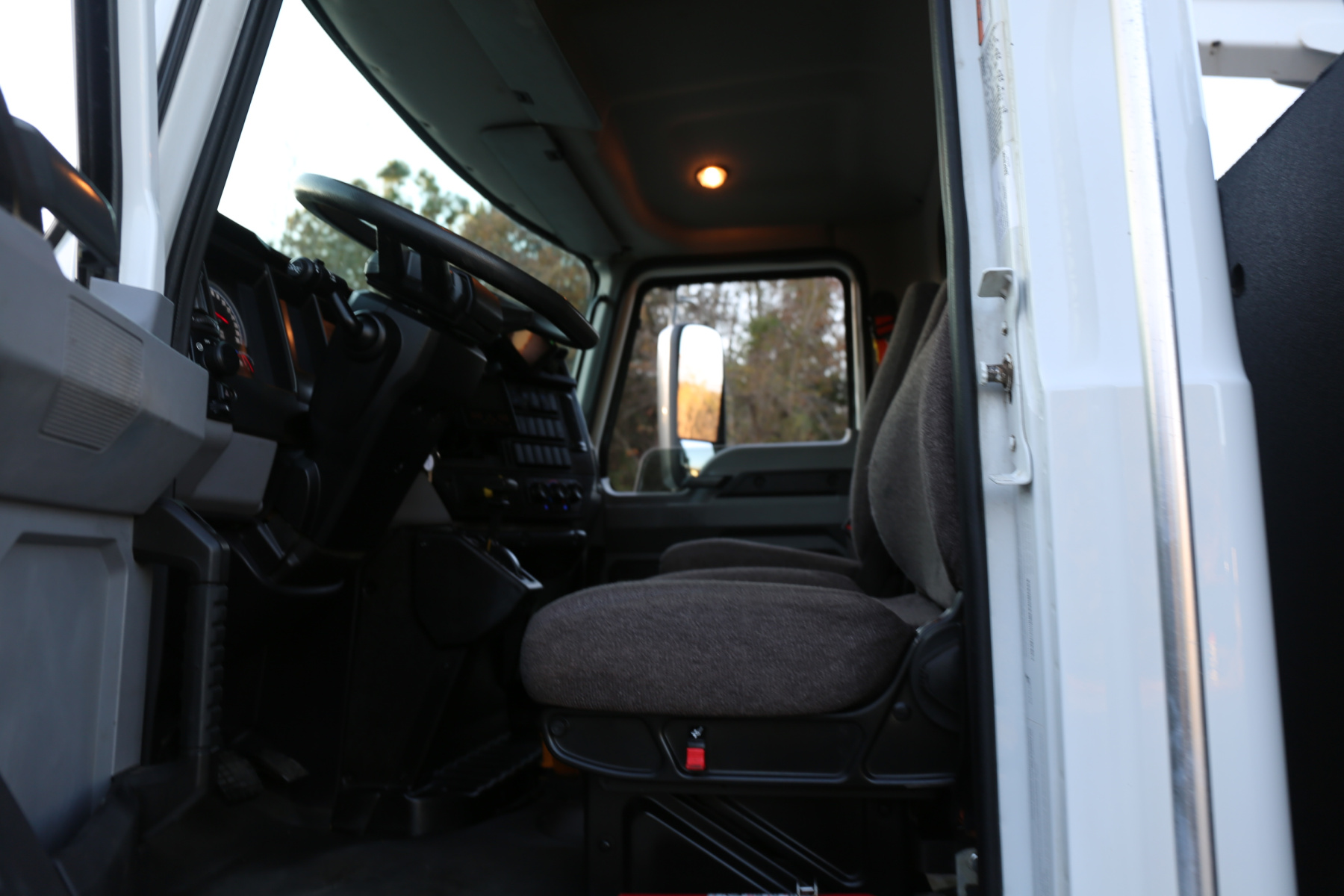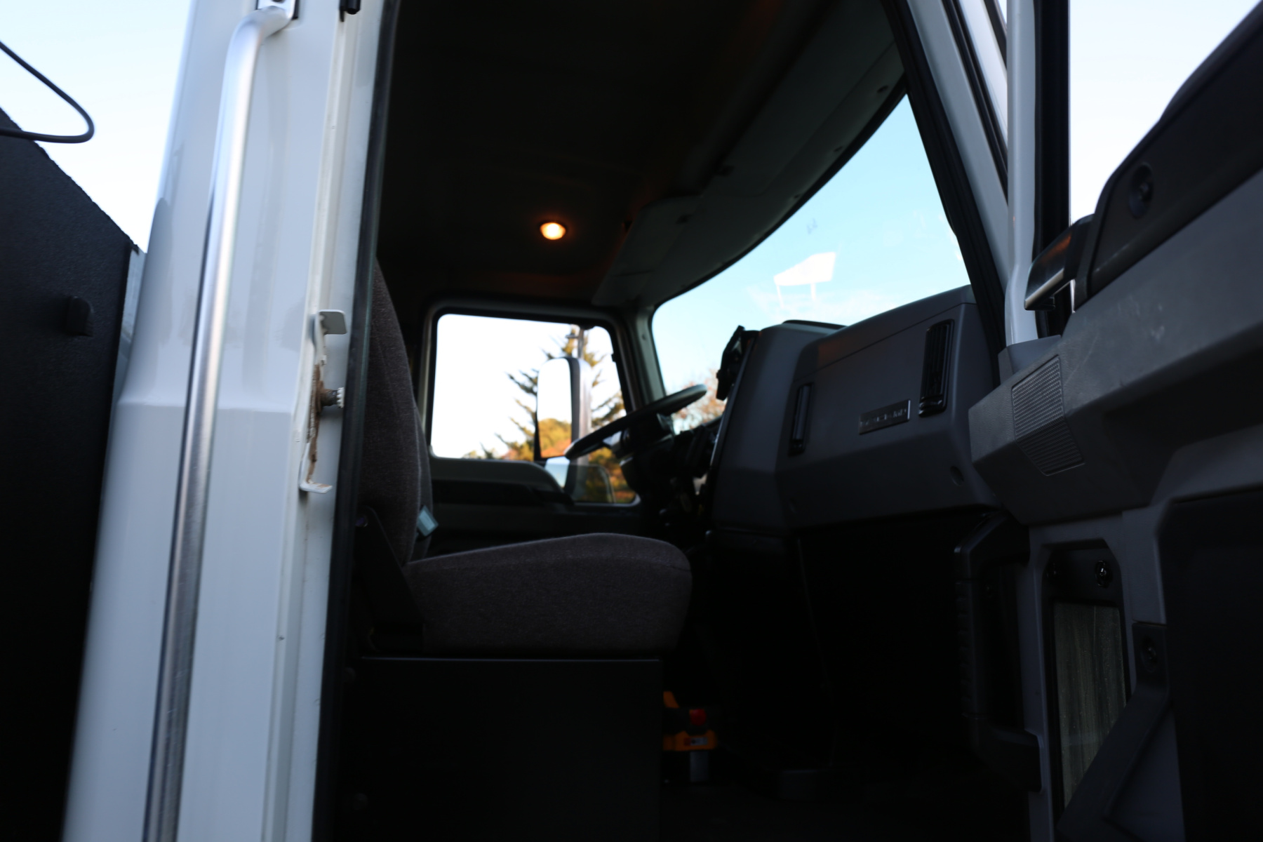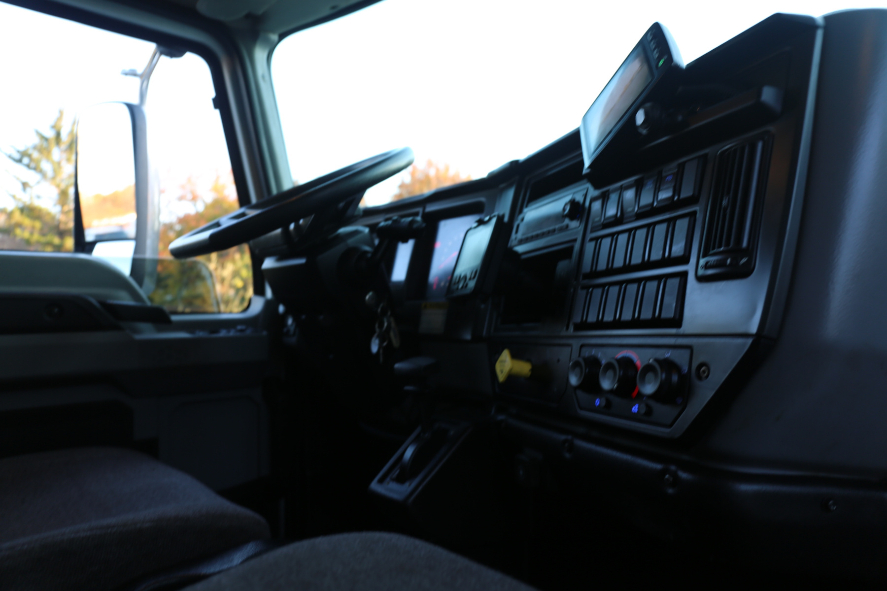 The cab is clean, and free of any rips or tears. Aftermarket rearview camera, body control panel inside the cab to control bed lighting, exhaust brake, power locks, power windows, and cruise control.