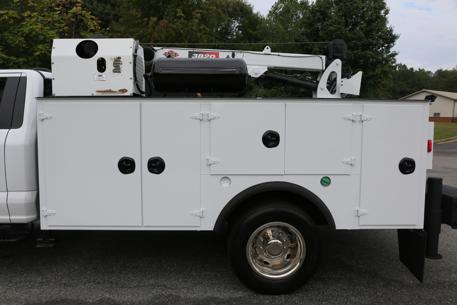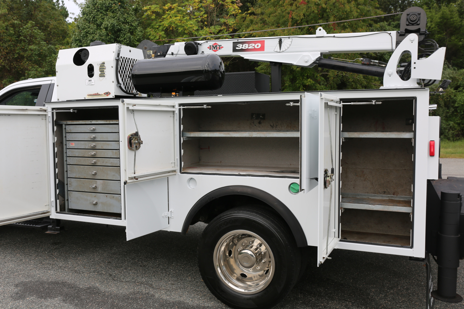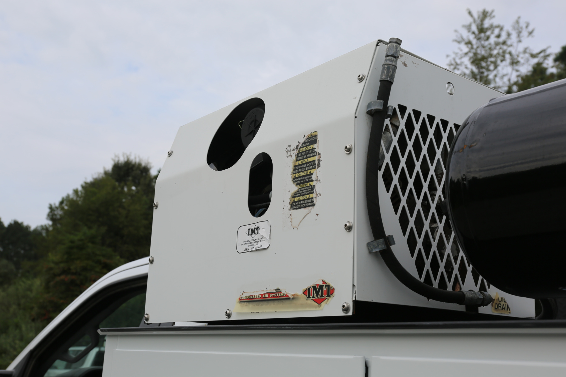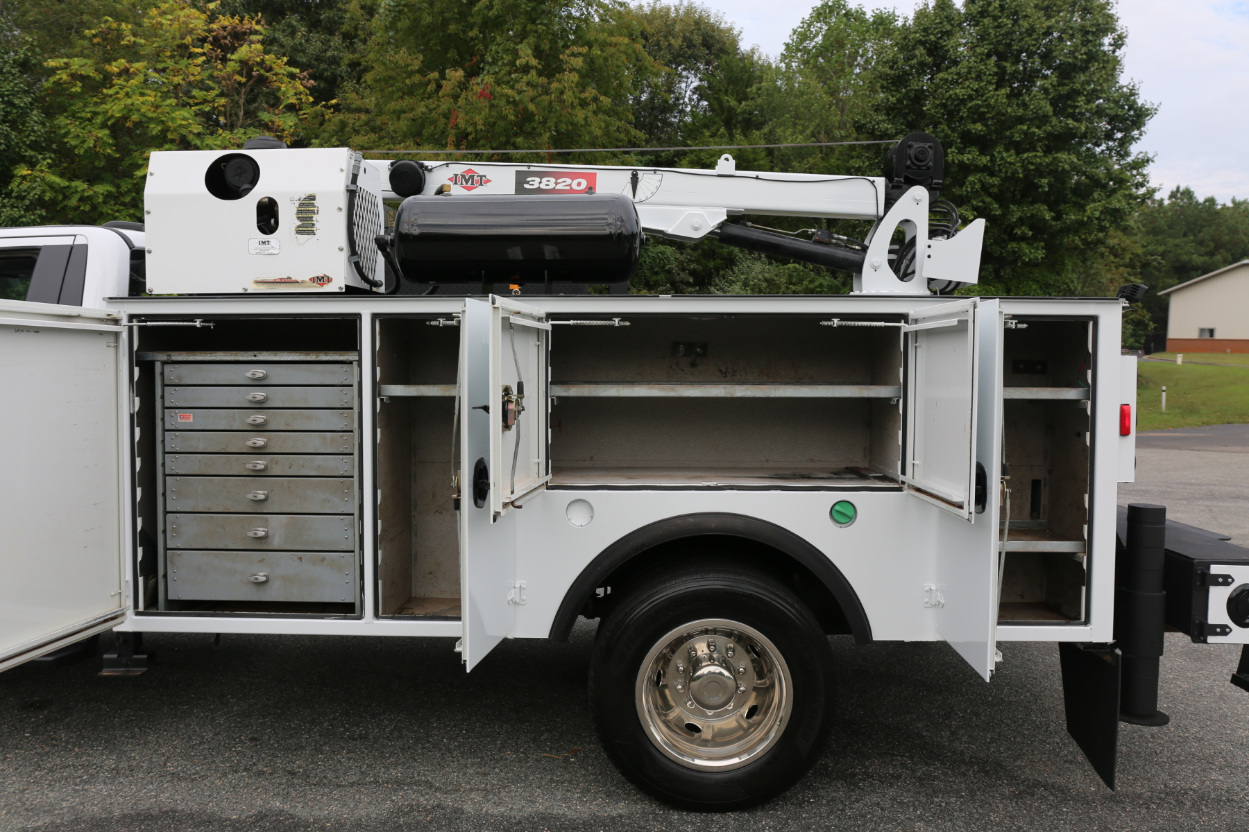 Equipped with an IMT Dominator 11′ service body, a 7500# capacity 21′ IMT crane (run off a wireless remote), hydraulic outriggers, and a hydraulic compressor. All of the equipment works as it should. No rust in the bed.