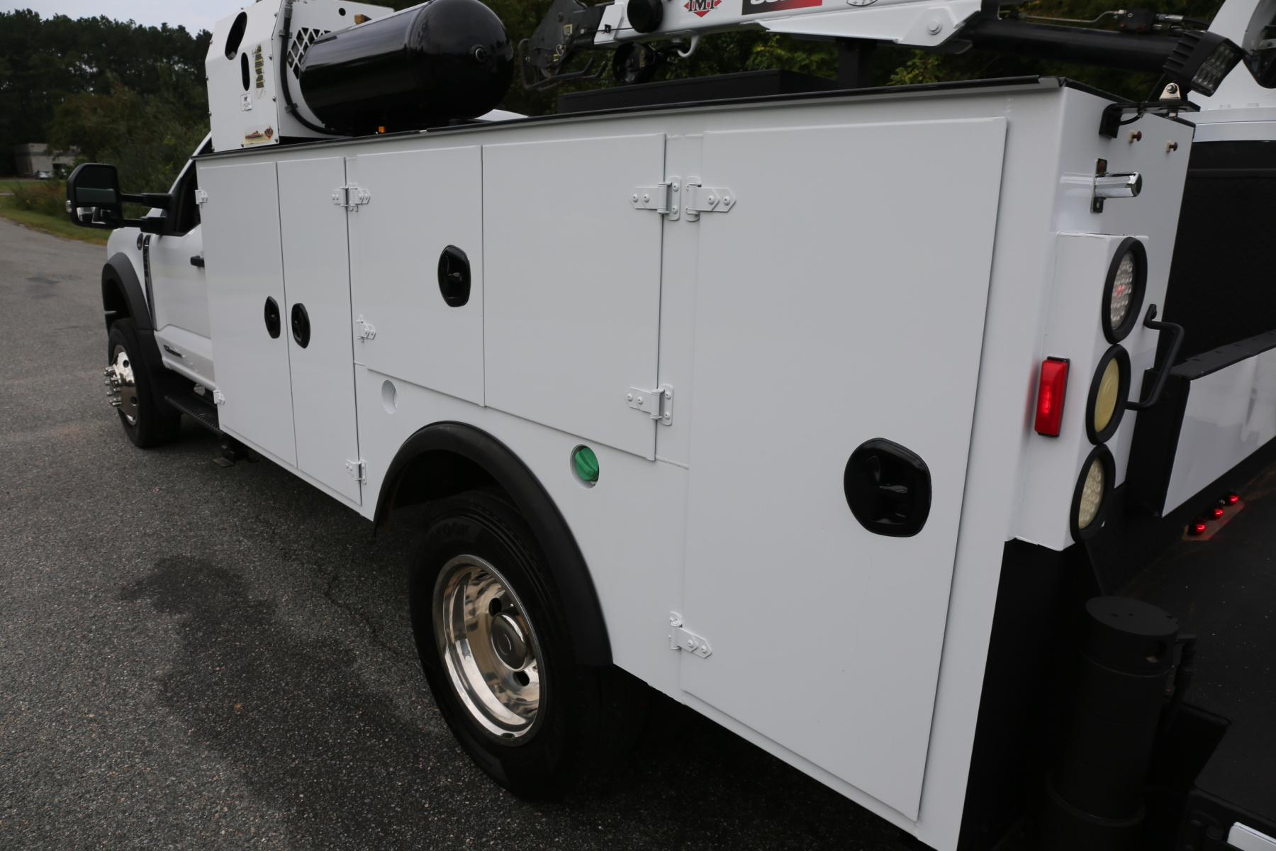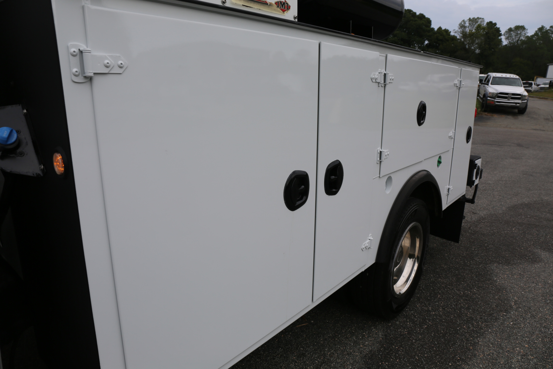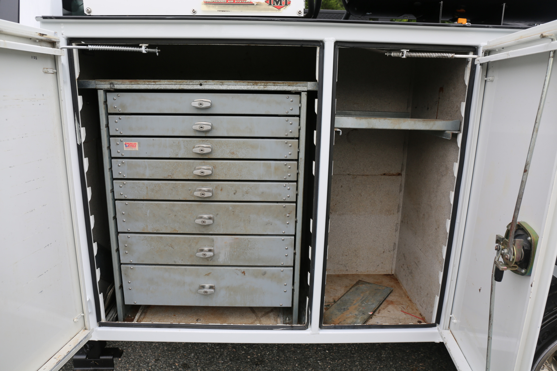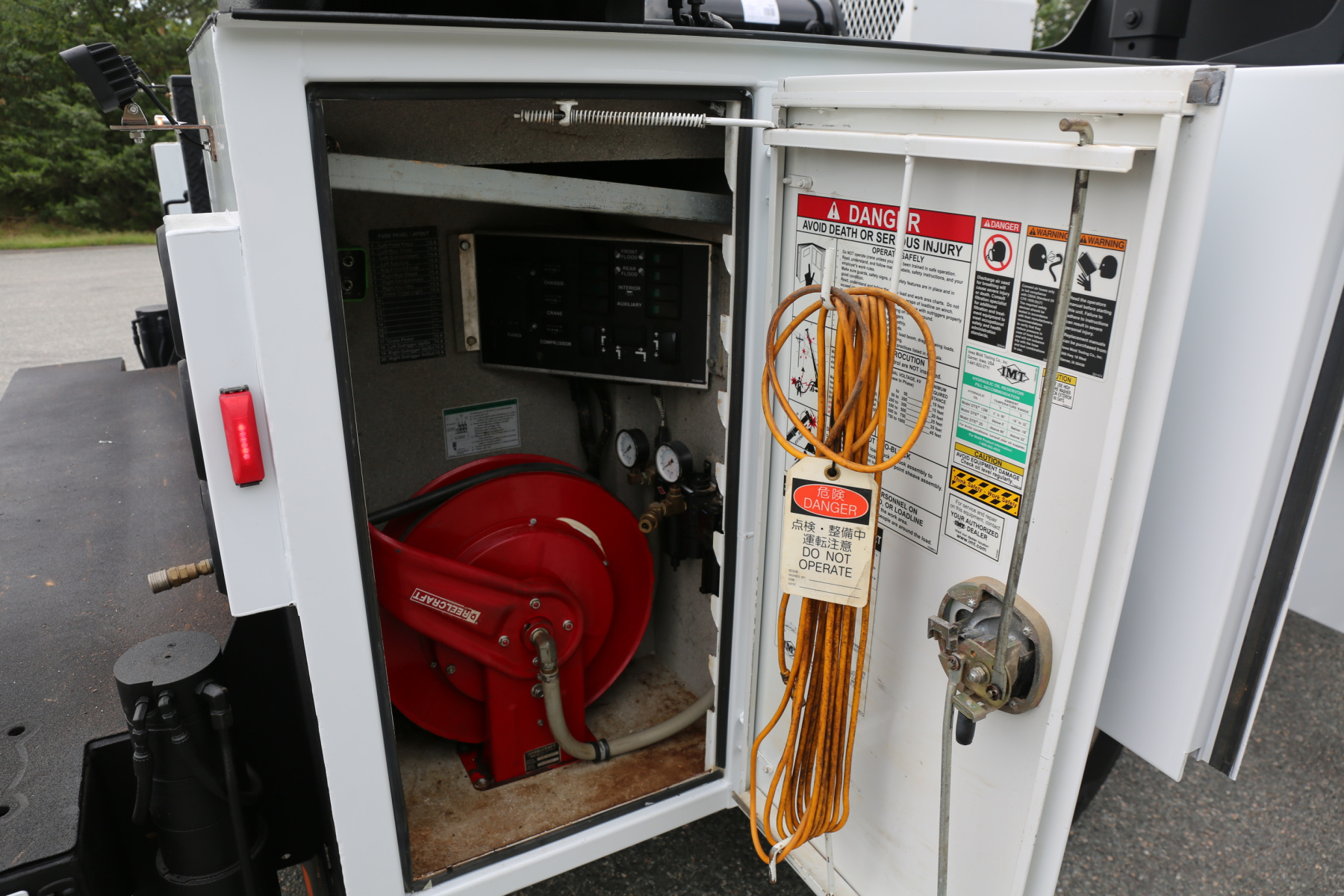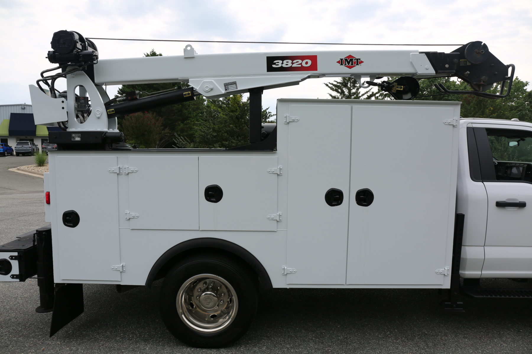 Equipped with an IMT Dominator 11′ service body, a 7500# capacity 21′ IMT crane (run off a wireless remote), hydraulic outriggers, and a hydraulic compressor. All of the equipment works as it should. No rust in the bed.