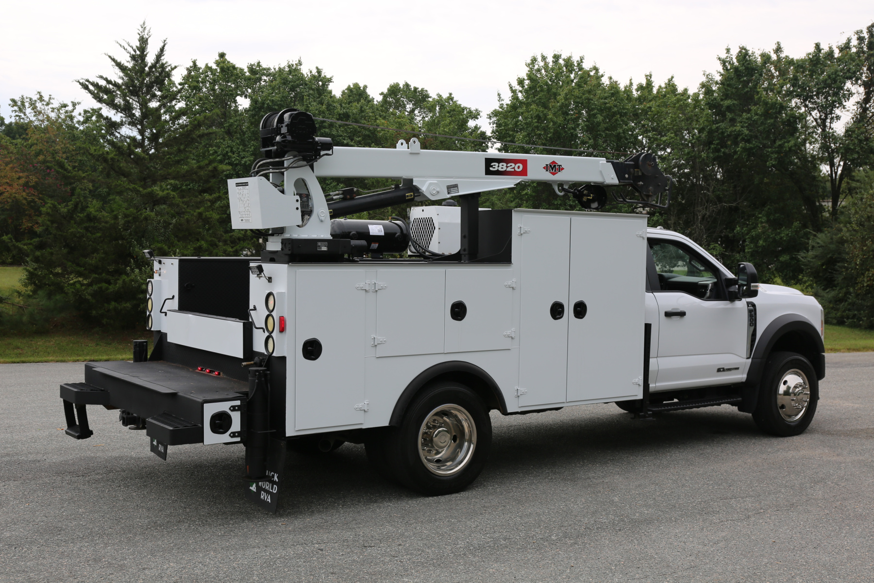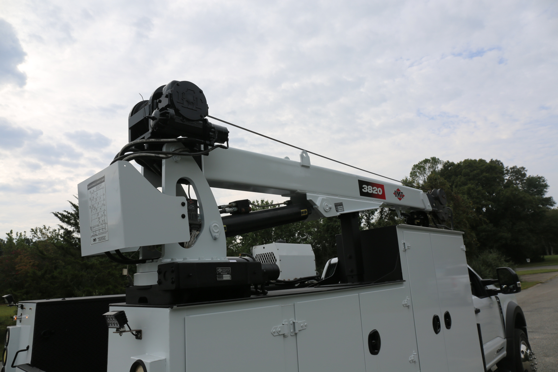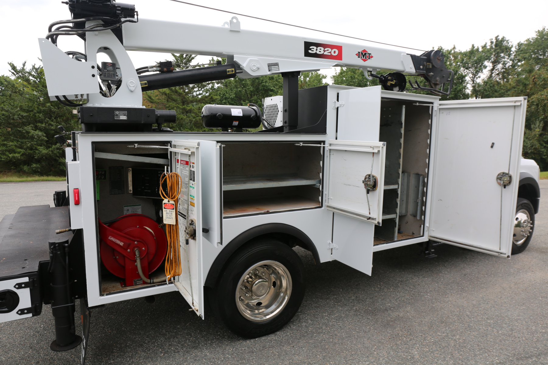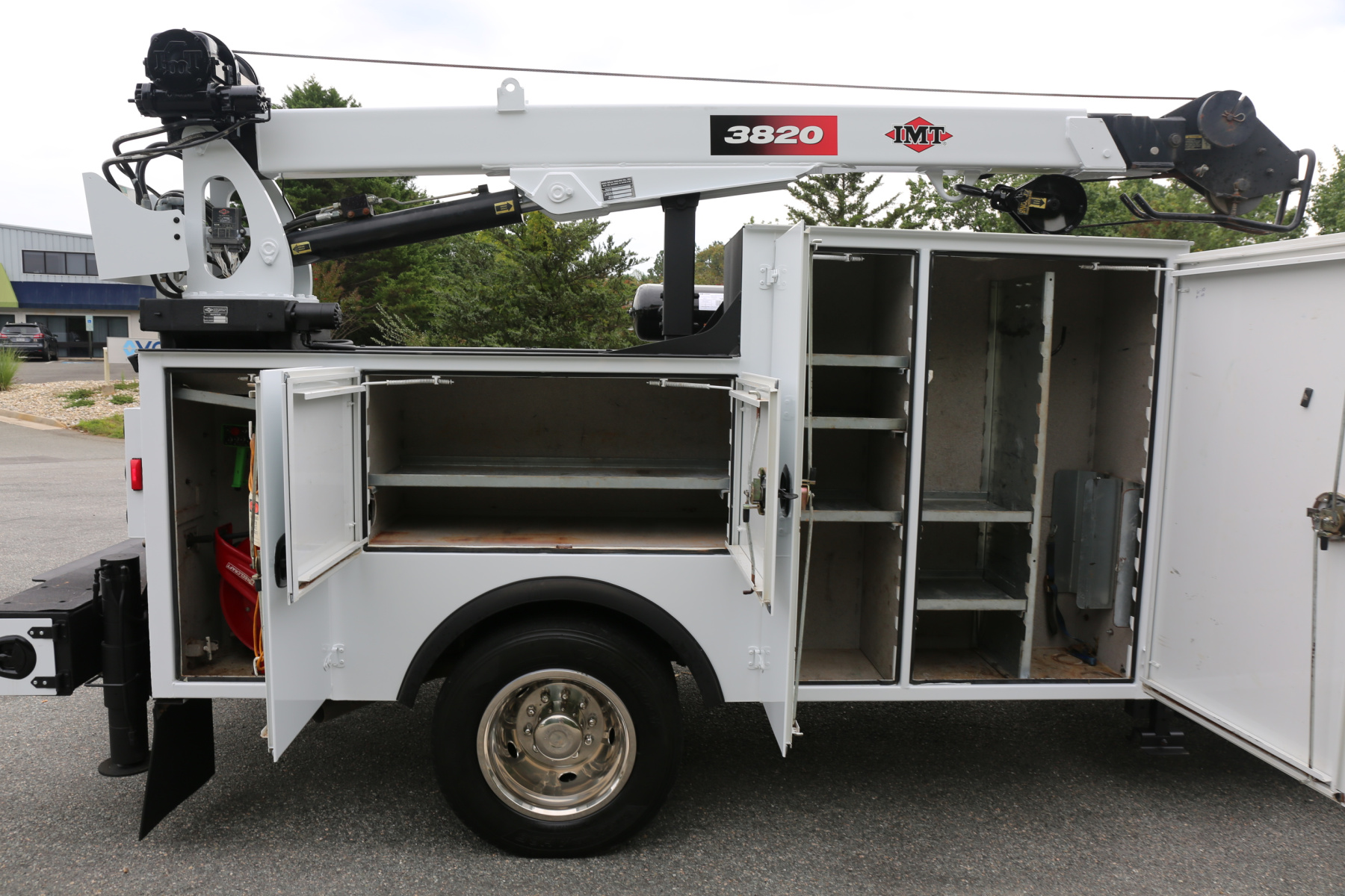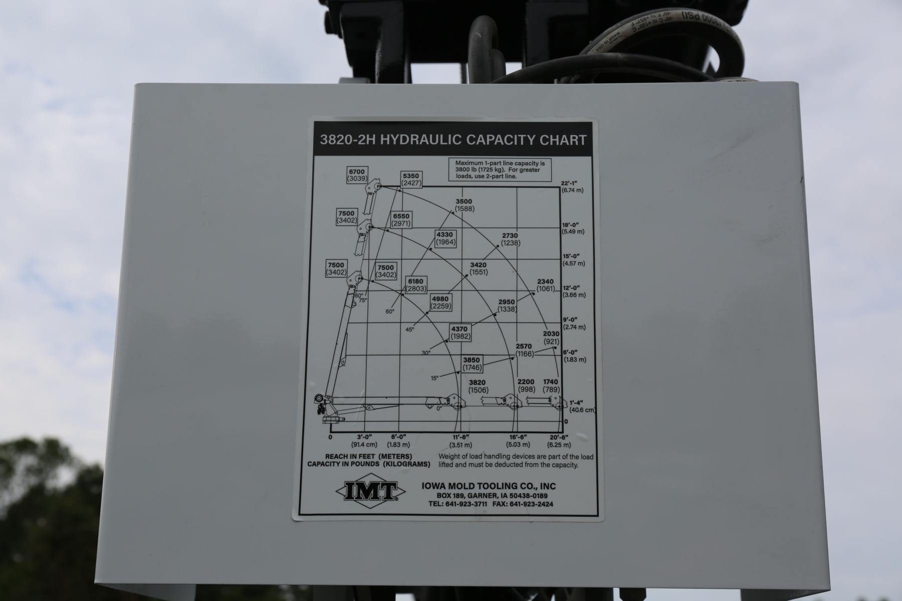 The crane is an IMT 3820 model, with a 7500# maximum lifting capacity and a 20′ two stage hydraulic extension. Run off a factory wireless remote.