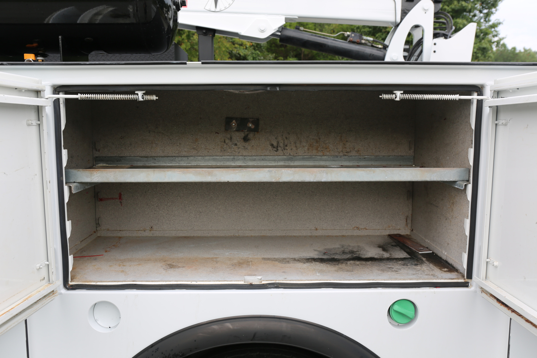 The crane compartment houses your air hose reel, bed control panel (for the body lighting), and outrigger controls. One shelf over the passenger wheel well. Three shelves in the P2 compartment. Two shelves and torch bottle racks in the P1 compartment.