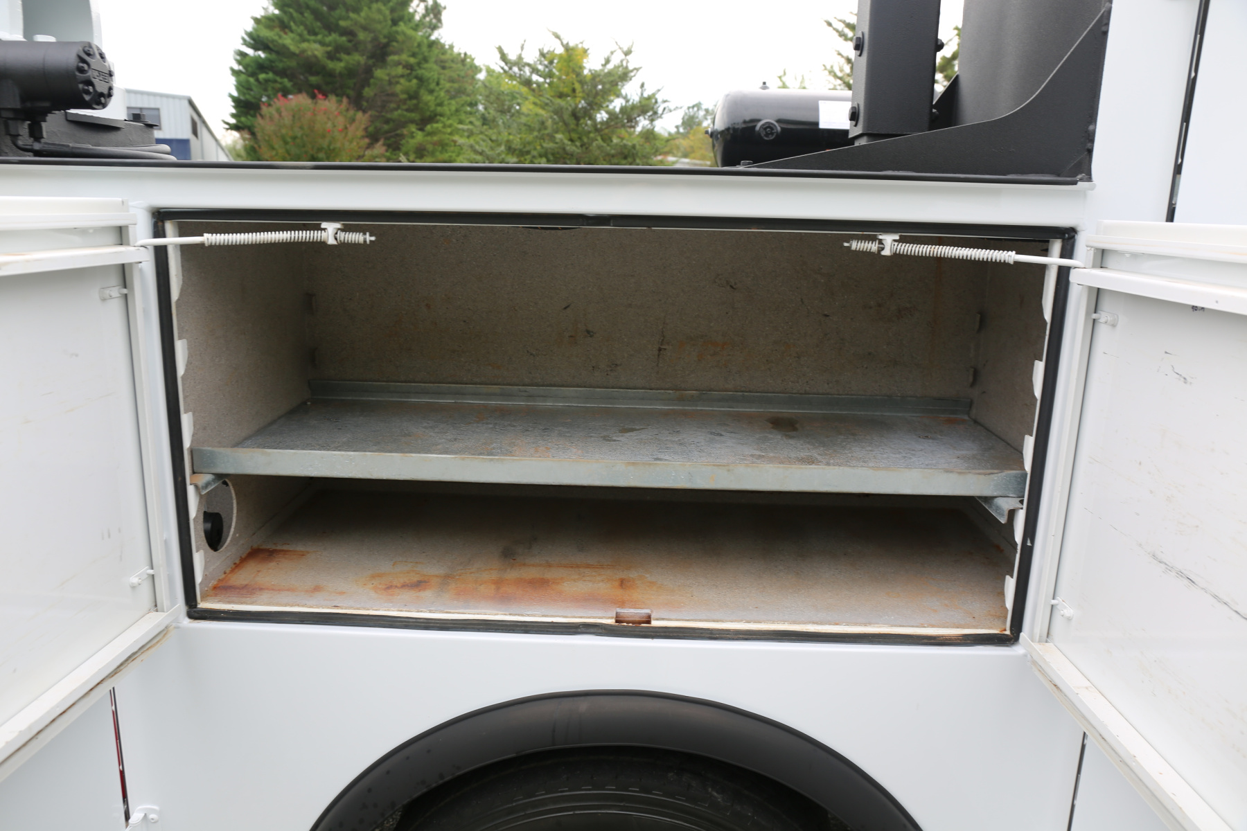 The bed was refurbished and remounted here, and originally came out of South Carolina. The exterior has been sandblasted and repainted (no paintwork done to the inside of the compartments), with new bedliner applied on the bumper and inside of the bed. No rust in the body. Two exterior flood lights and interior compartment lighting throughout.