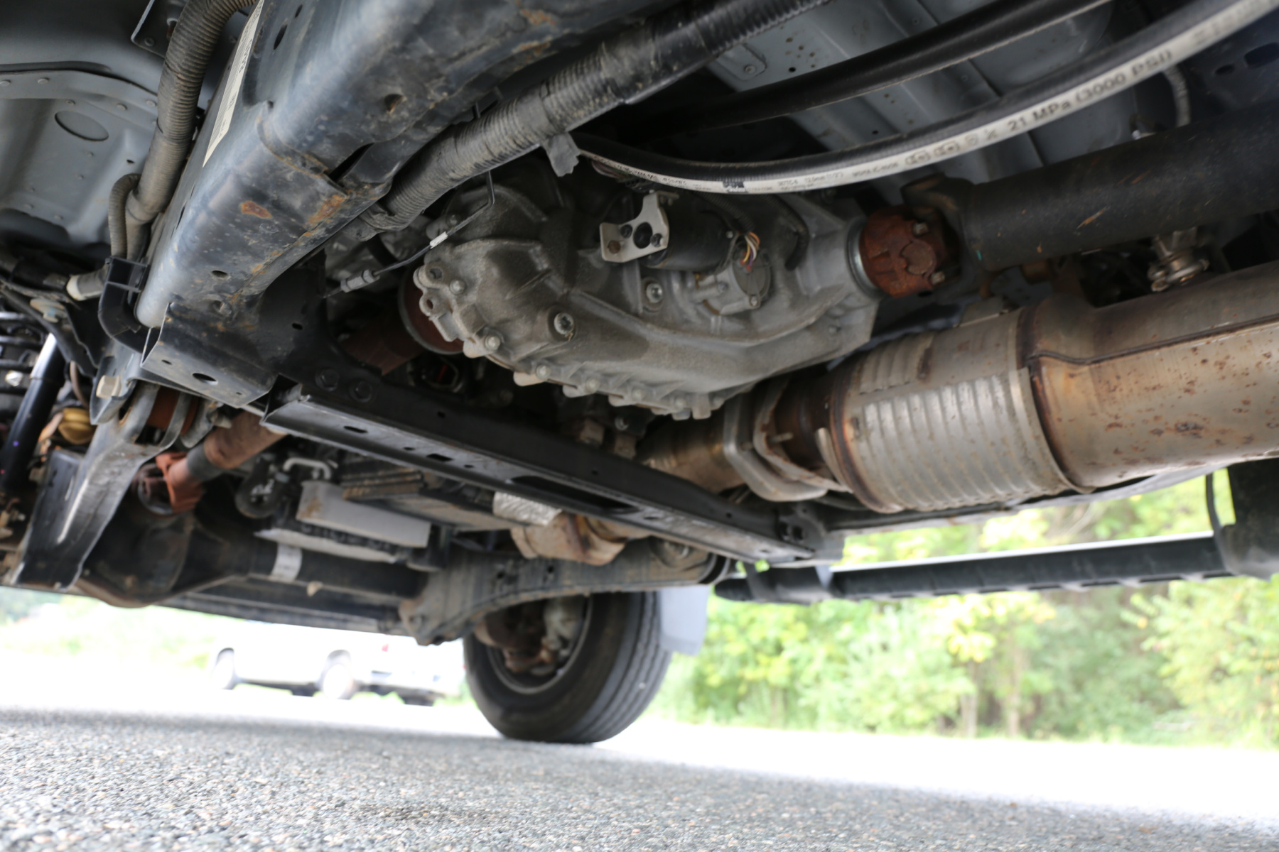 Work bench rear bumper with step, pass through storage bin underneath, hydraulic outriggers, and a tow hitch receiver.
