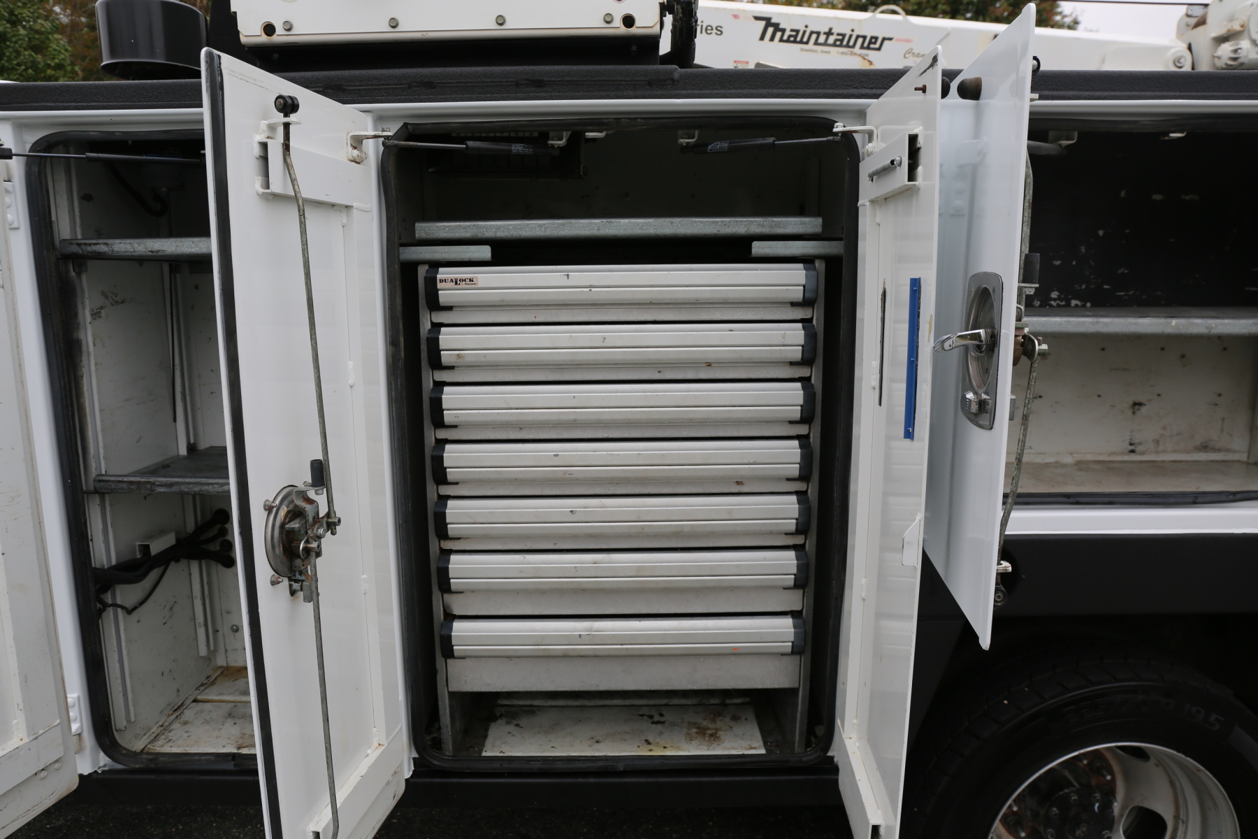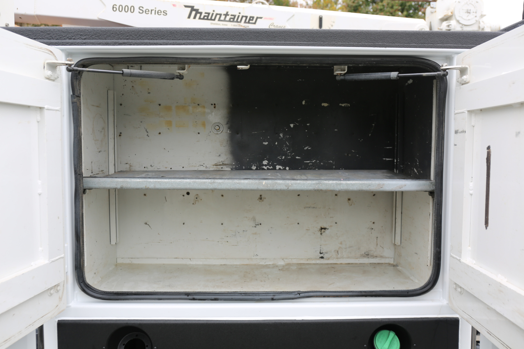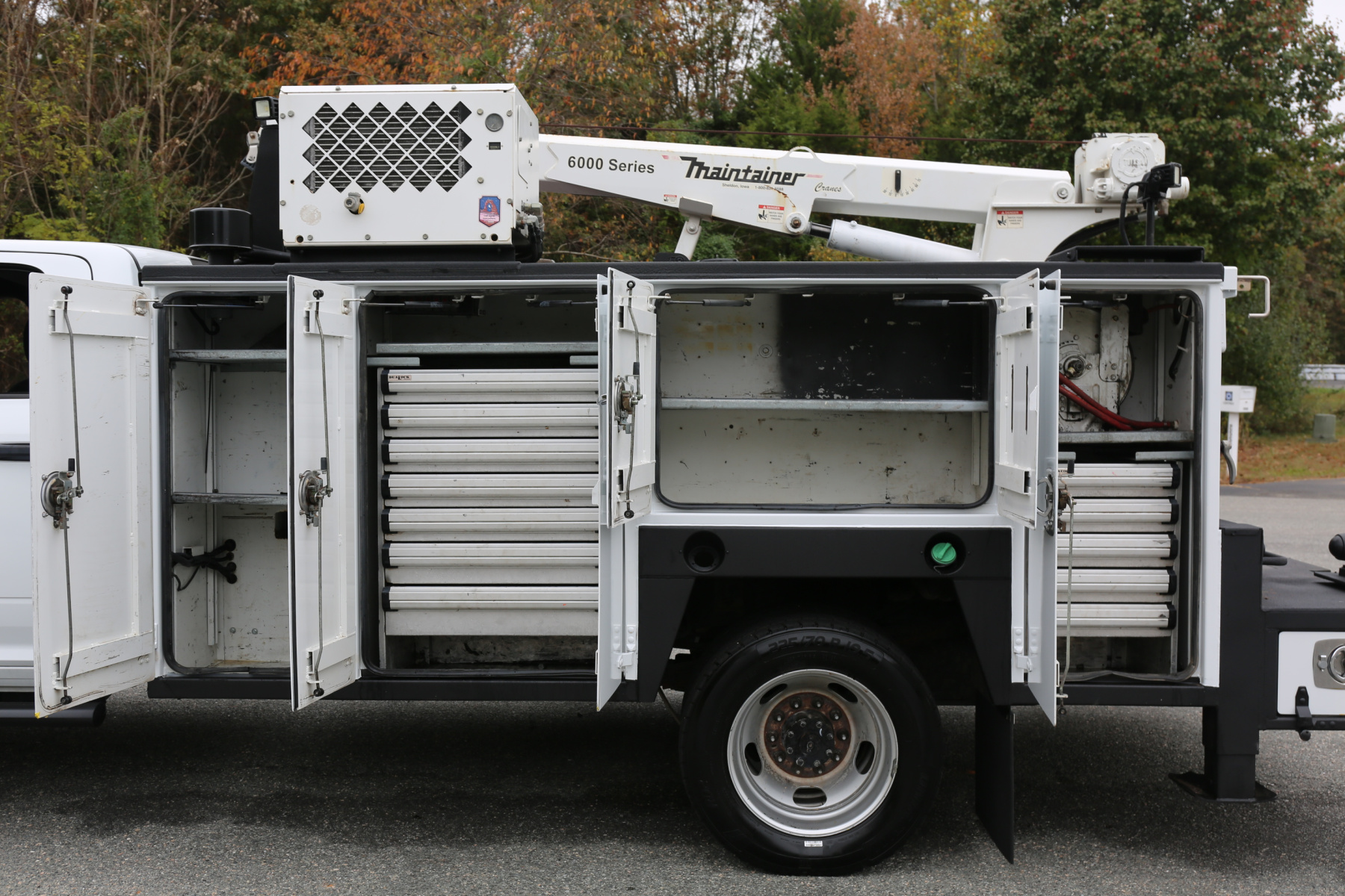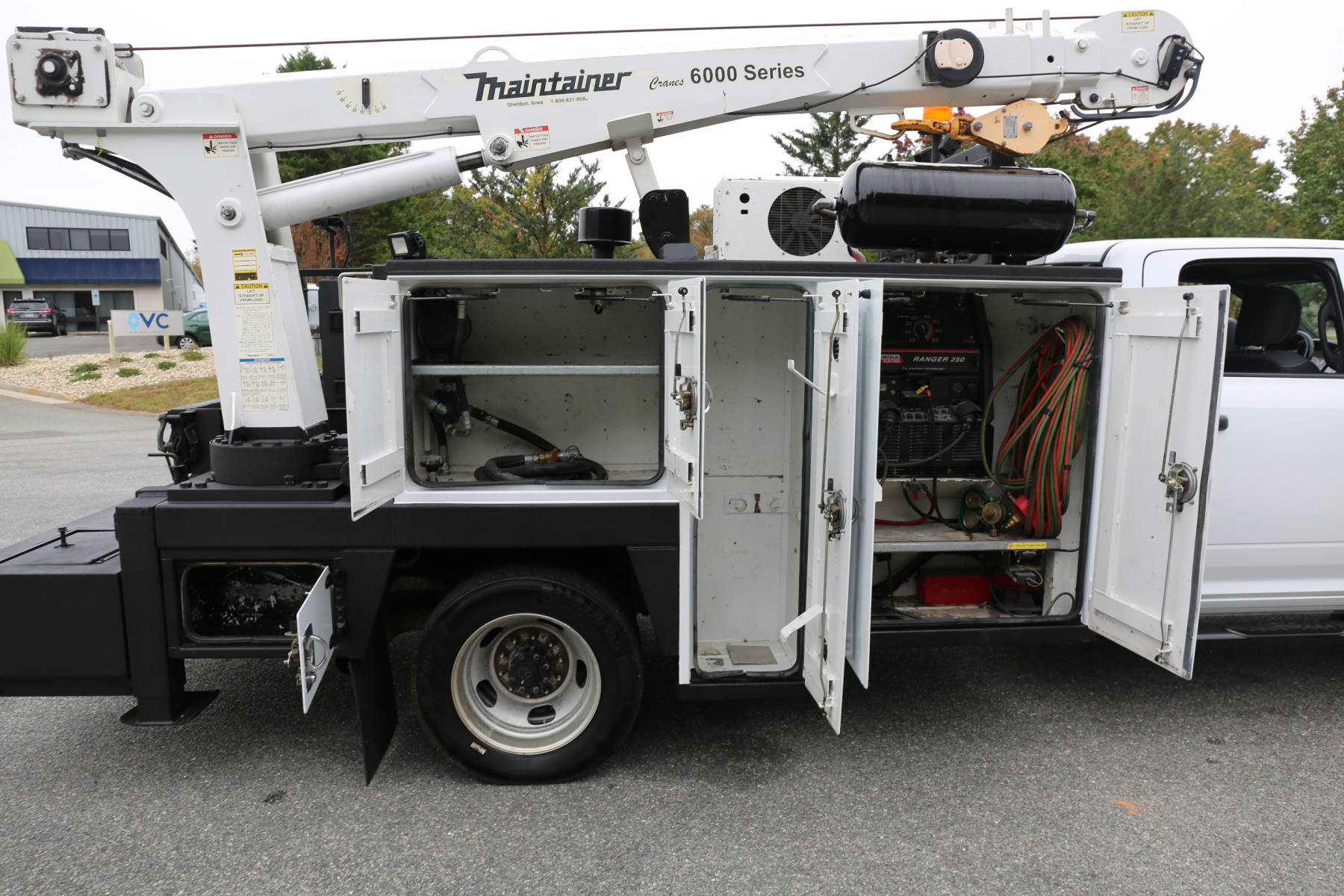 11′ Maintainer service body with 6000 Series crane, wireless remote, waste tank and diaphragm pump, hydraulic compressor, hydraulic outriggers, a Lincoln Ranger 250 welder, and two sets of drawers. Fully equipped truck.