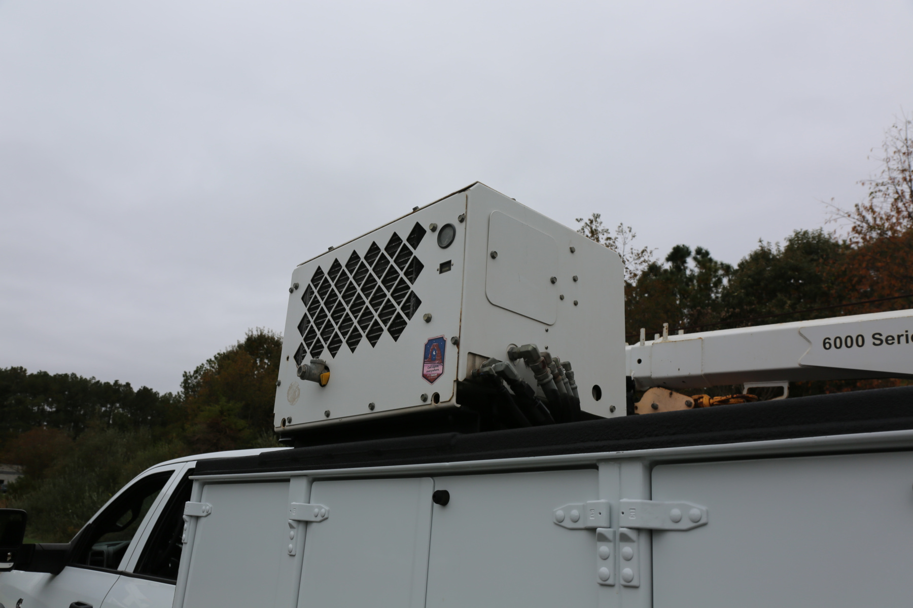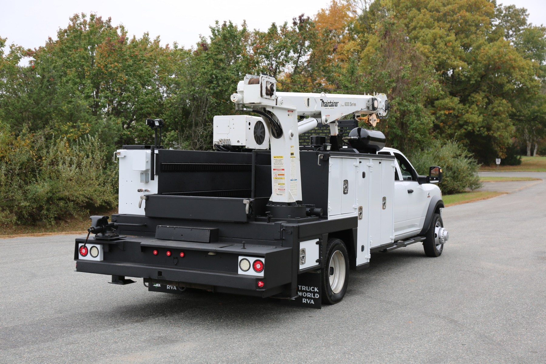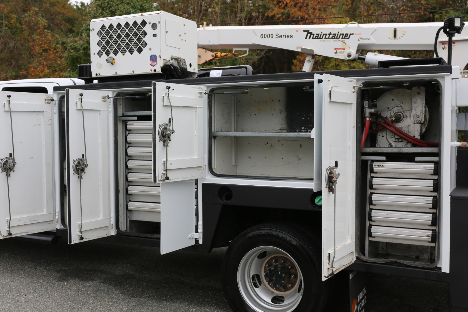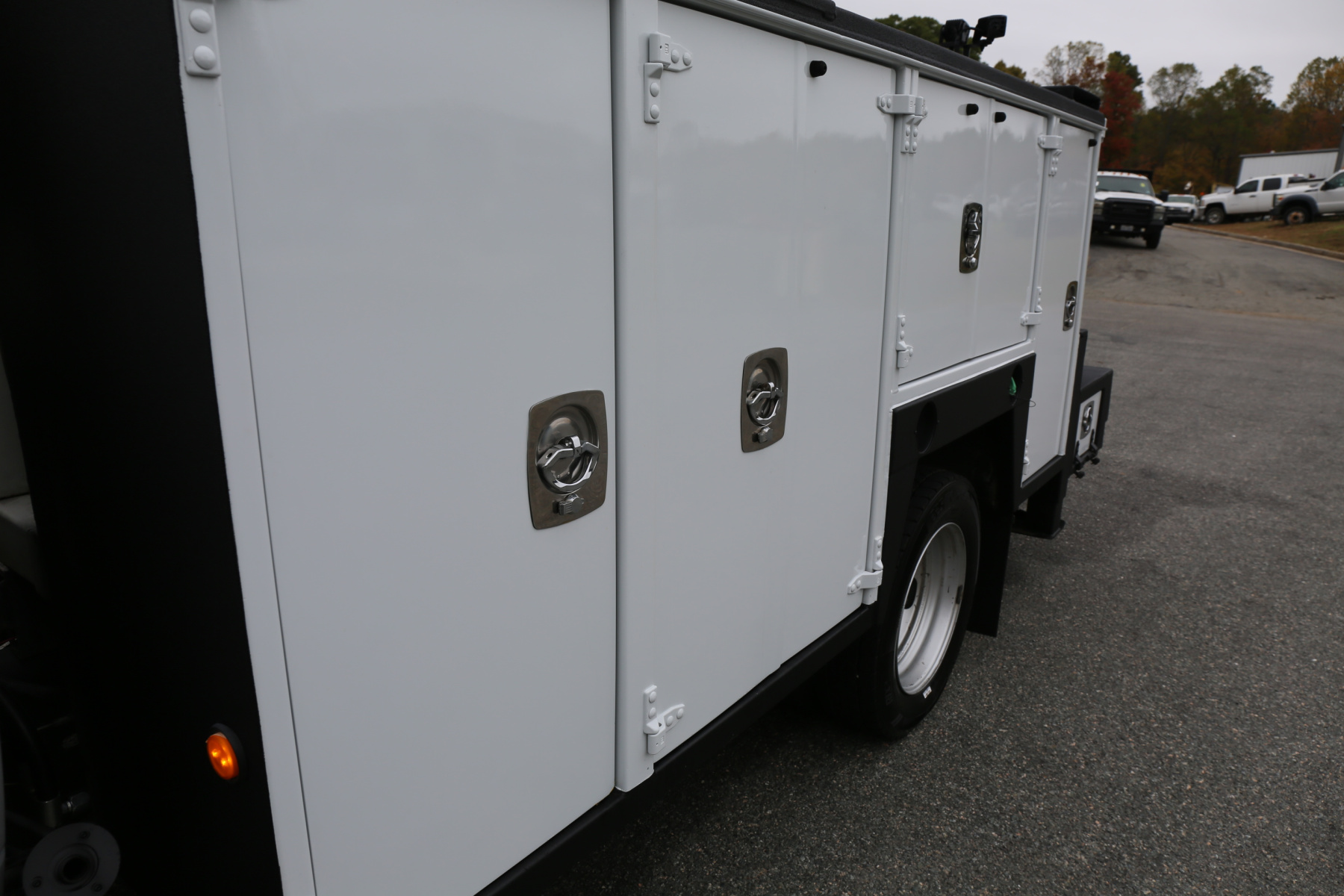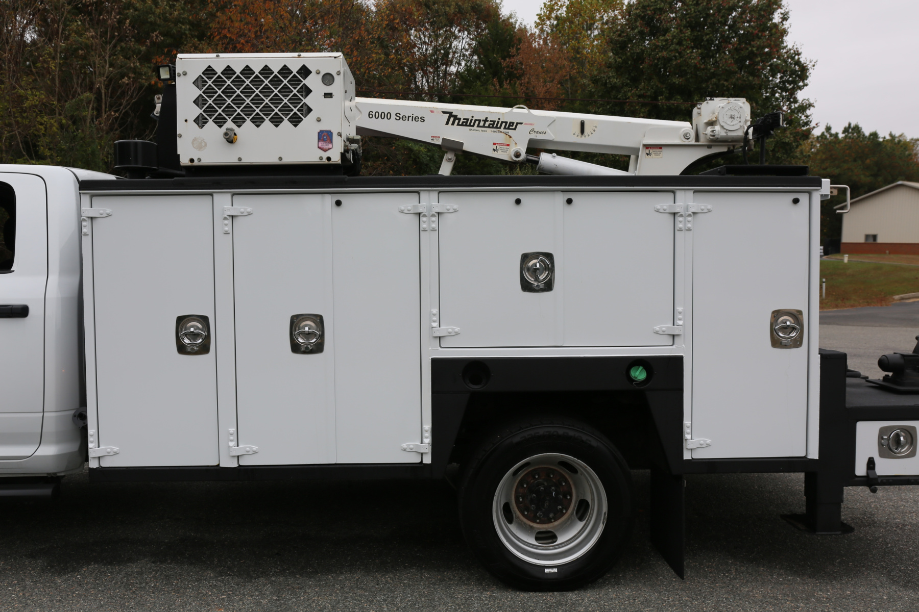 11′ Maintainer service body with 6000 Series crane, wireless remote, waste tank and diaphragm pump, hydraulic compressor, hydraulic outriggers, a Lincoln Ranger 250 welder, and two sets of drawers. Fully equipped truck.