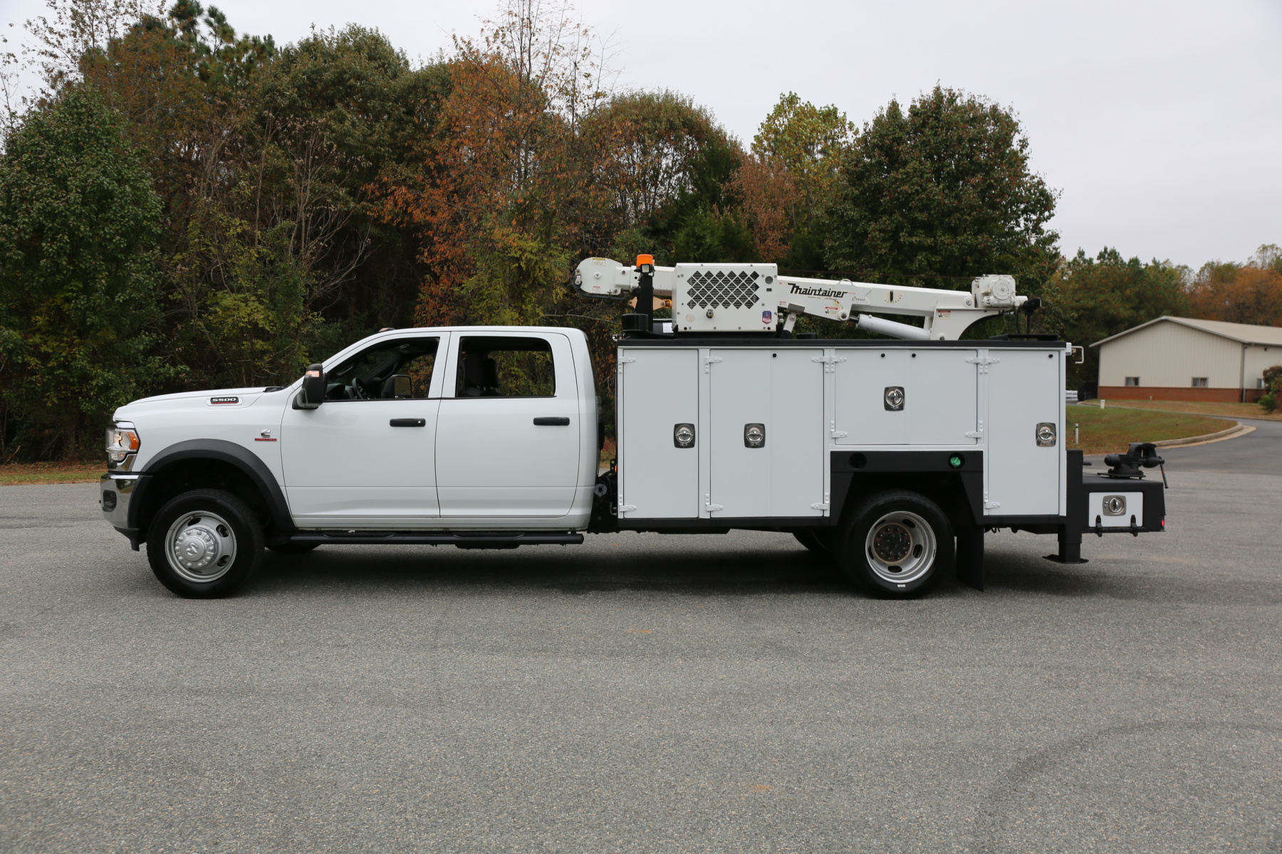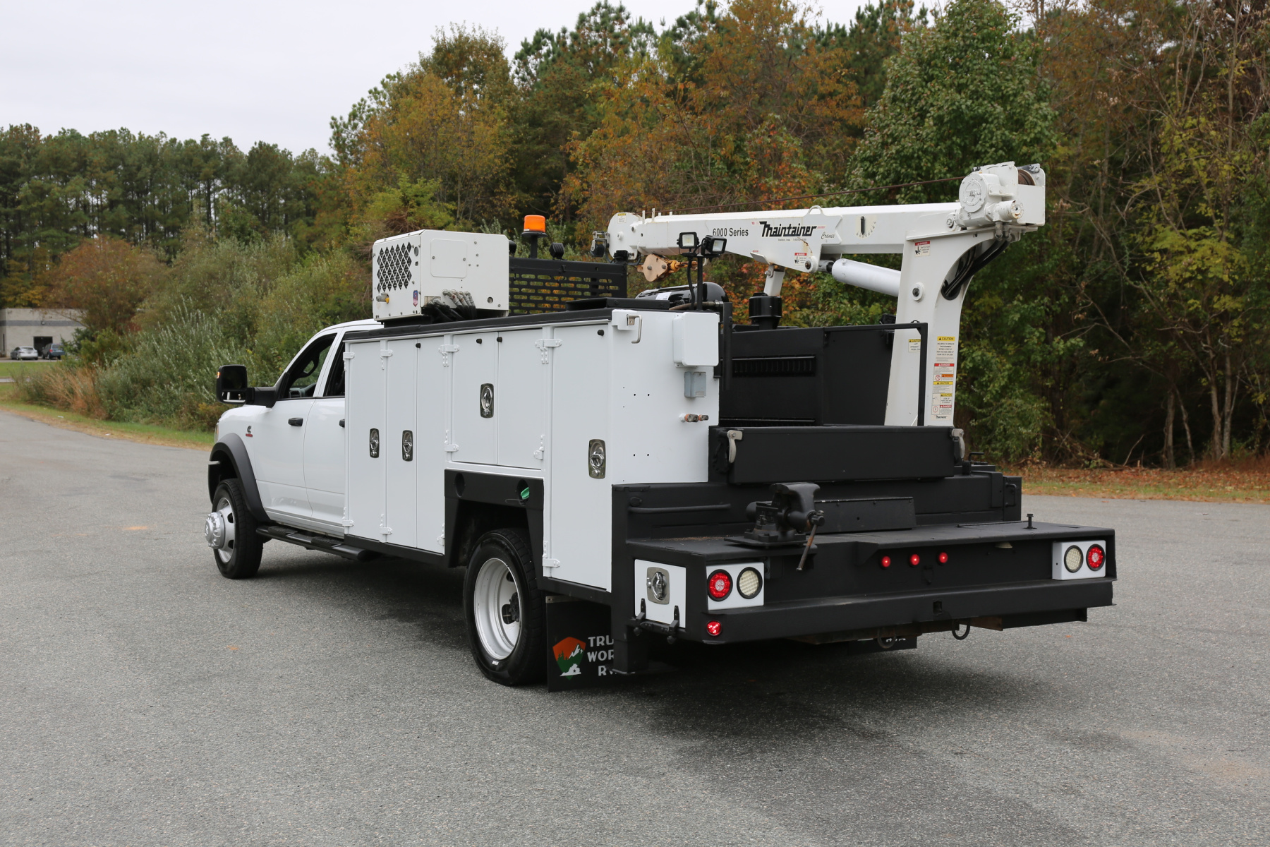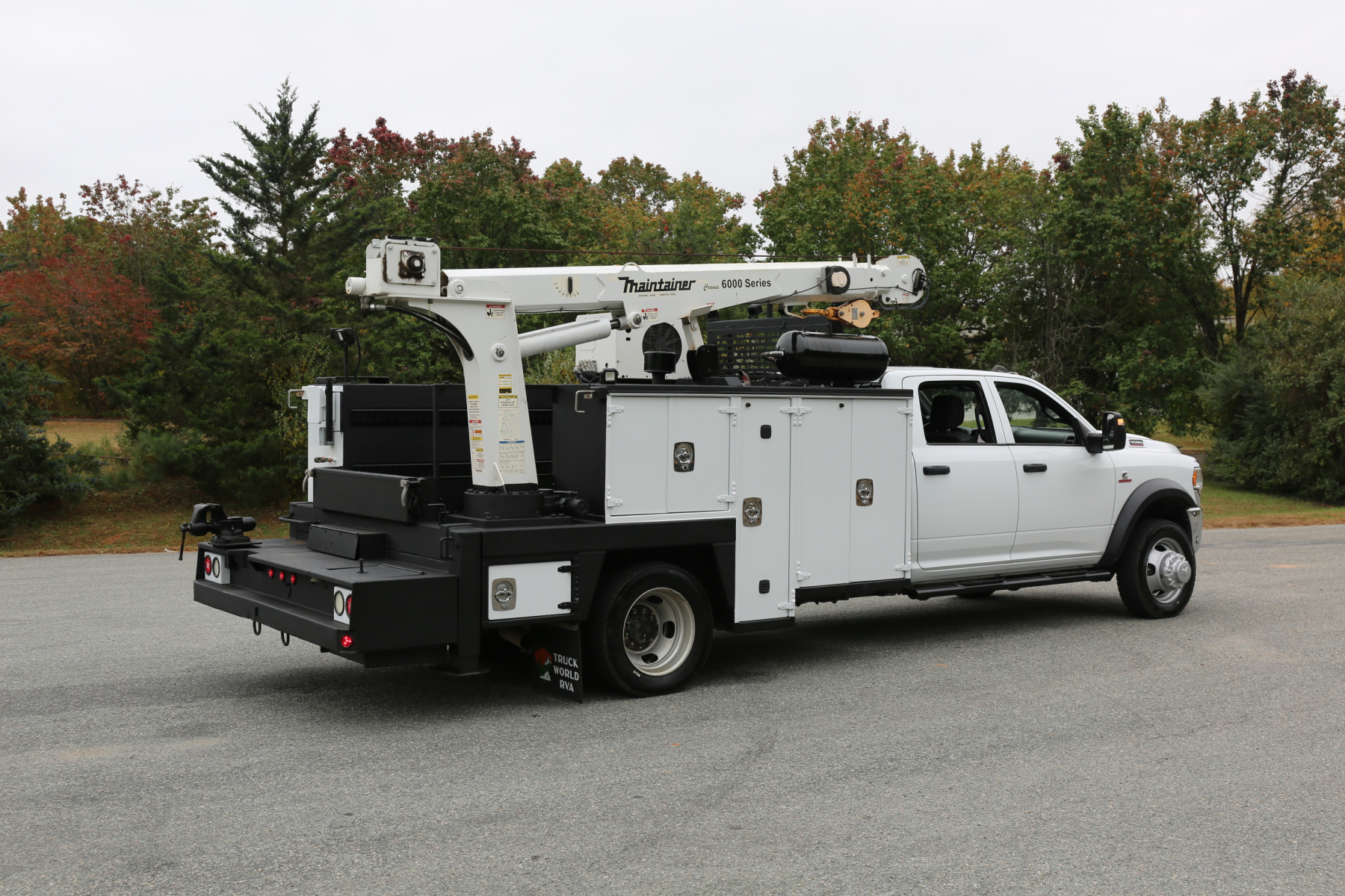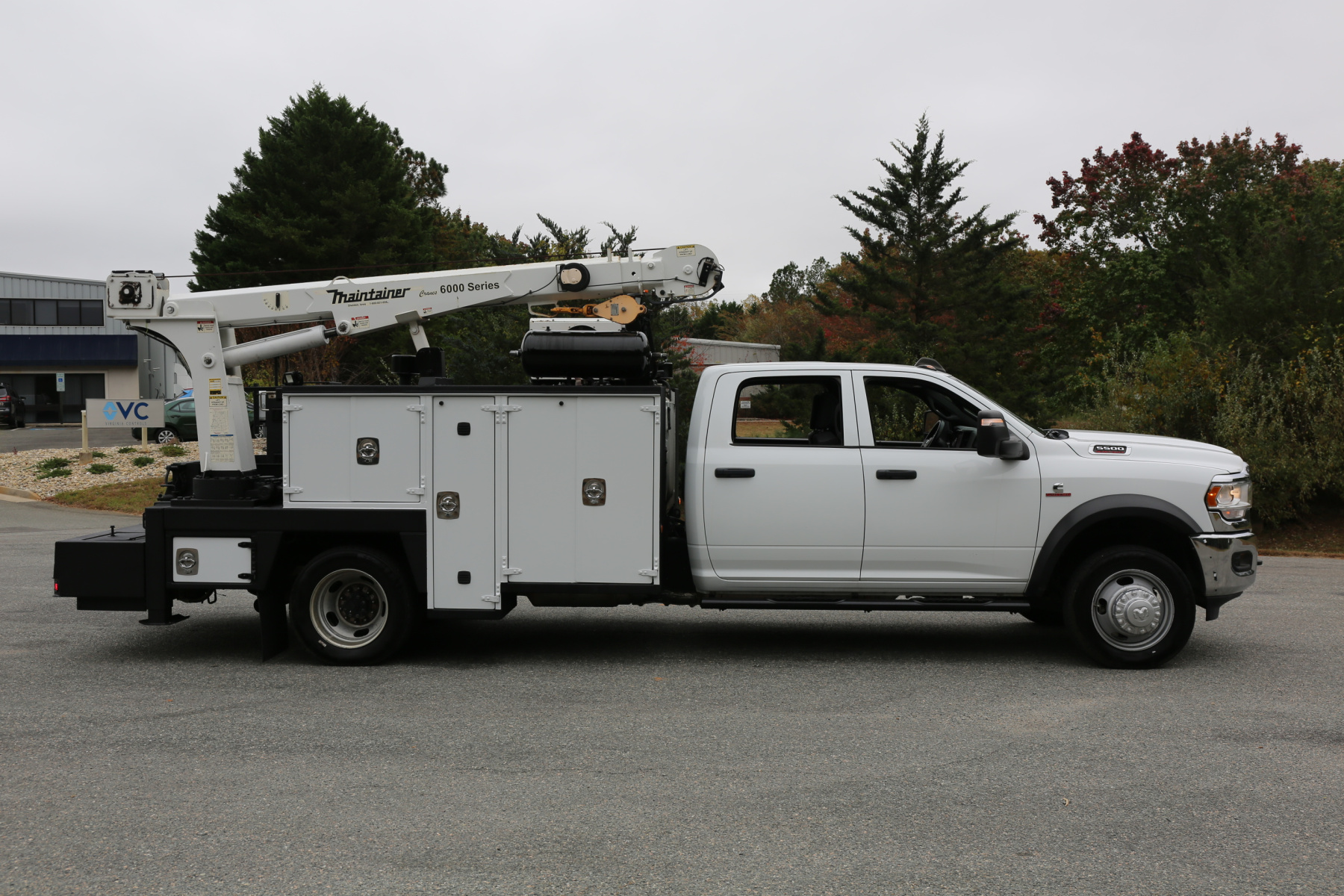 11′ Maintainer service body with 6000 Series crane, wireless remote, waste tank and diaphragm pump, hydraulic compressor, hydraulic outriggers, a Lincoln Ranger 250 welder, and two sets of drawers. Fully equipped truck.