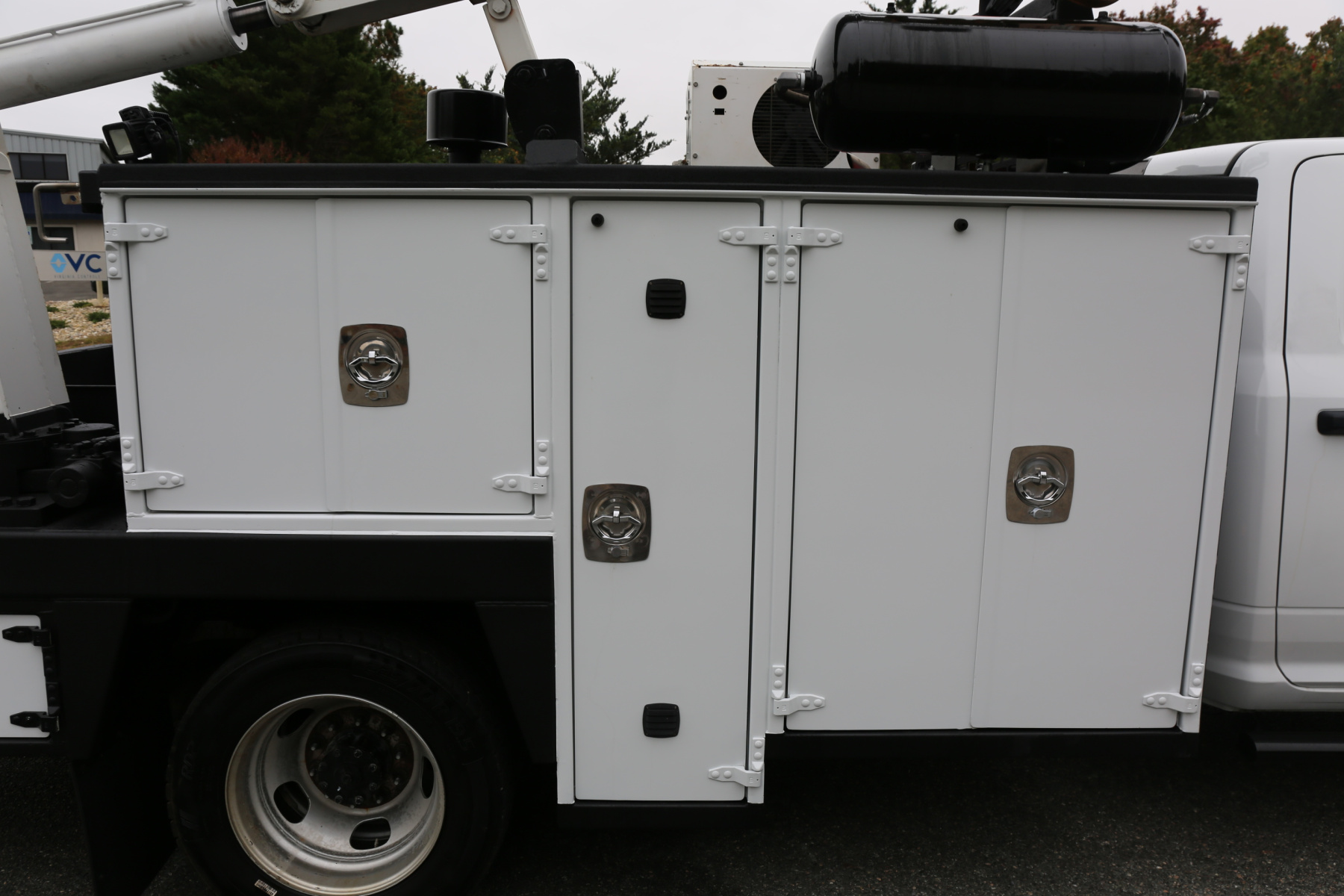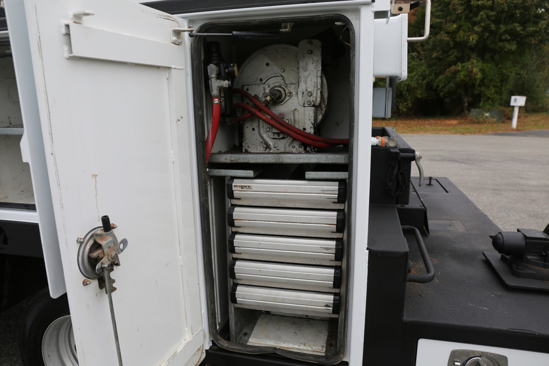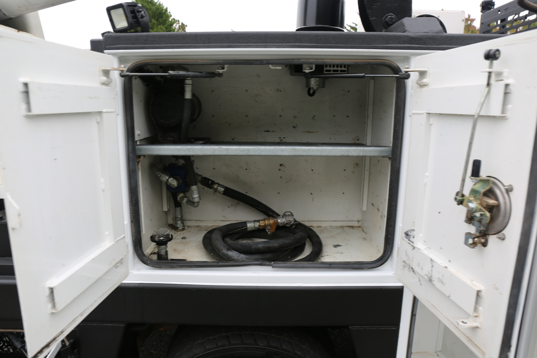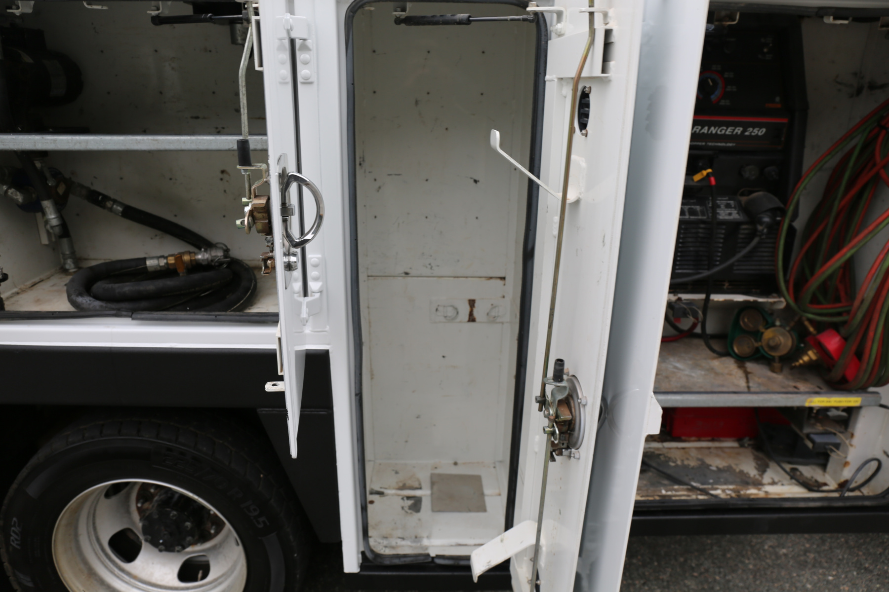 Work bench rear bumper with outrigger controls, and manual override controls for the crane. Working vise. Waste oil tank is located inside of the bumper. E track inside of the bed.