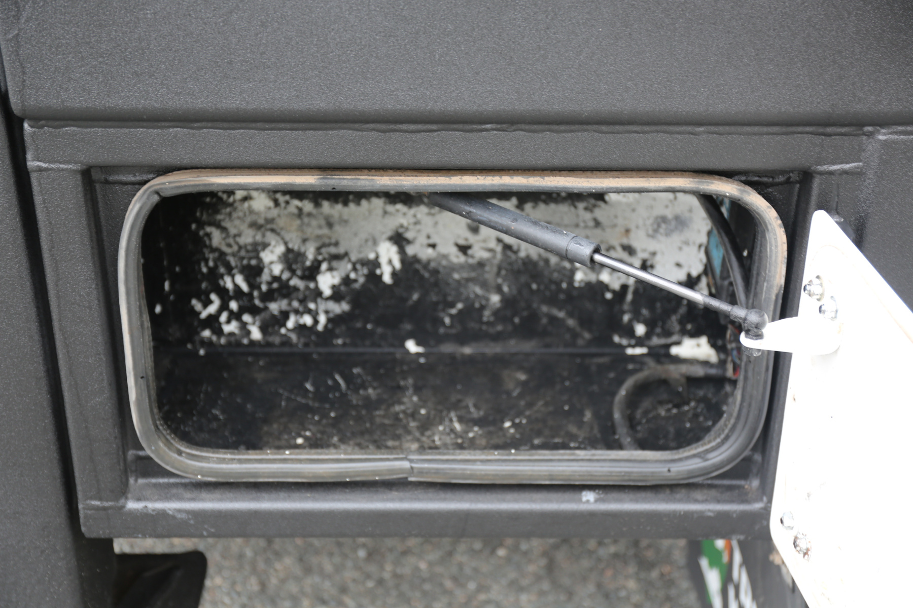 Small compartment under the crane for storing the wireless remote. One shelf over the passenger wheel well, with the diaphragm pump and suction hose for the waste tank. No shelves in the P2 compartment. The P1 compartment has a shelf, and the welder mounted through the body.