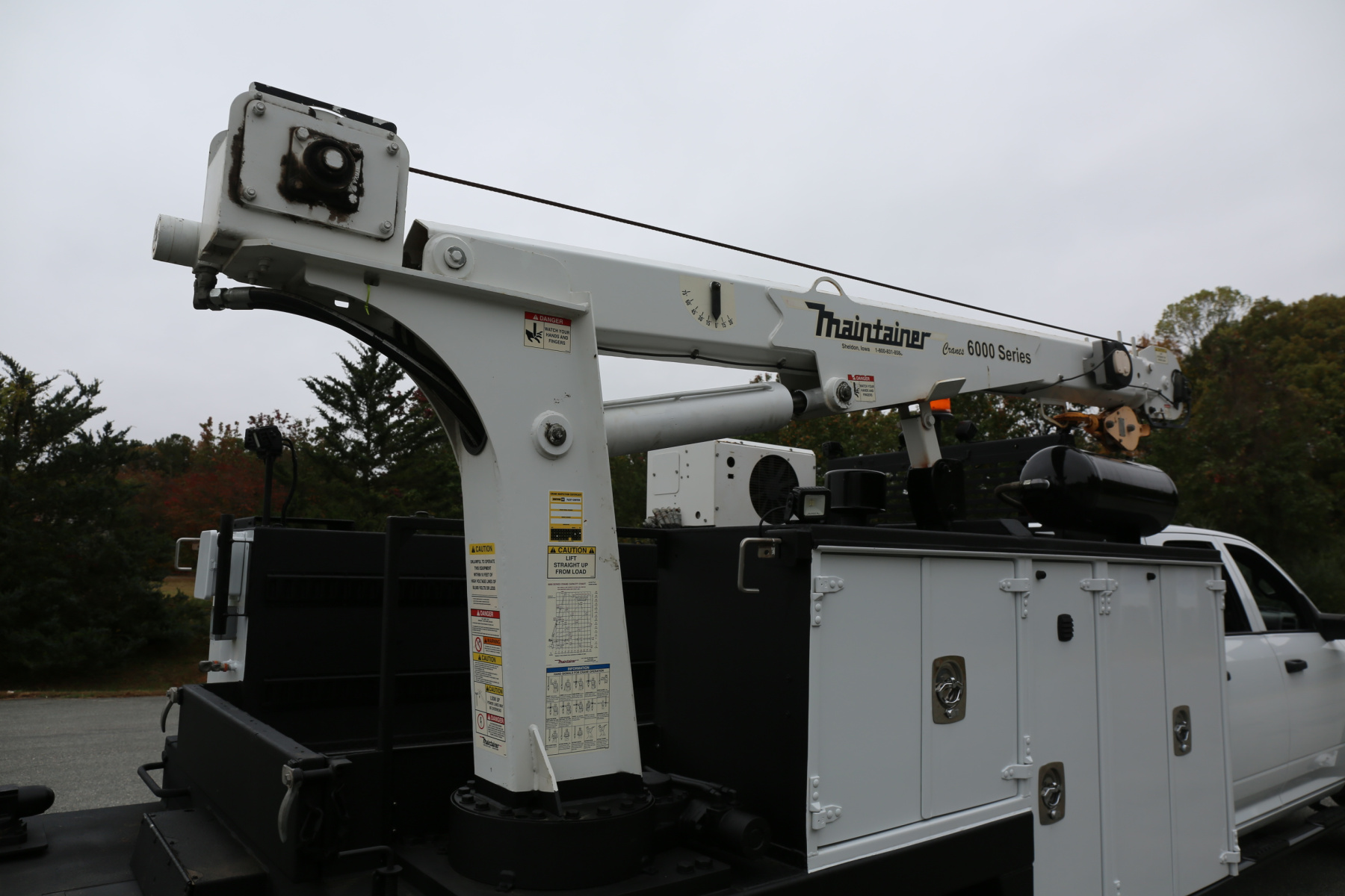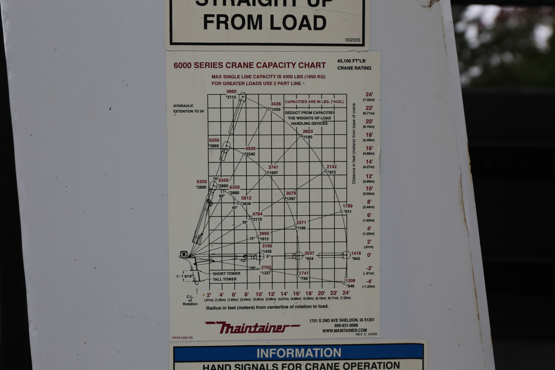 The crane is a Maintainer 6000 series, with a 6,000# maximum lifting capacity and a two stage extension out to 24′ of reach. Run off a factory wireless remote, works as it should.